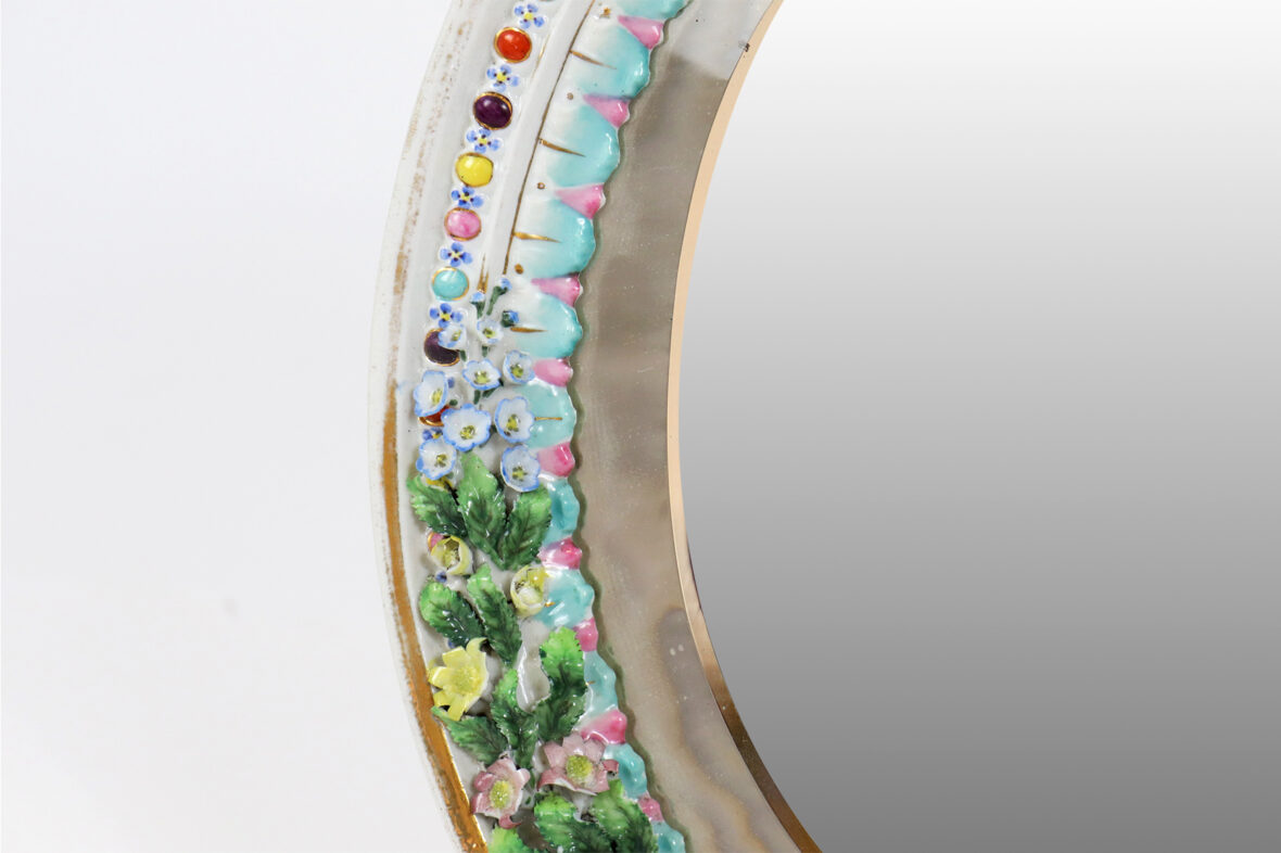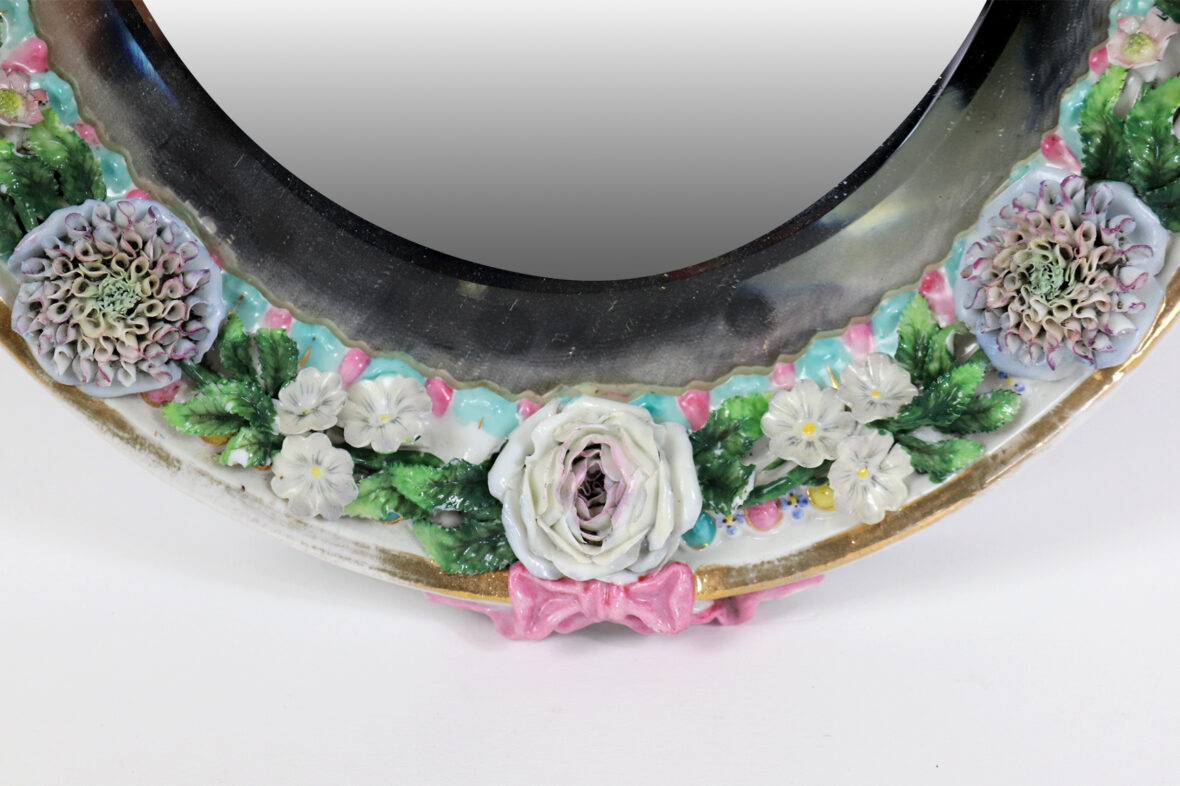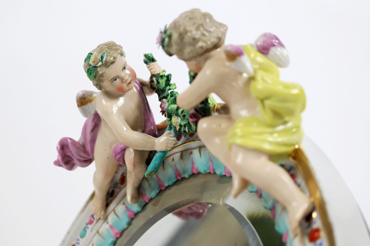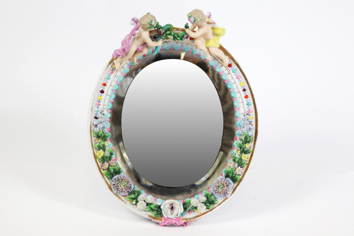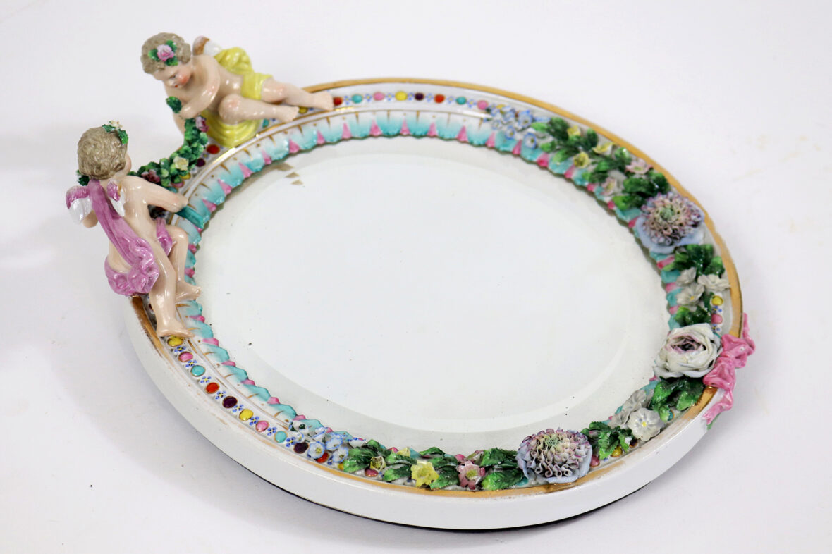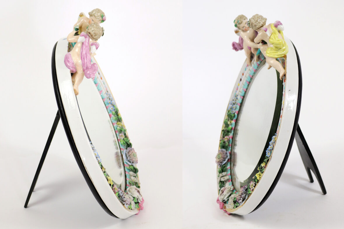 MIROIR ovale formant psyché en porcelaine à décor de putti et fleurettes. Glace biseautée et fond bois.