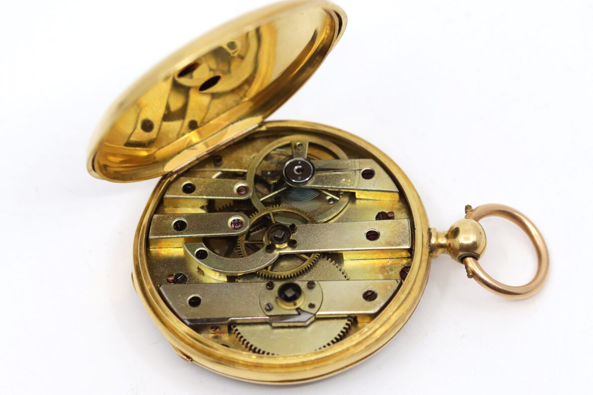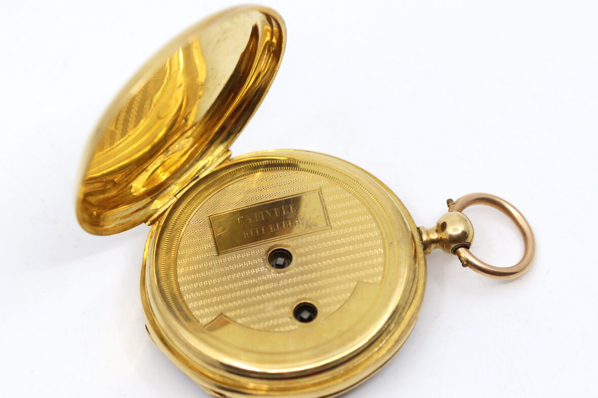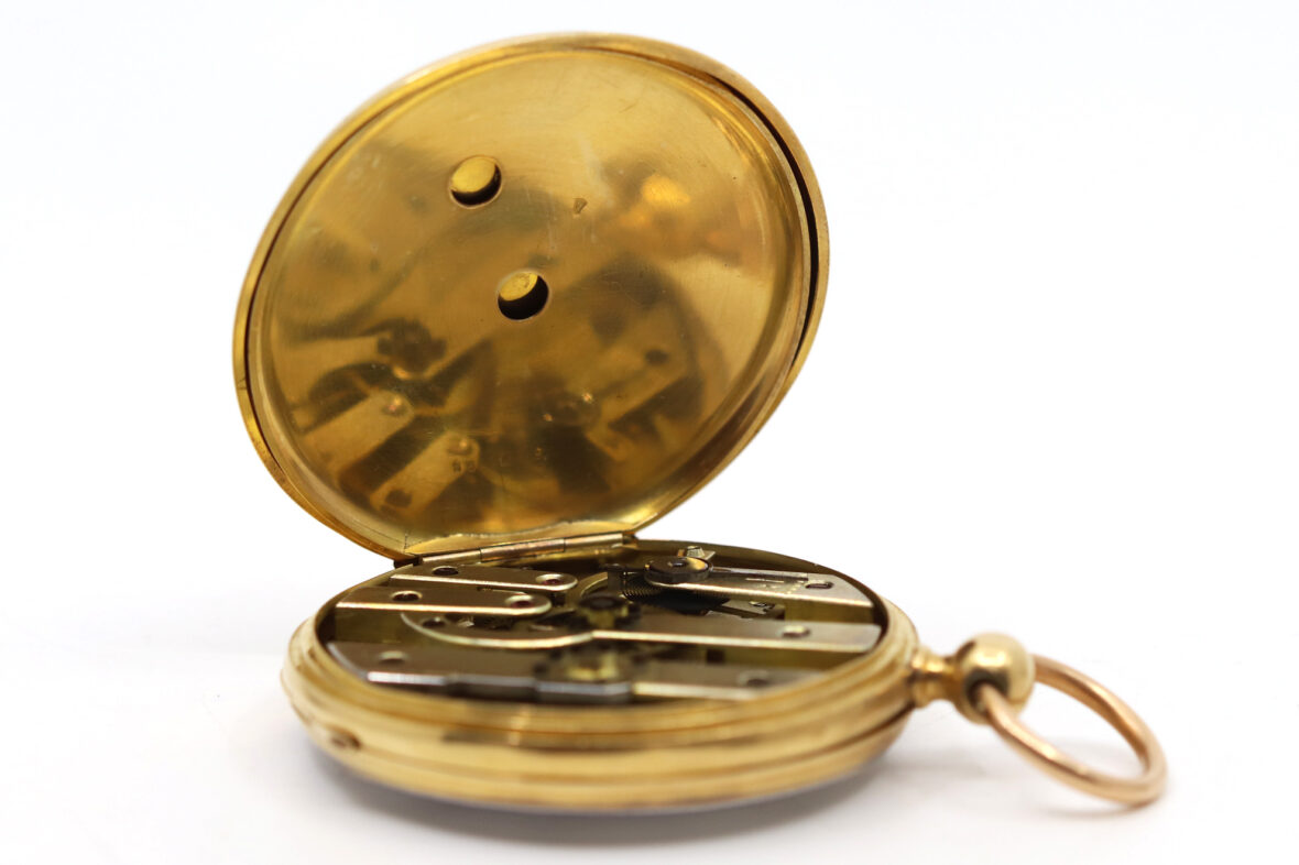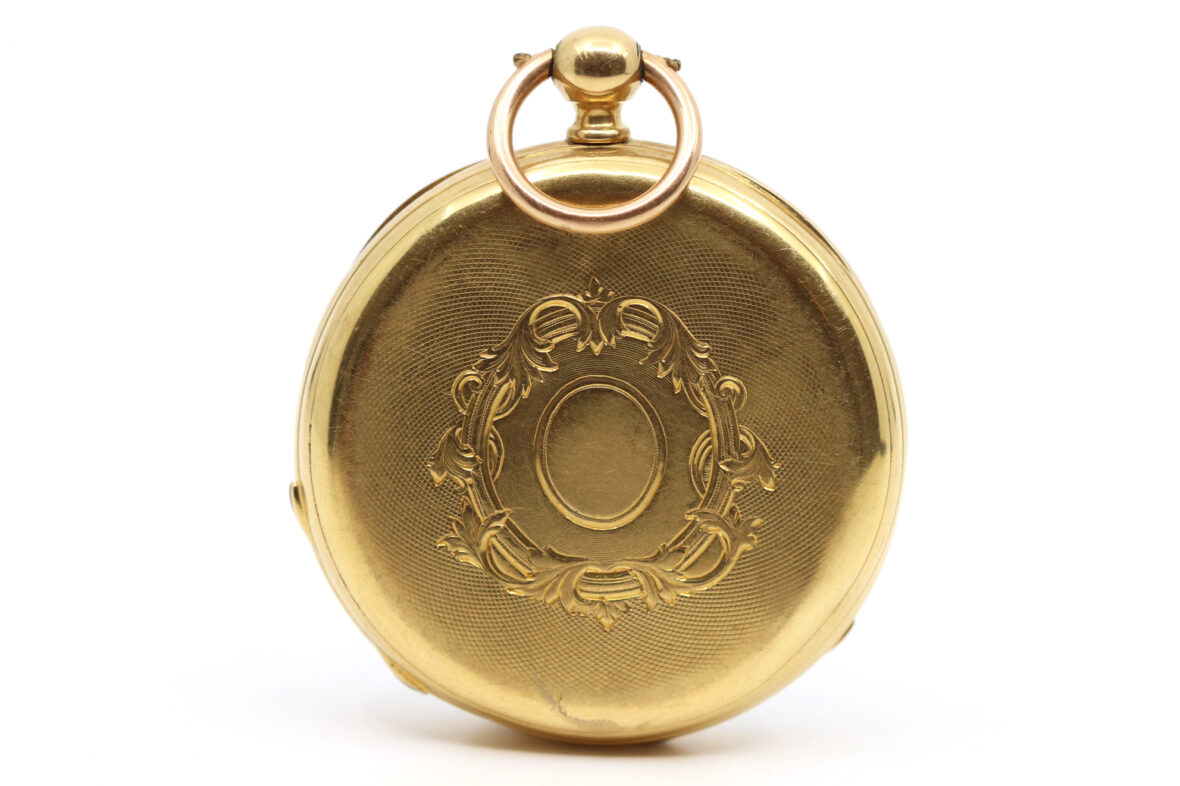 Montre à gousset en or jaune à décor ciselé d’un médaillon et d’une guirlande feuillagée. Cadran émaillé blanc à chiffres romains. Cuvette intérieure en or.