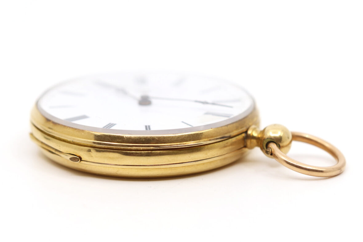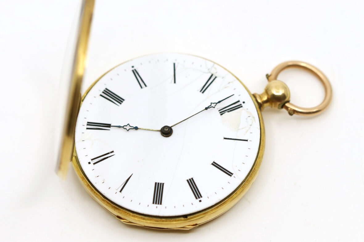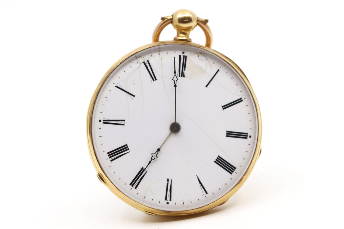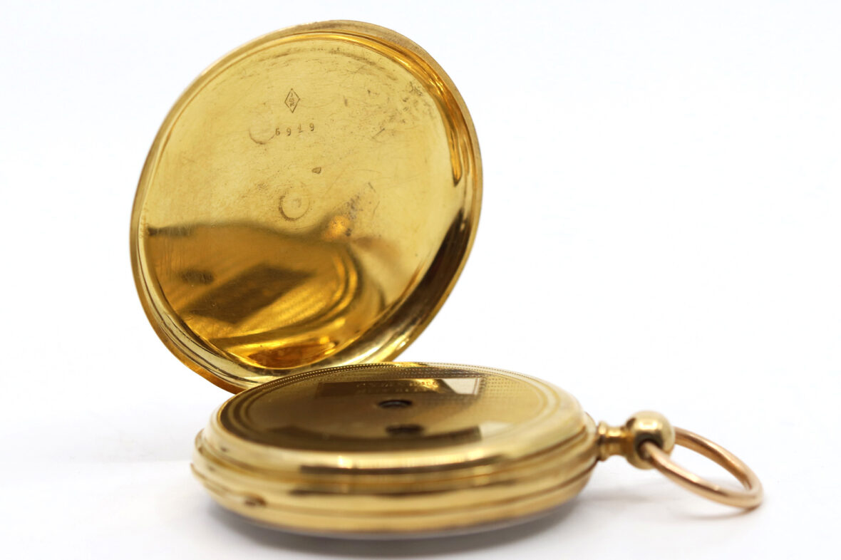 Montre à gousset en or jaune à décor ciselé d’un médaillon et d’une guirlande feuillagée. Cadran émaillé blanc à chiffres romains. Cuvette intérieure en or.