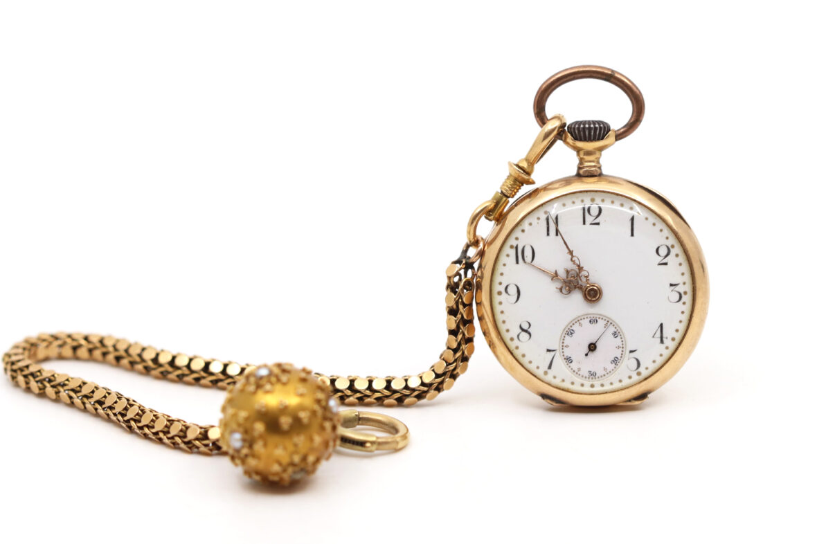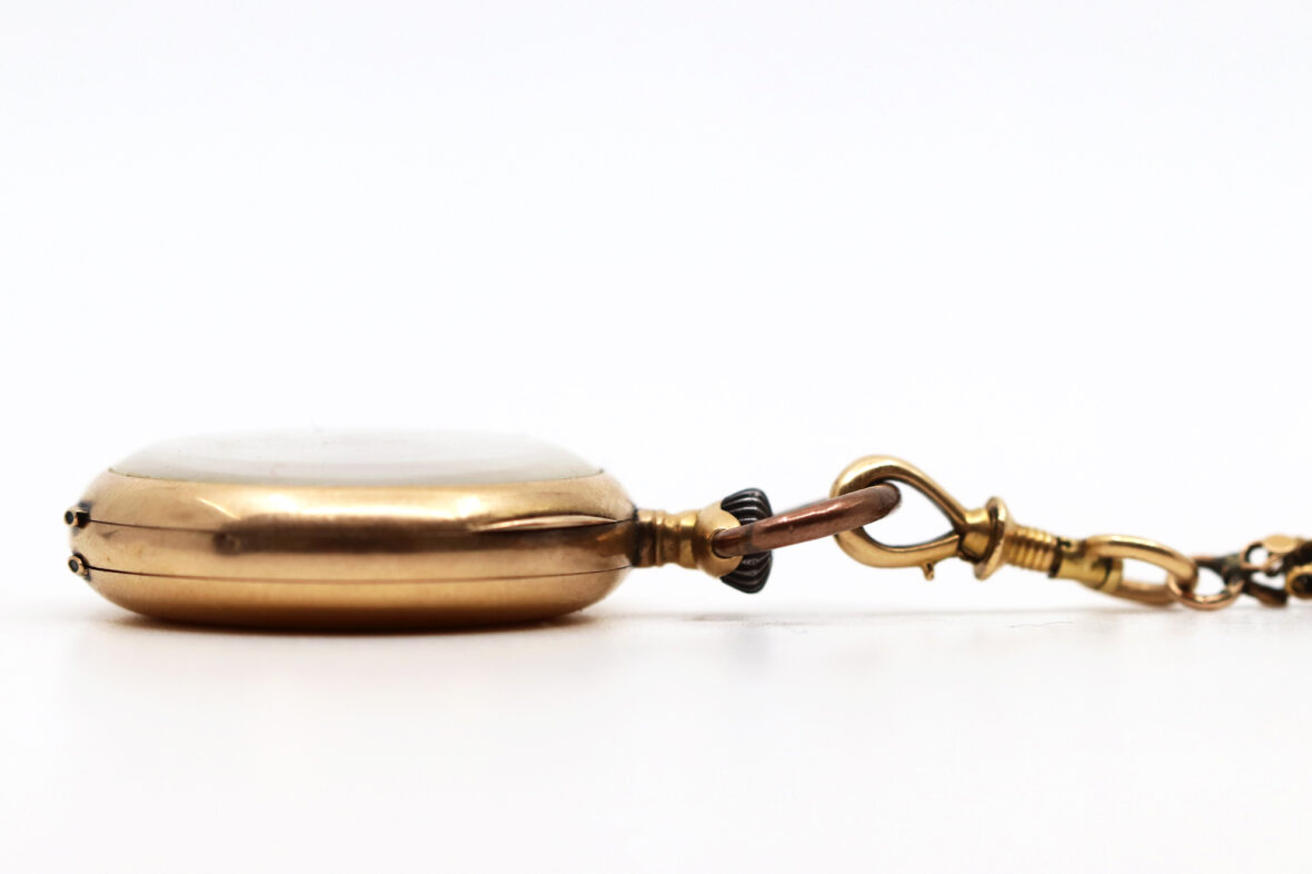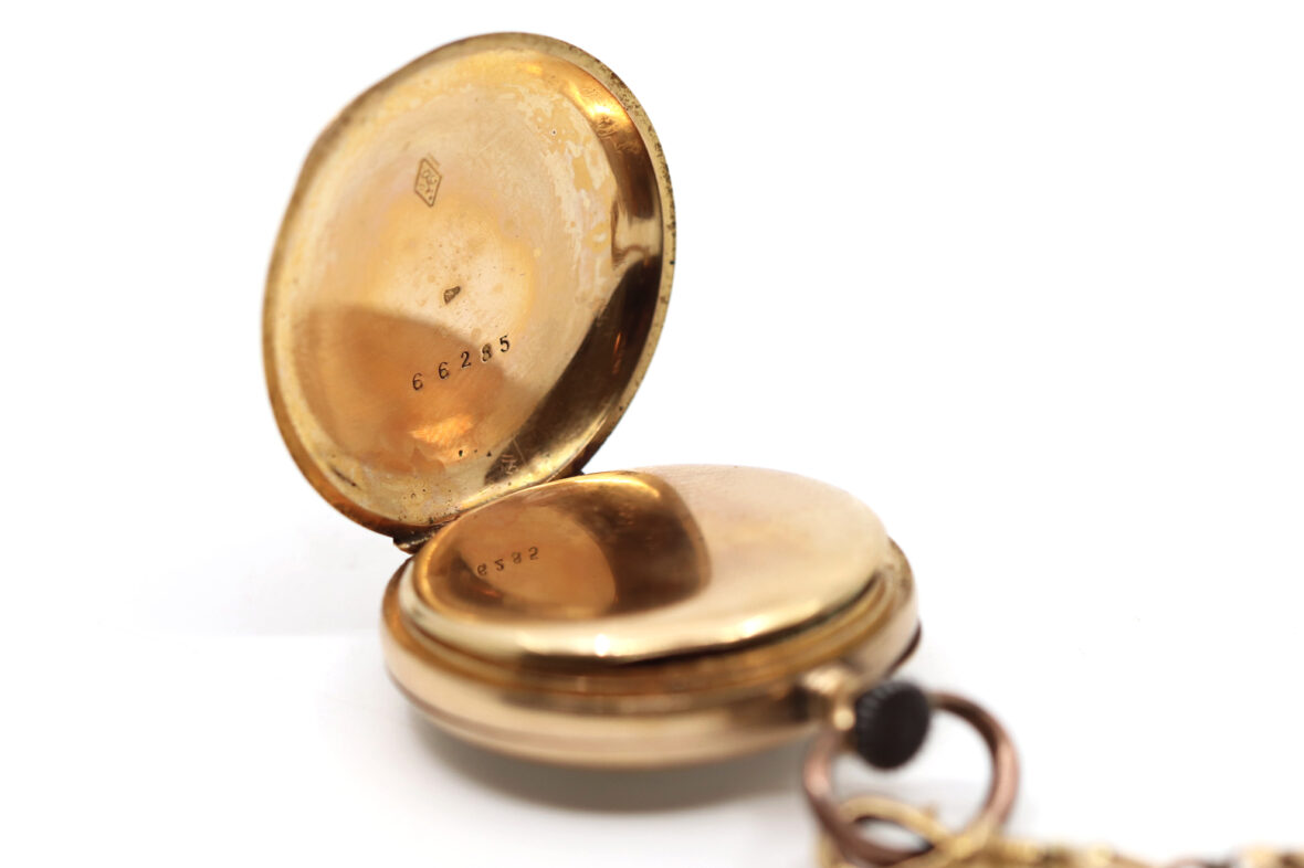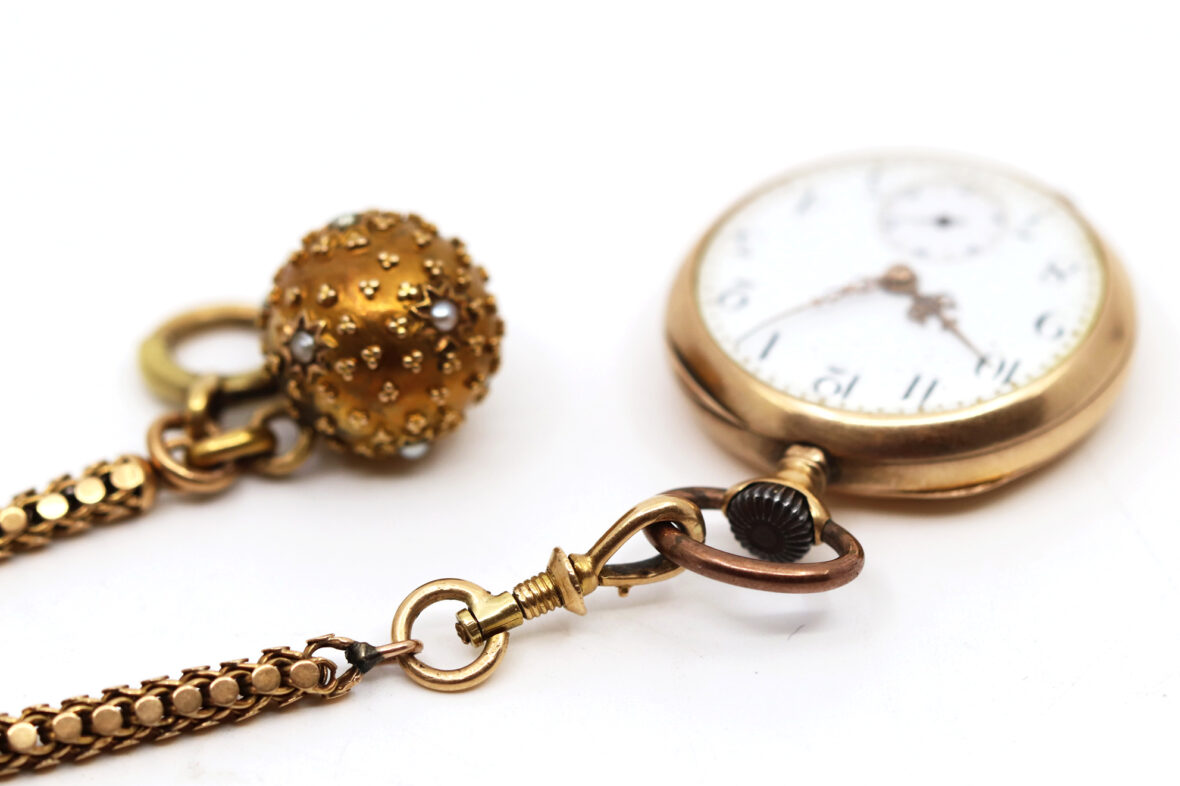 Montre à gousset en or jaune chiffrée BC. Cadran émaillé blanc à chiffres arabes. Cuvette intérieure en or. Avec une chaîne de montre à attache en forme de boule ornée de petites perles.