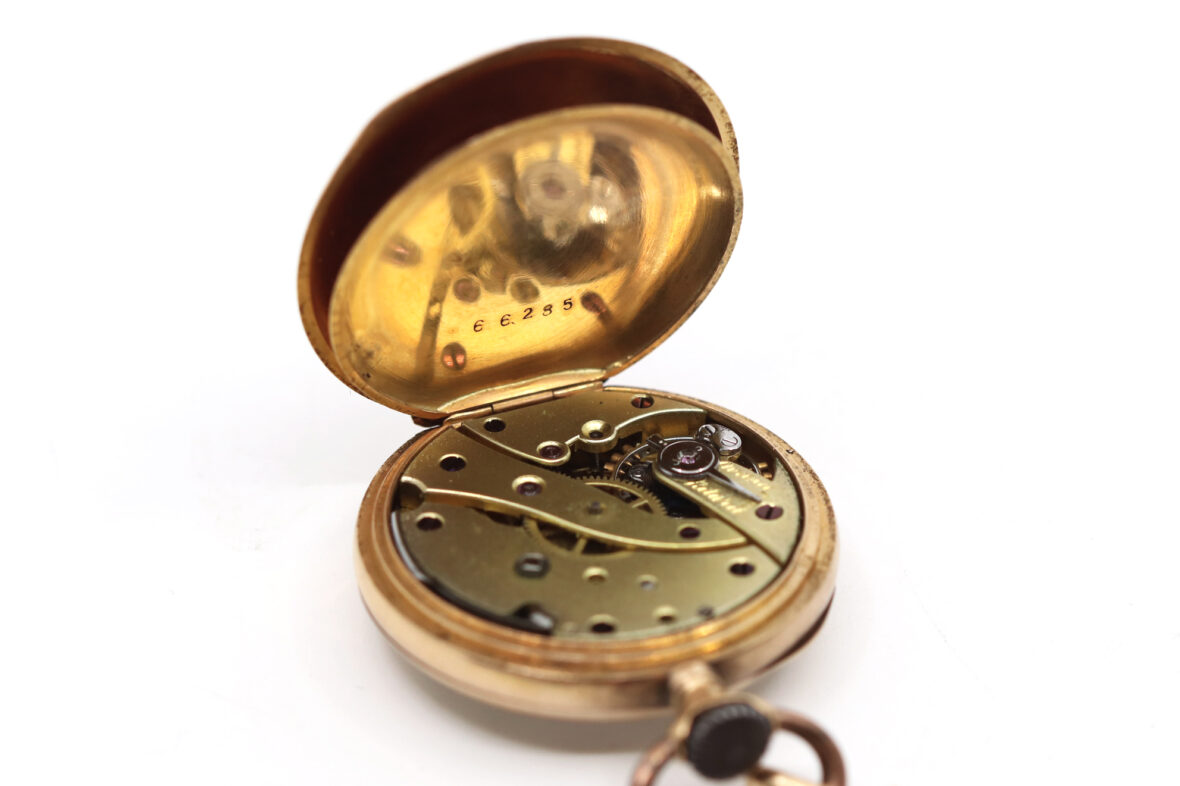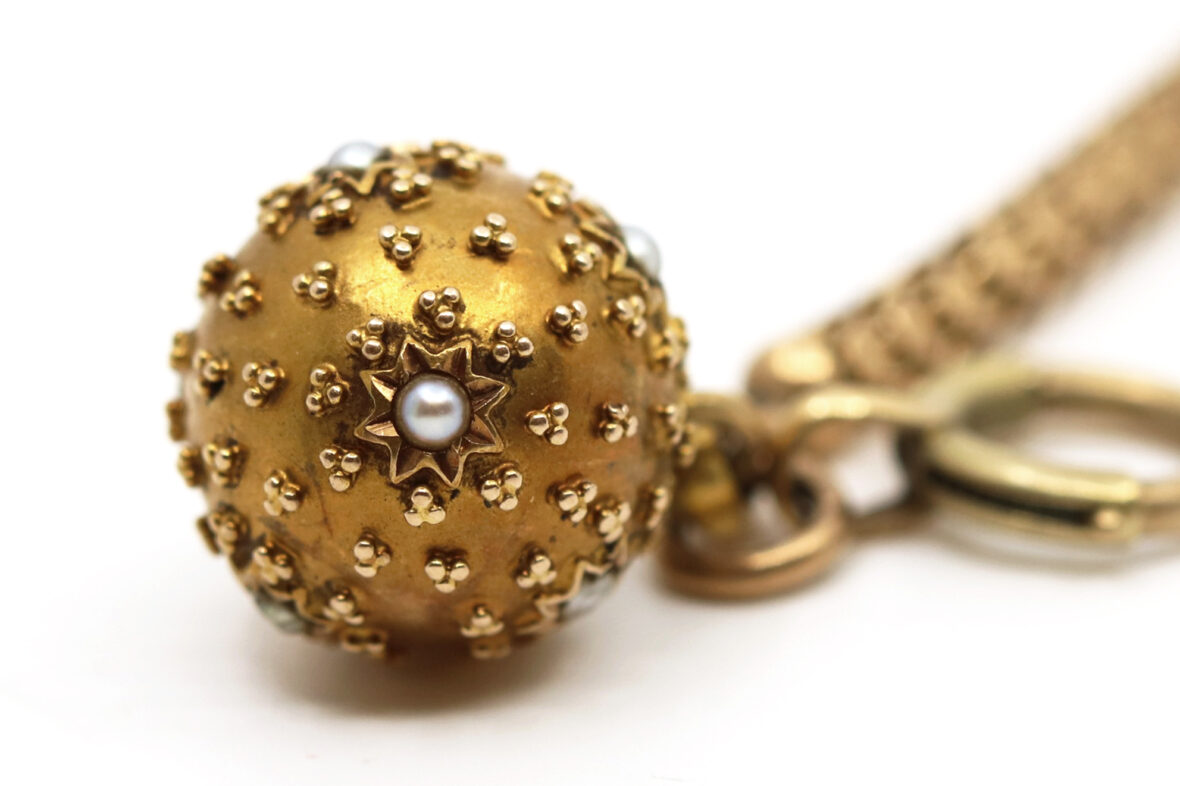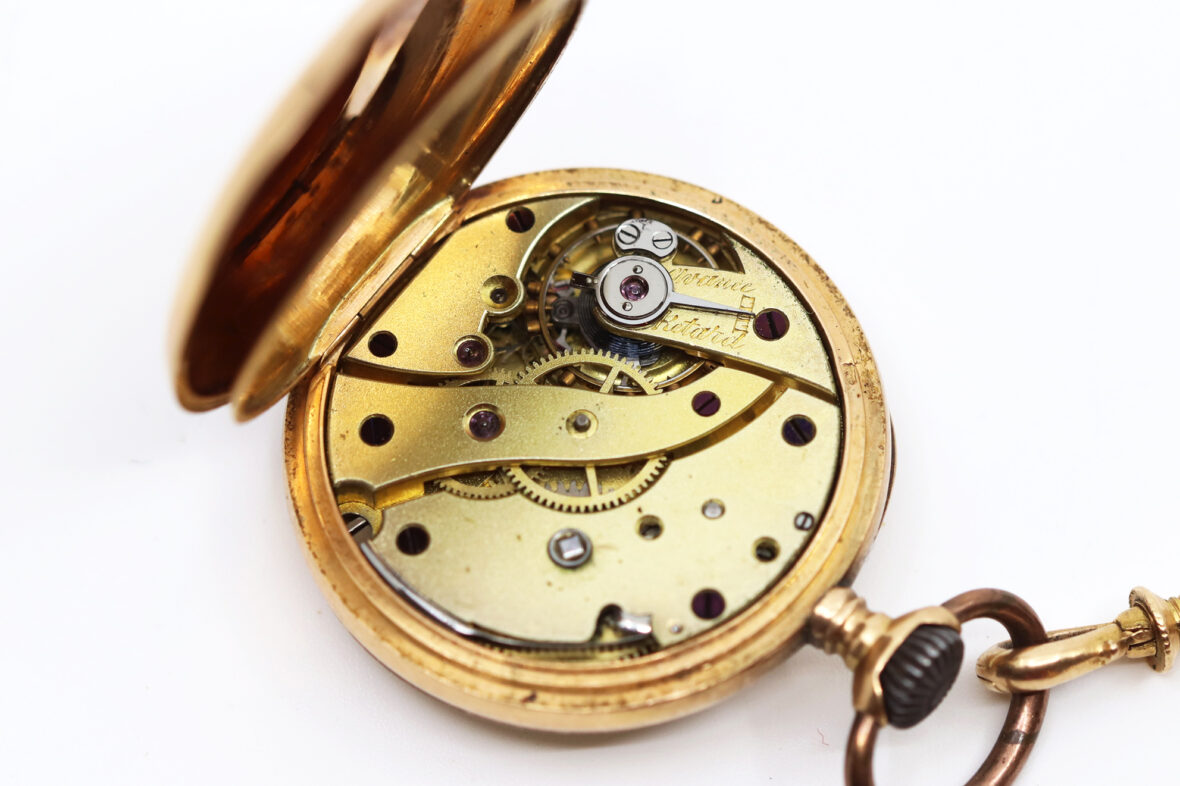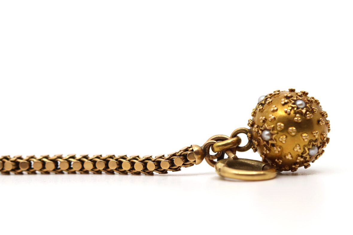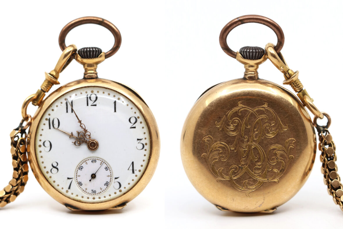 Montre à gousset en or jaune chiffrée BC. Cadran émaillé blanc à chiffres arabes. Cuvette intérieure en or. Avec une chaîne de montre à attache en forme de boule ornée de petites perles.