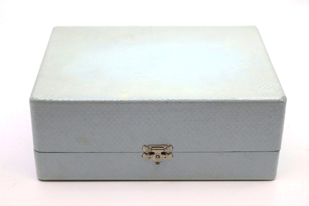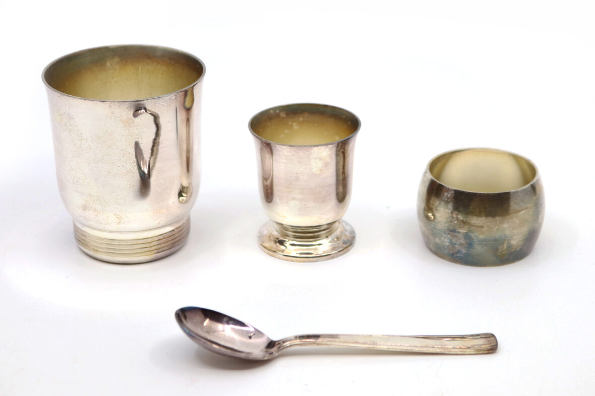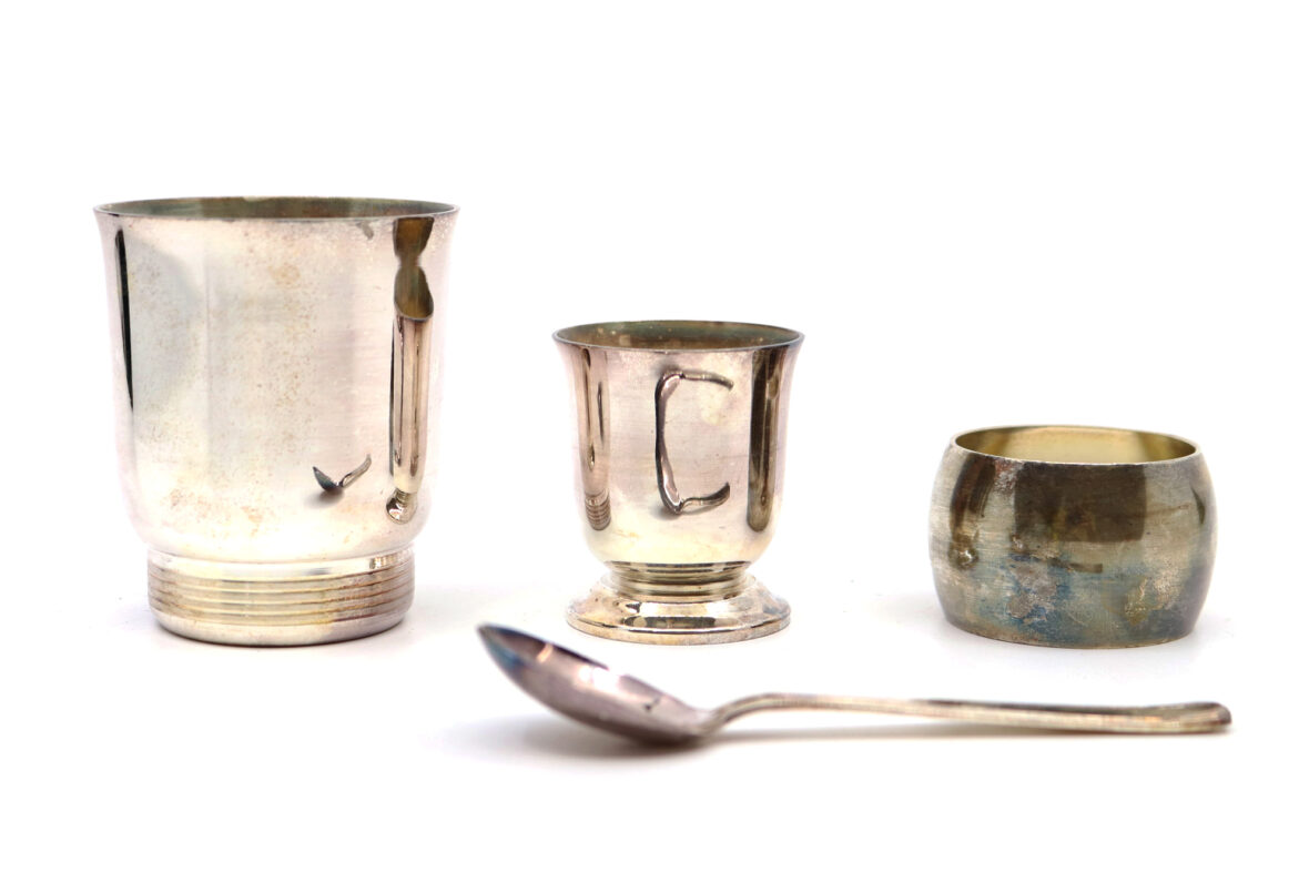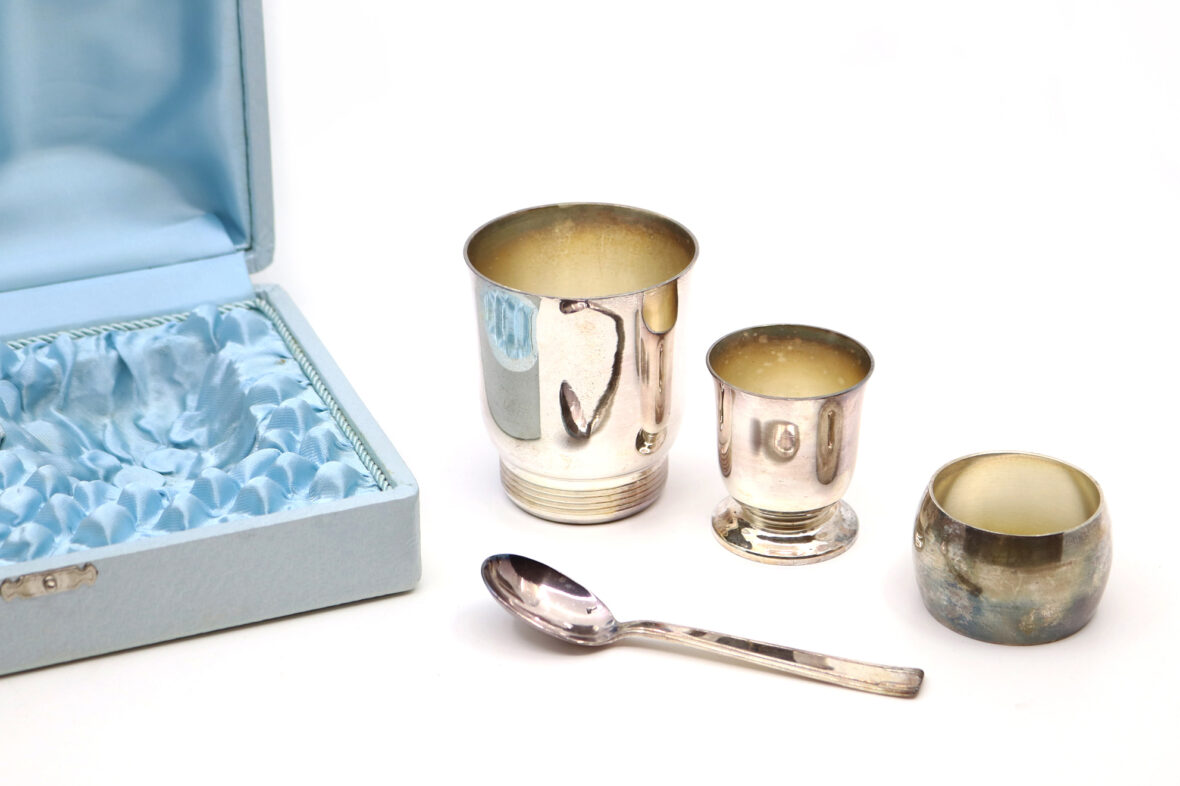 Nécessaire de baptême en métal argenté comprenant une timbale et un coquetier tulipes, un rond de serviette et une cuillère à bouillie. Dans son coffret.