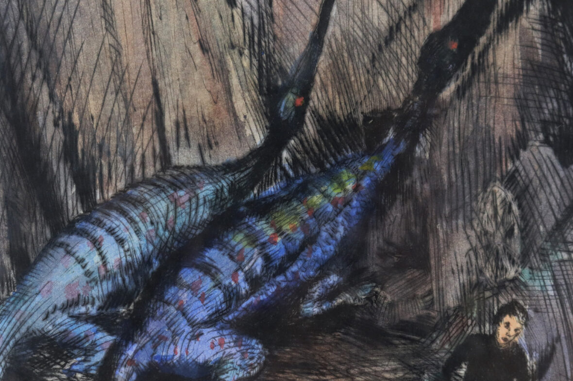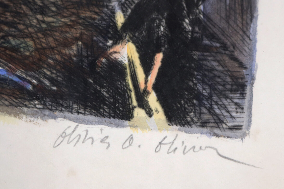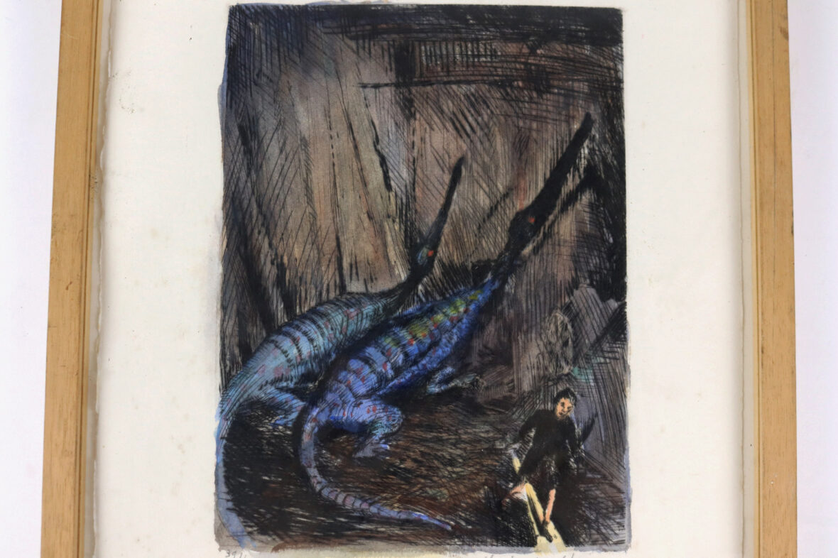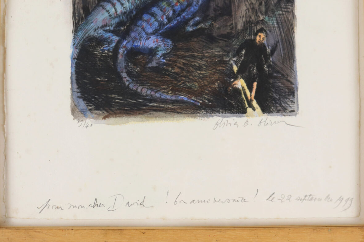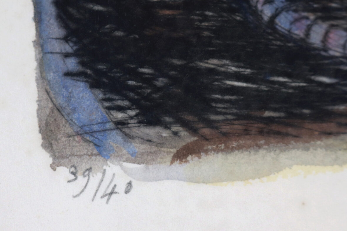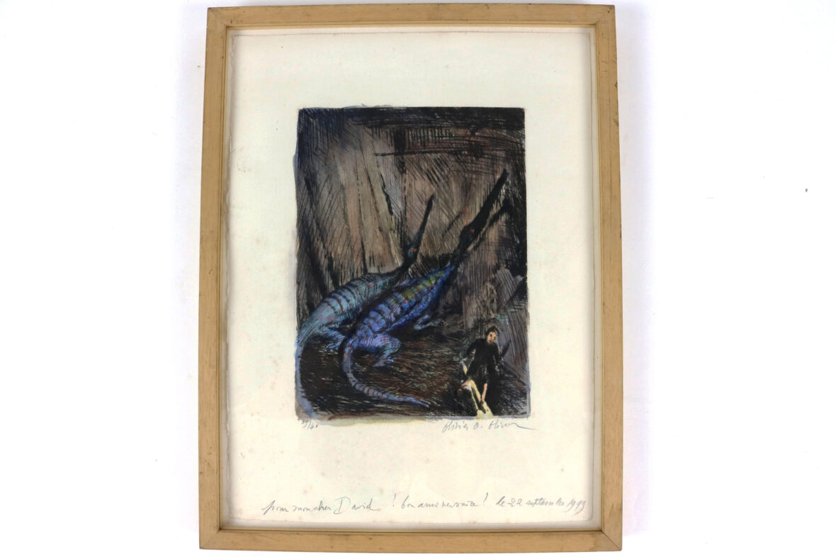 Gravure en noir rehaussée à l’aquarelle. Signée en bas à droite. Numérotée 39/40 en bas à gauche. Dédicacée.