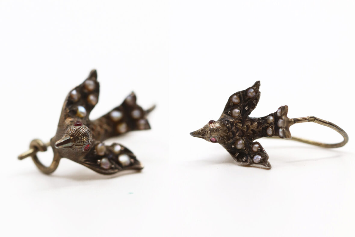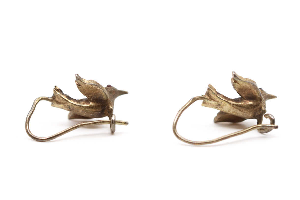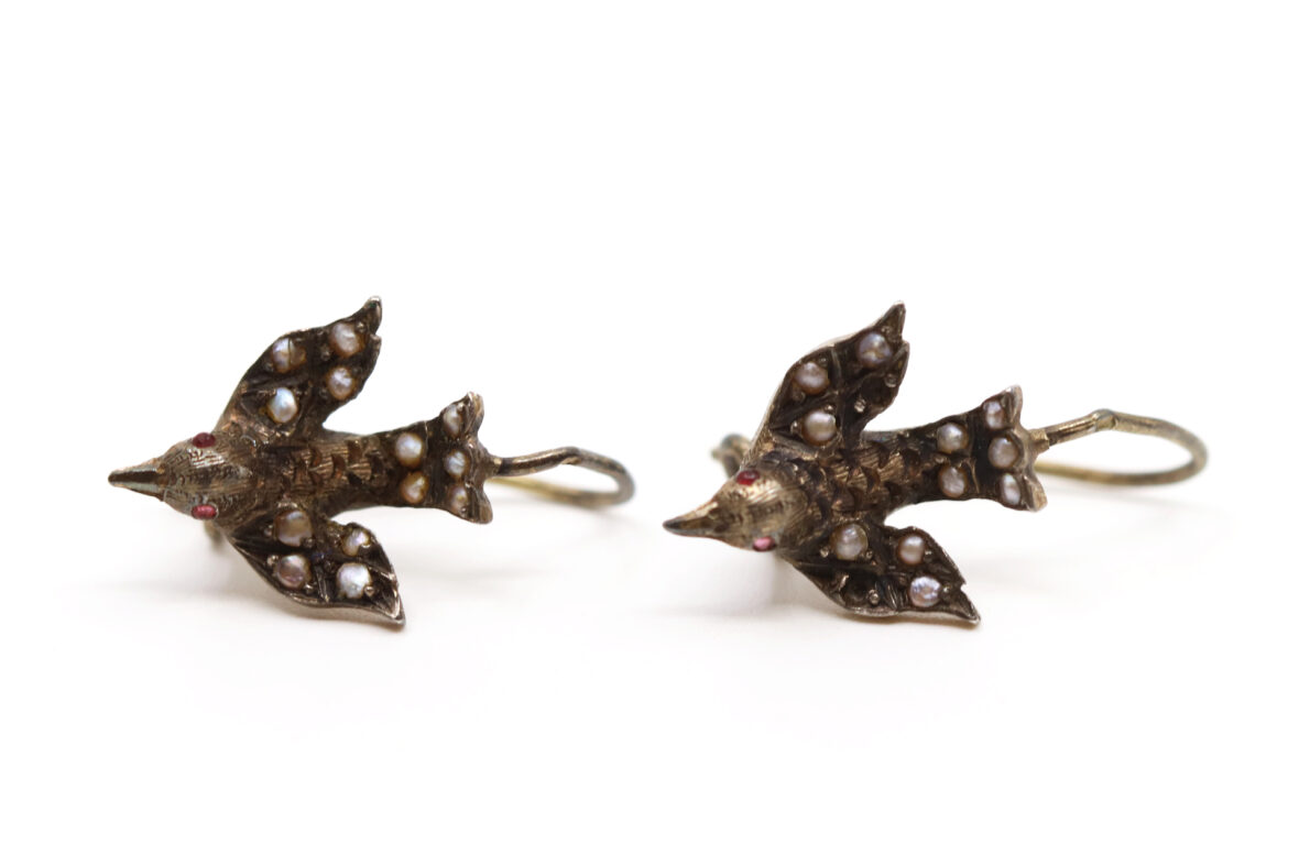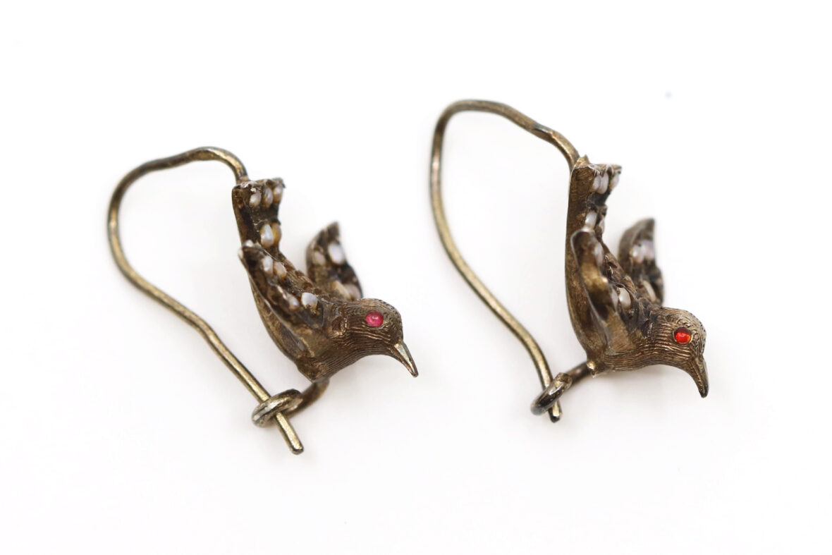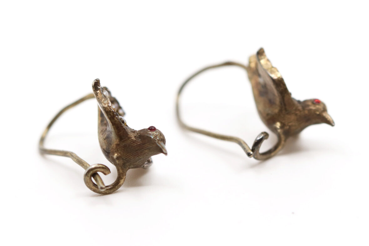 Paire de boucles d’oreilles en argent à décor d’oiseau aux ailes déployées serties de petits cabochons de perles, les yeux formés de petites pierres rouges.