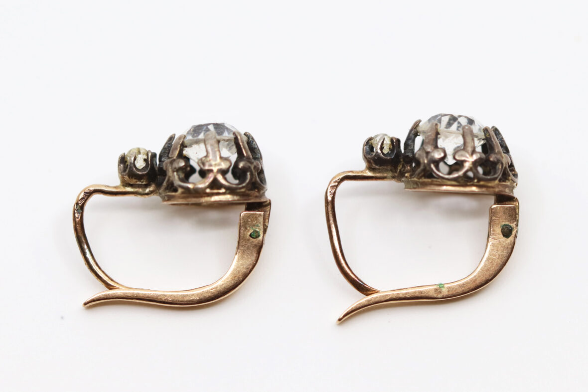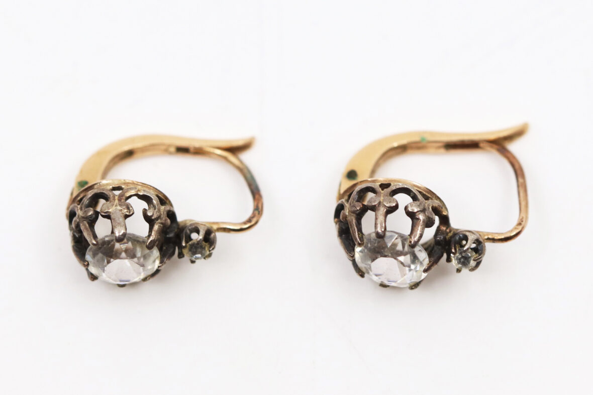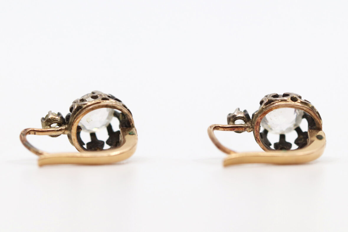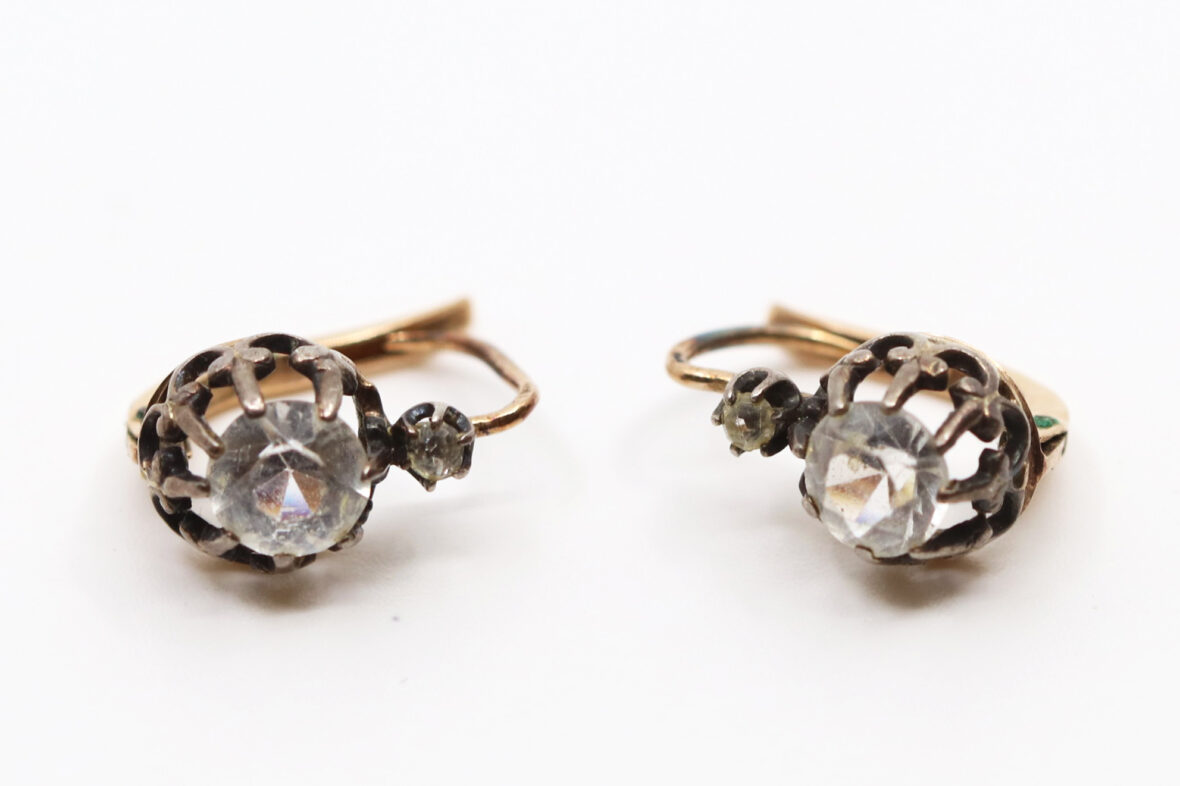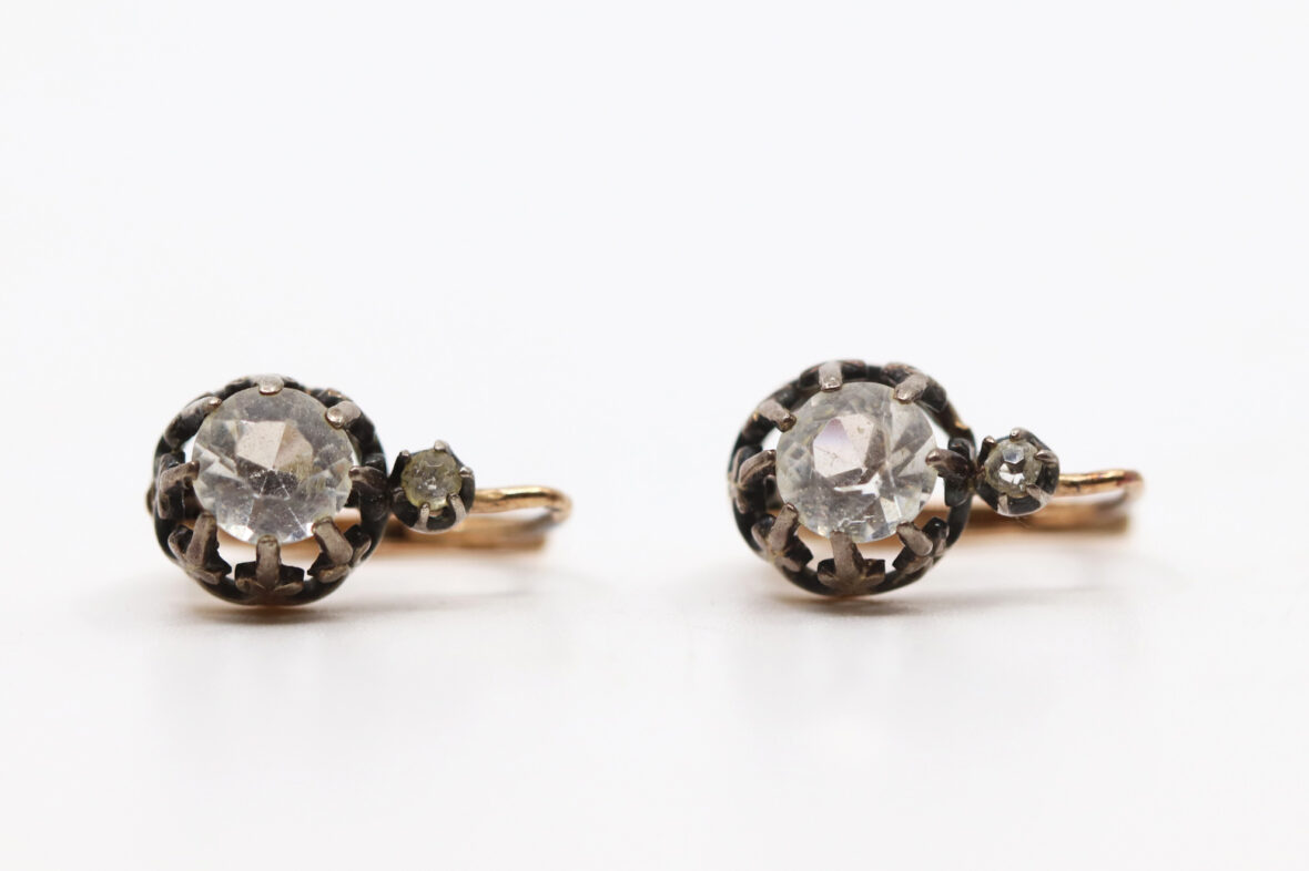 Paire de boucles d’oreilles en or jaune, ornée d’une pierre blanche. Poids : 2,4