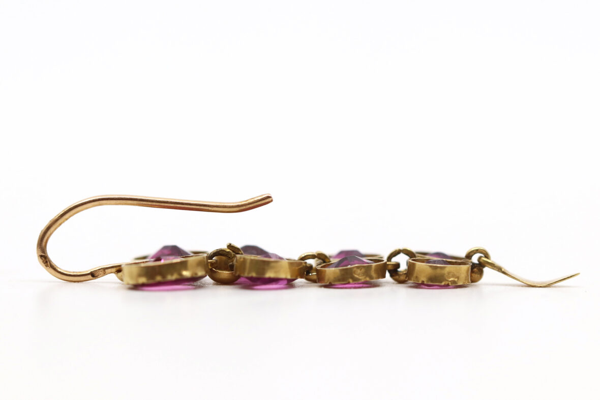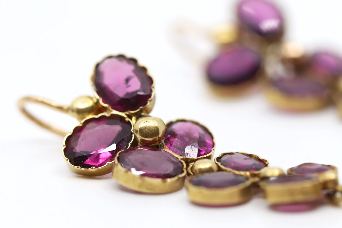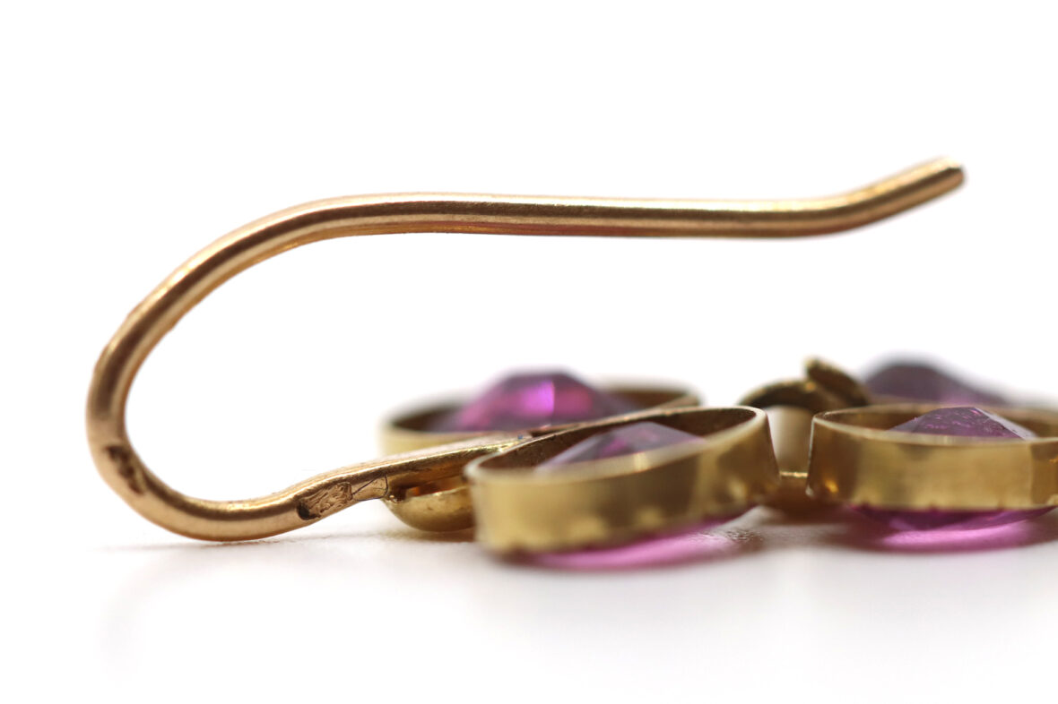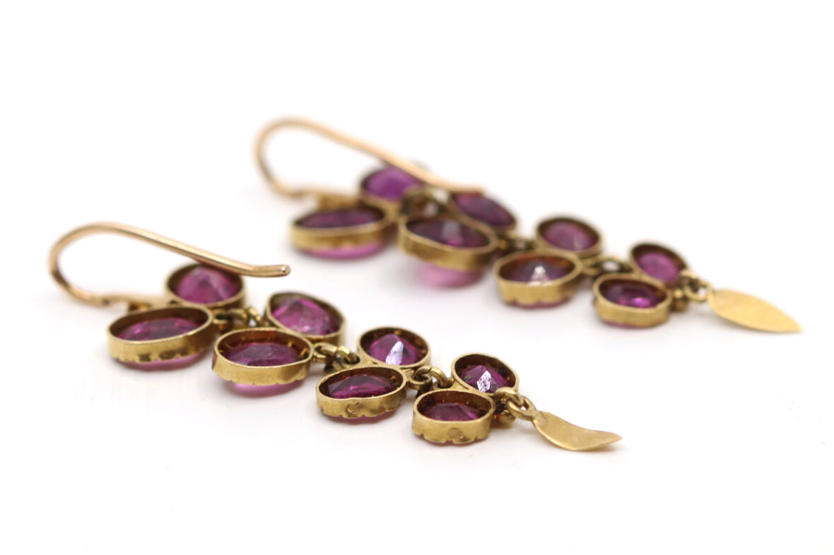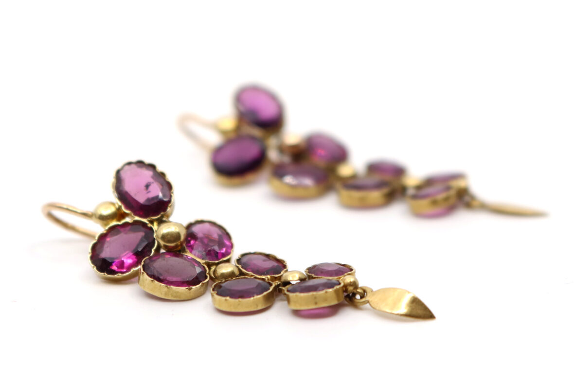 Paire de boucles d’oreilles en or jaune tombante ornée de grenat en serti clos stylisant une grappe.