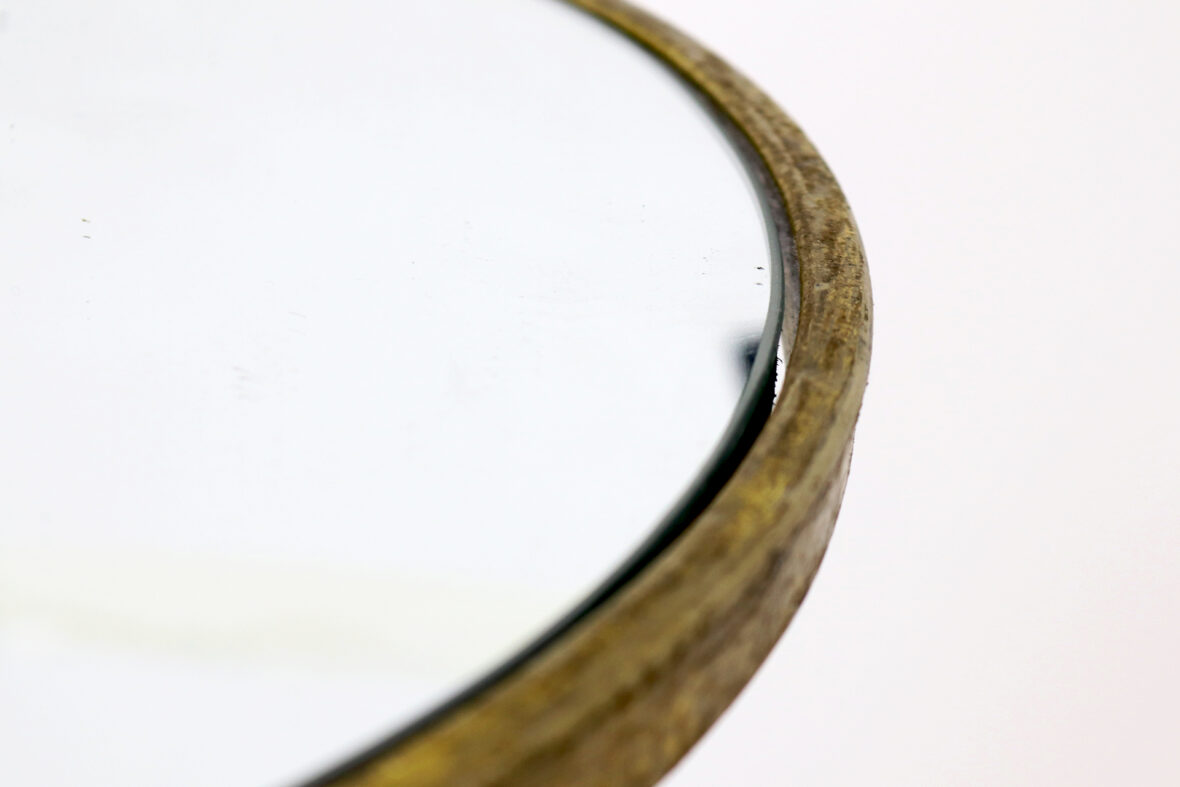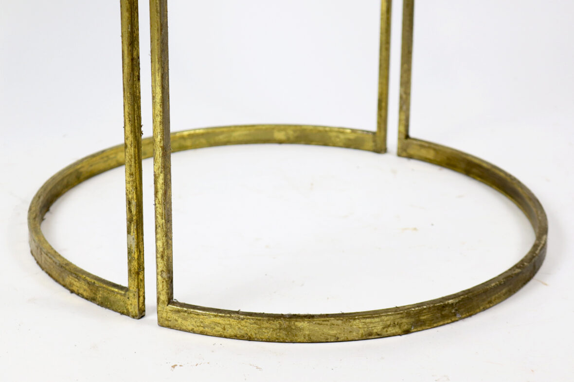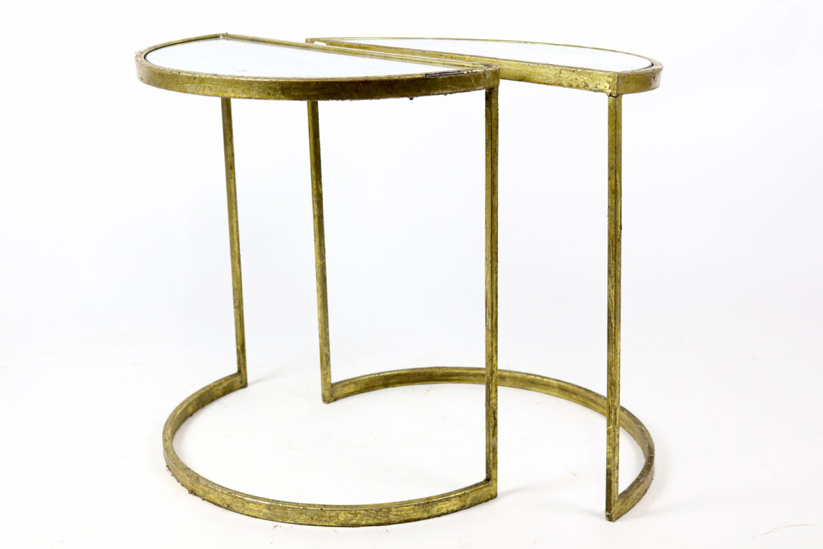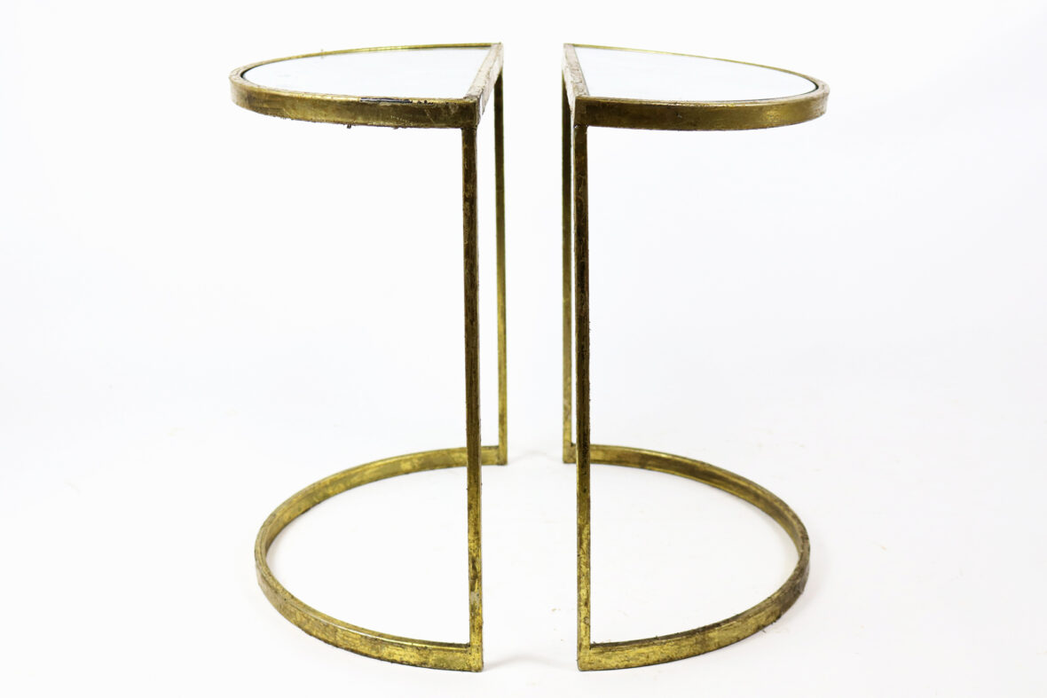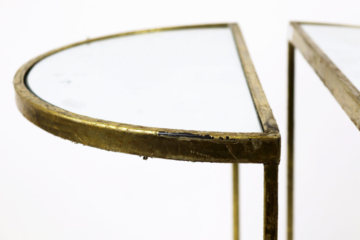 Paire de bouts de canapé demi-lune en métal doré, le plateau à fond miroir.
