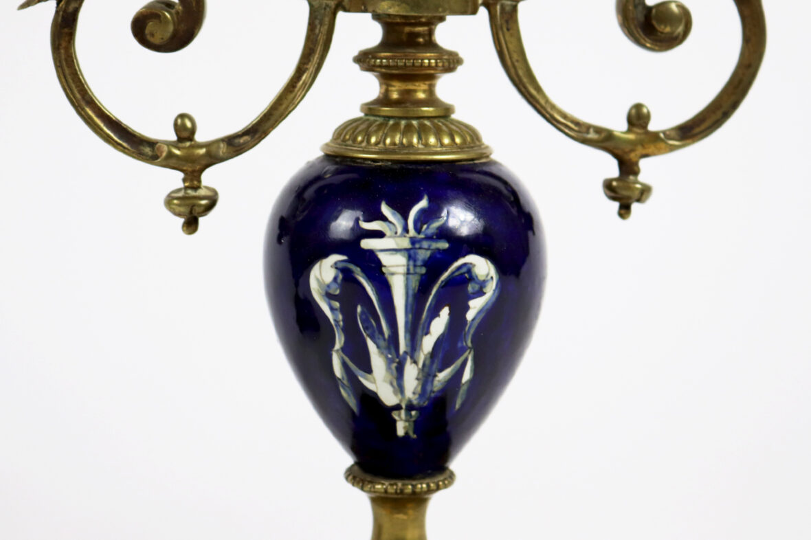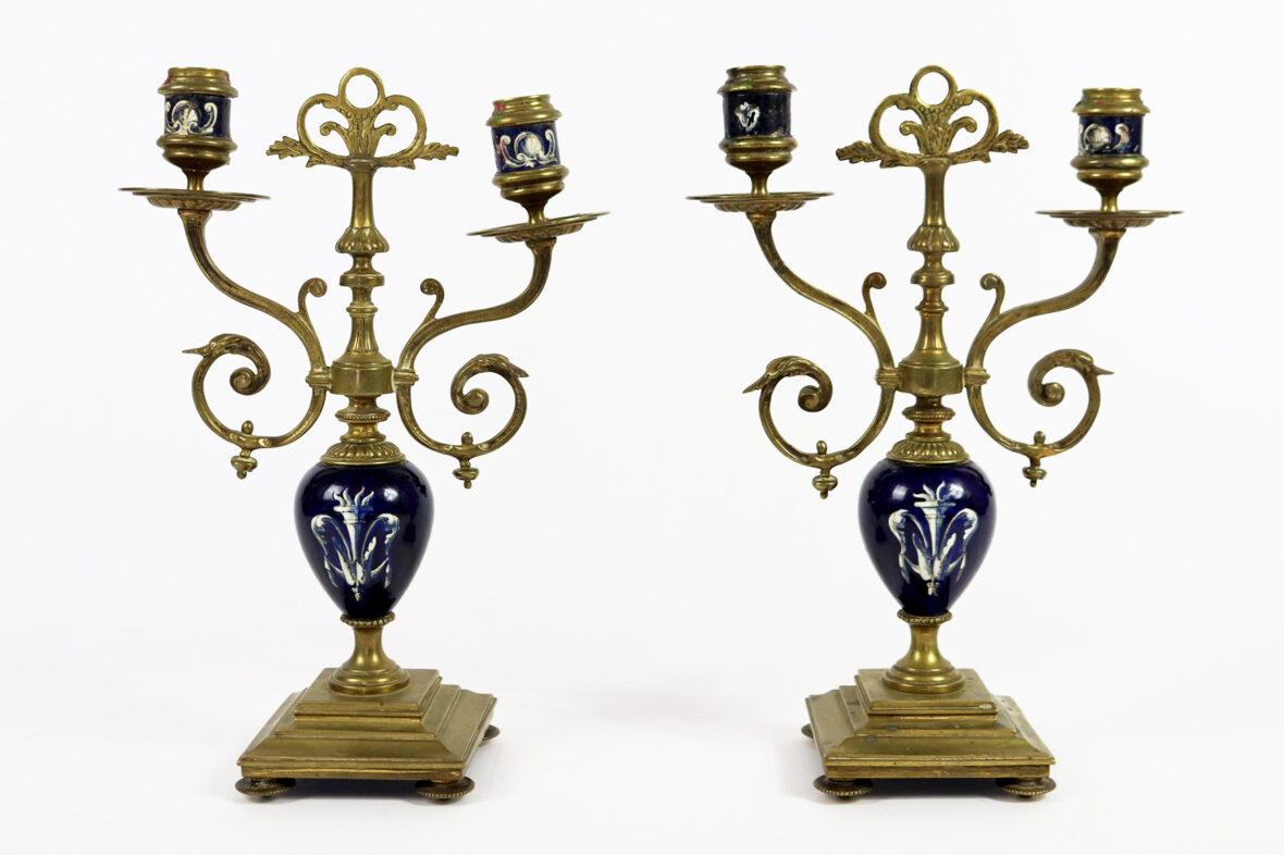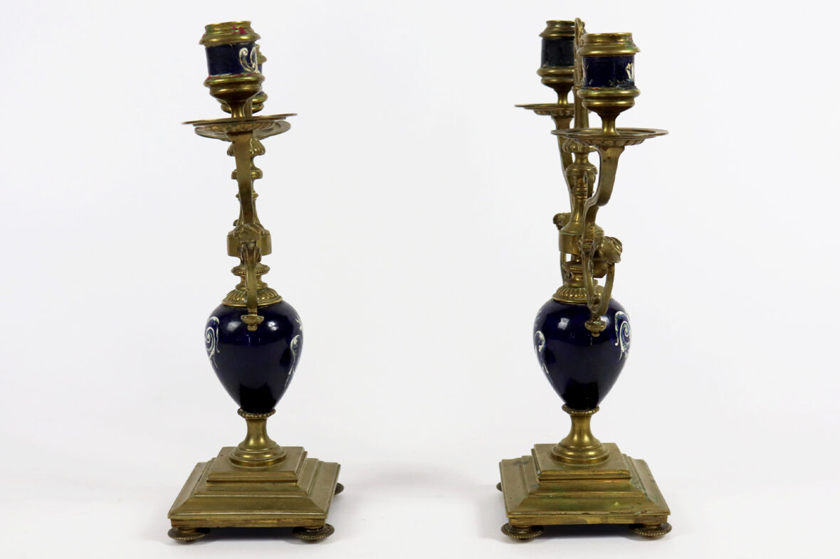Paire de chandeliers de forme balustre à deux bras de lumière en bronze doré et porcelaine à fond gros bleu.