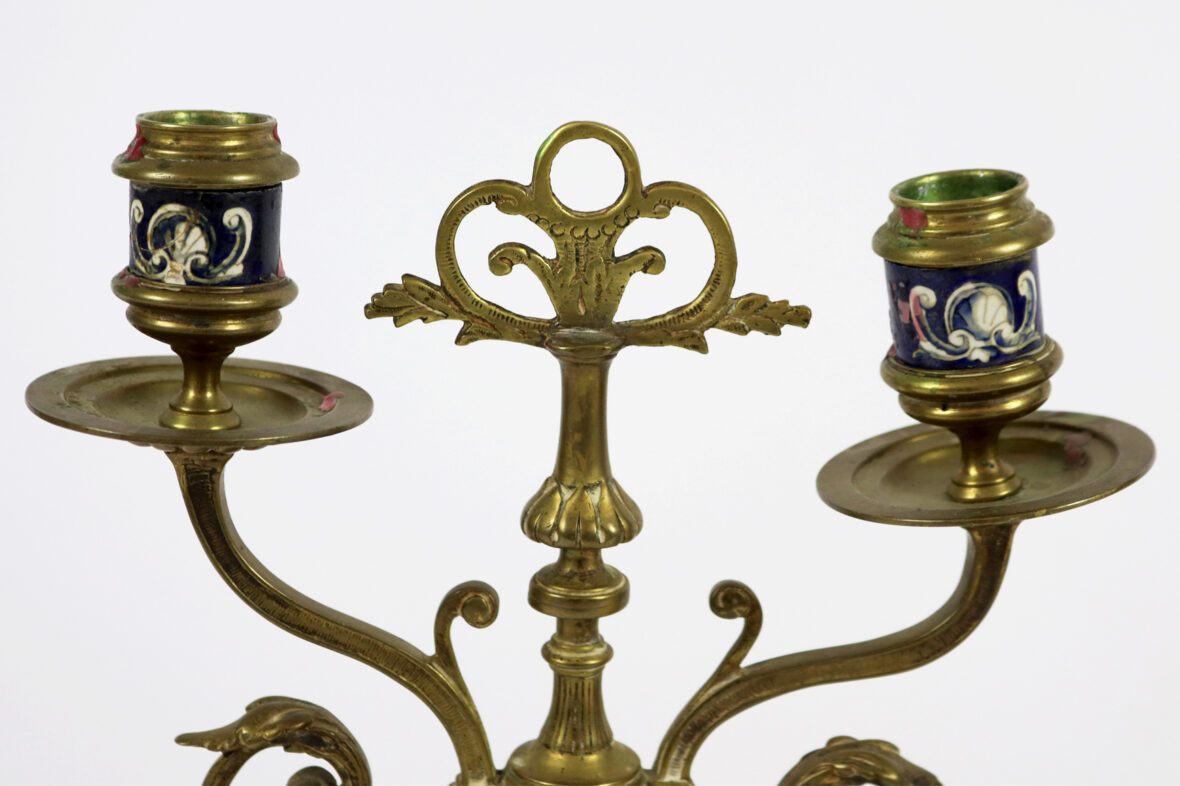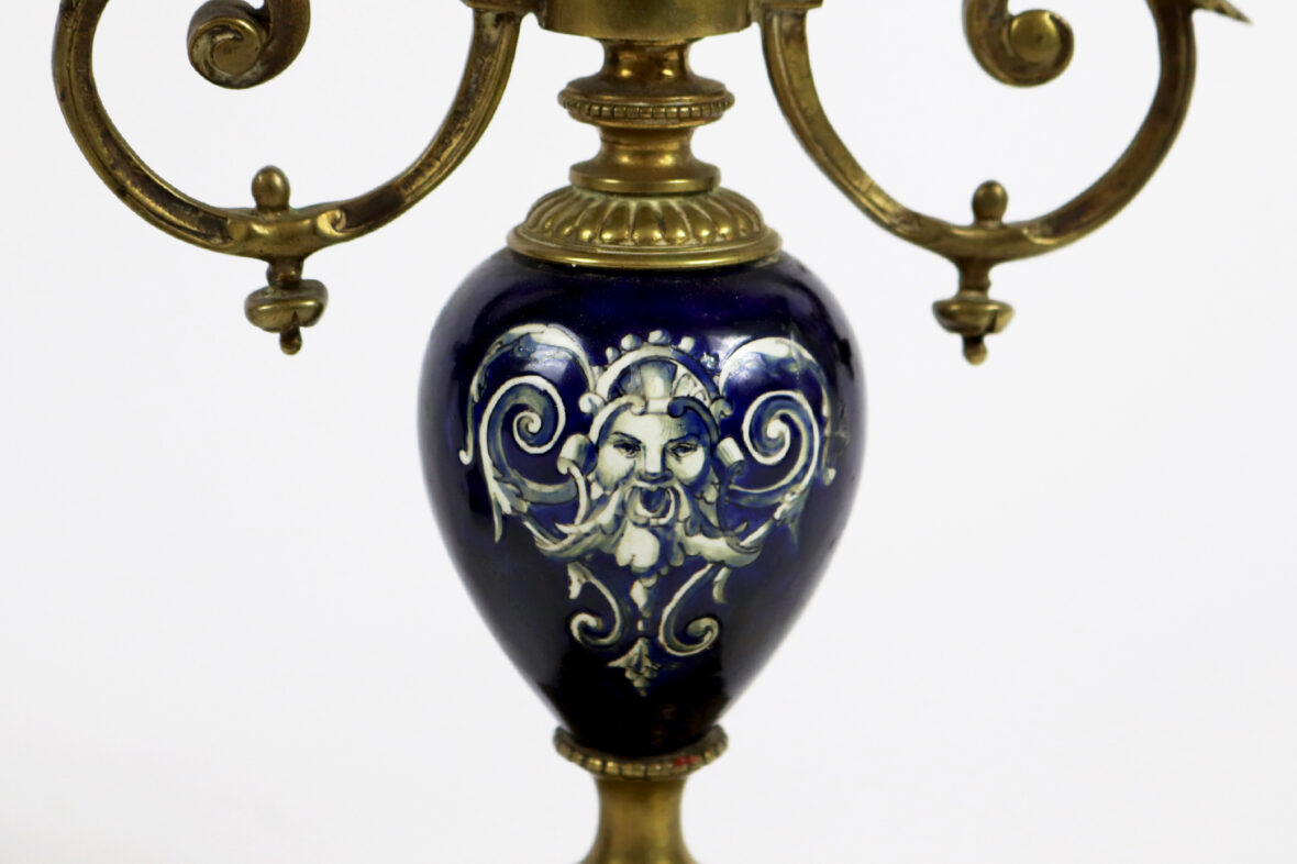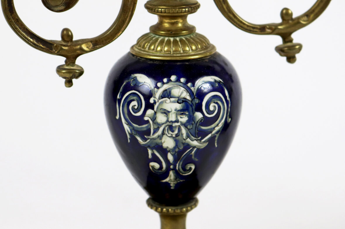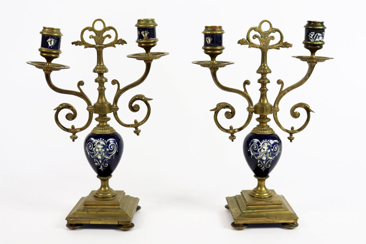 Paire de chandeliers de forme balustre à deux bras de lumière en bronze doré et porcelaine à fond gros bleu.