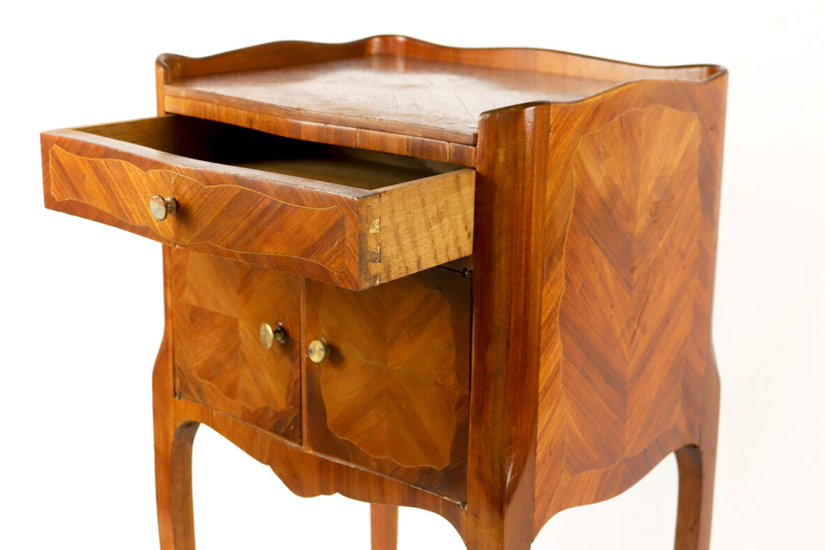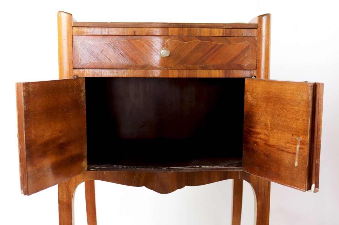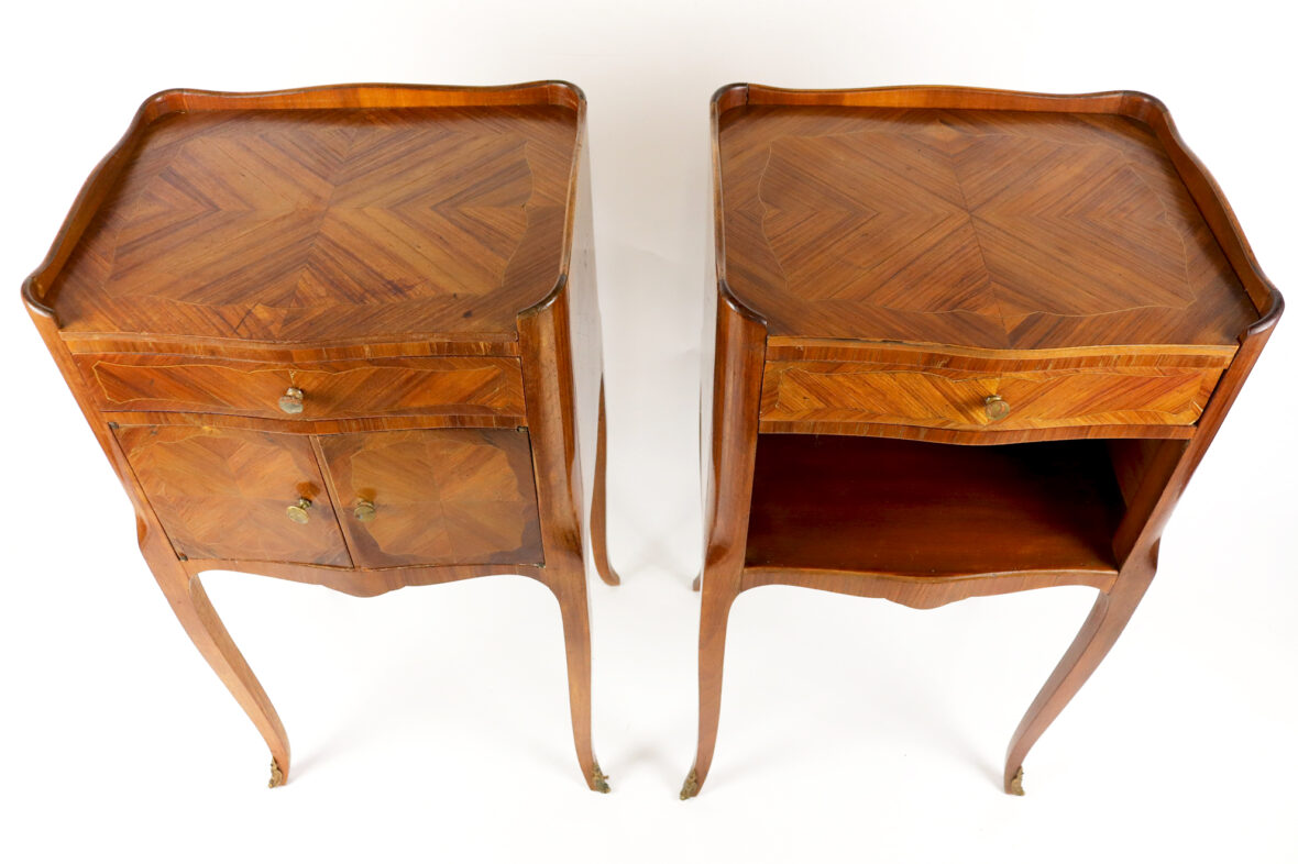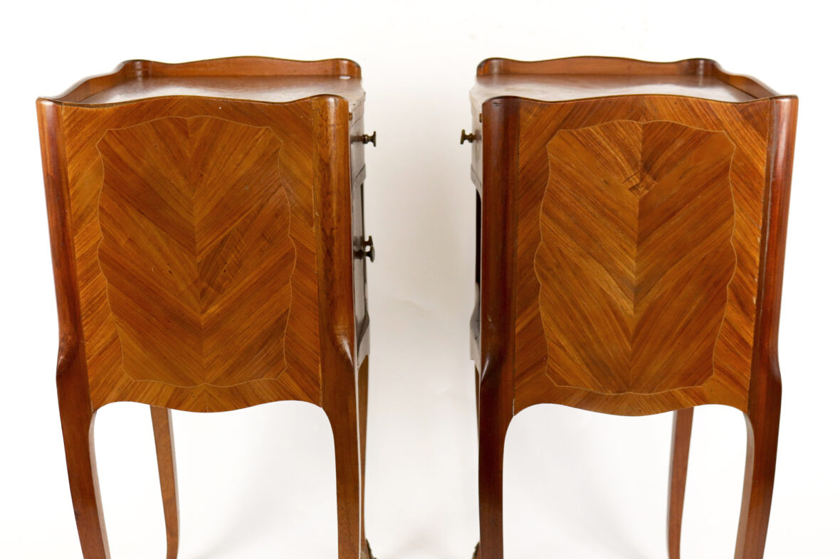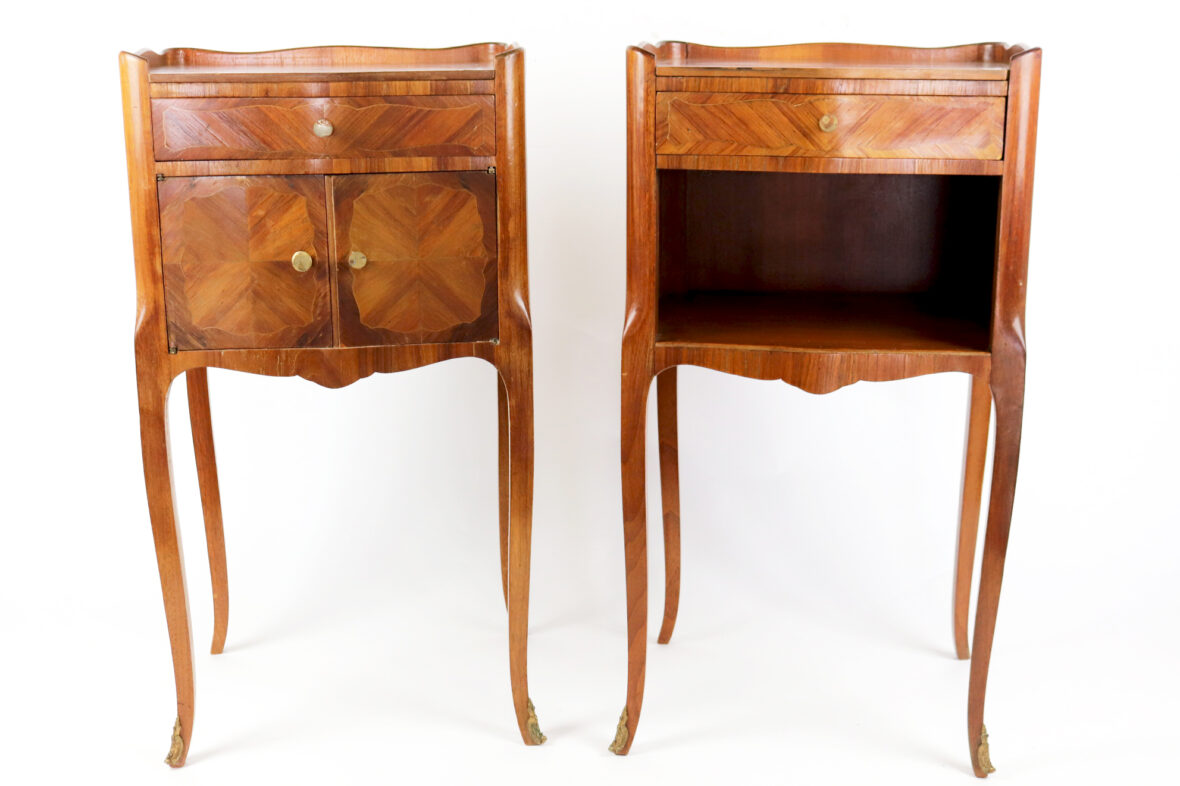 Paire de chevets en bois de placage à décor marqueté, l’un ouvrant par un tiroir et deux portes, le second ouvrant par un tiroir surmontant un casier.