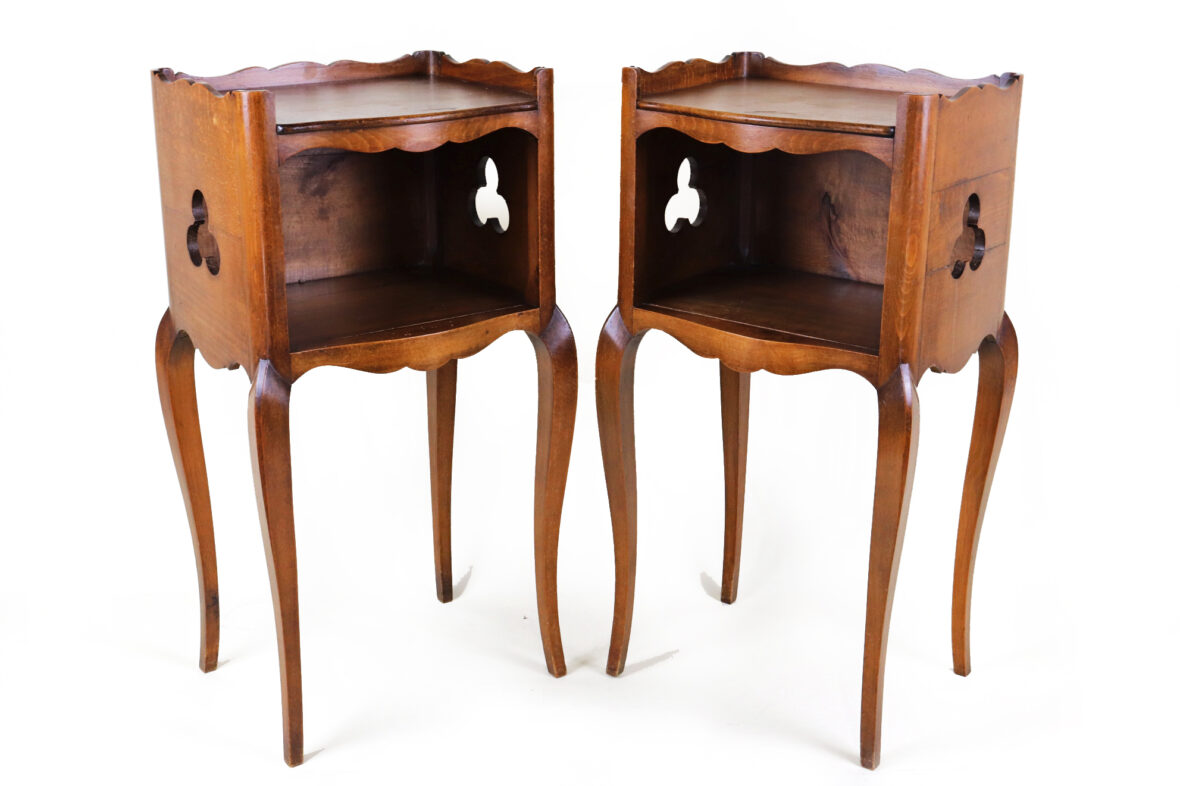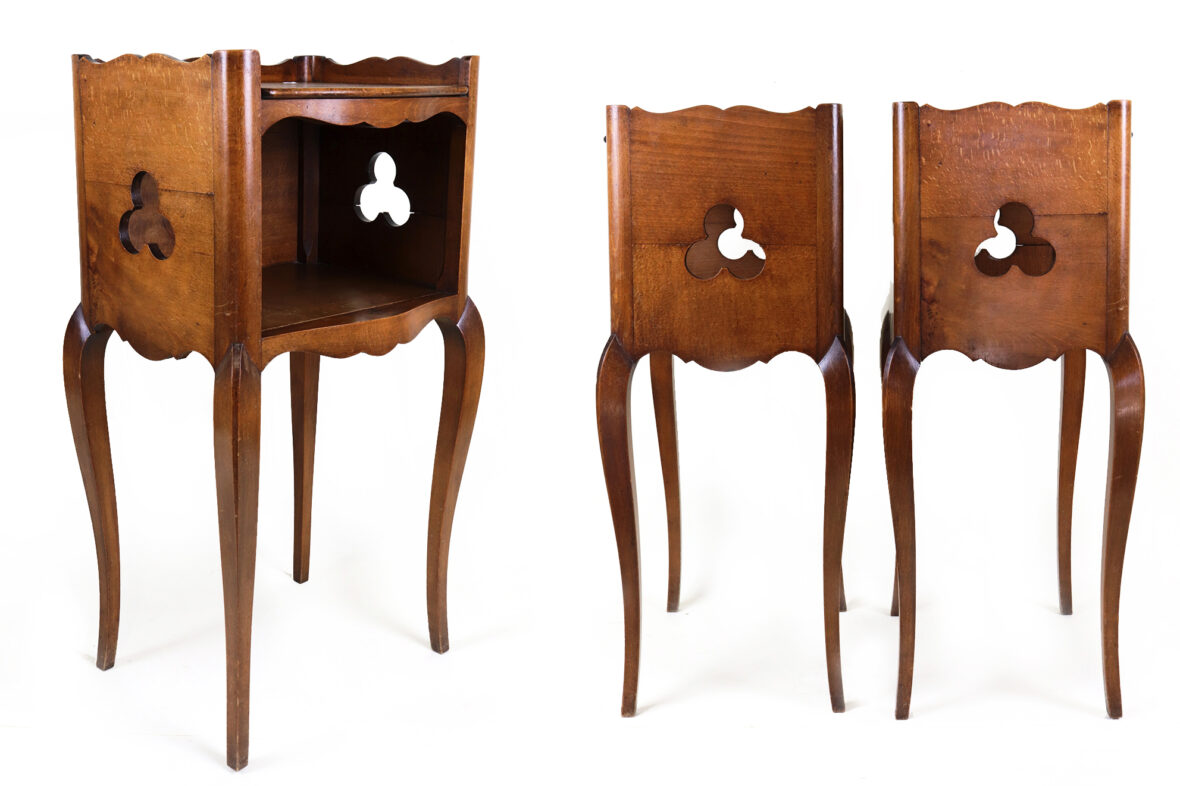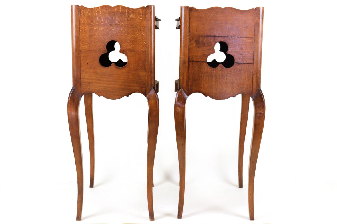 Paire de chevets en bois naturel à décor ajouré d’un trèfle sur les côtés, pieds cambrés.