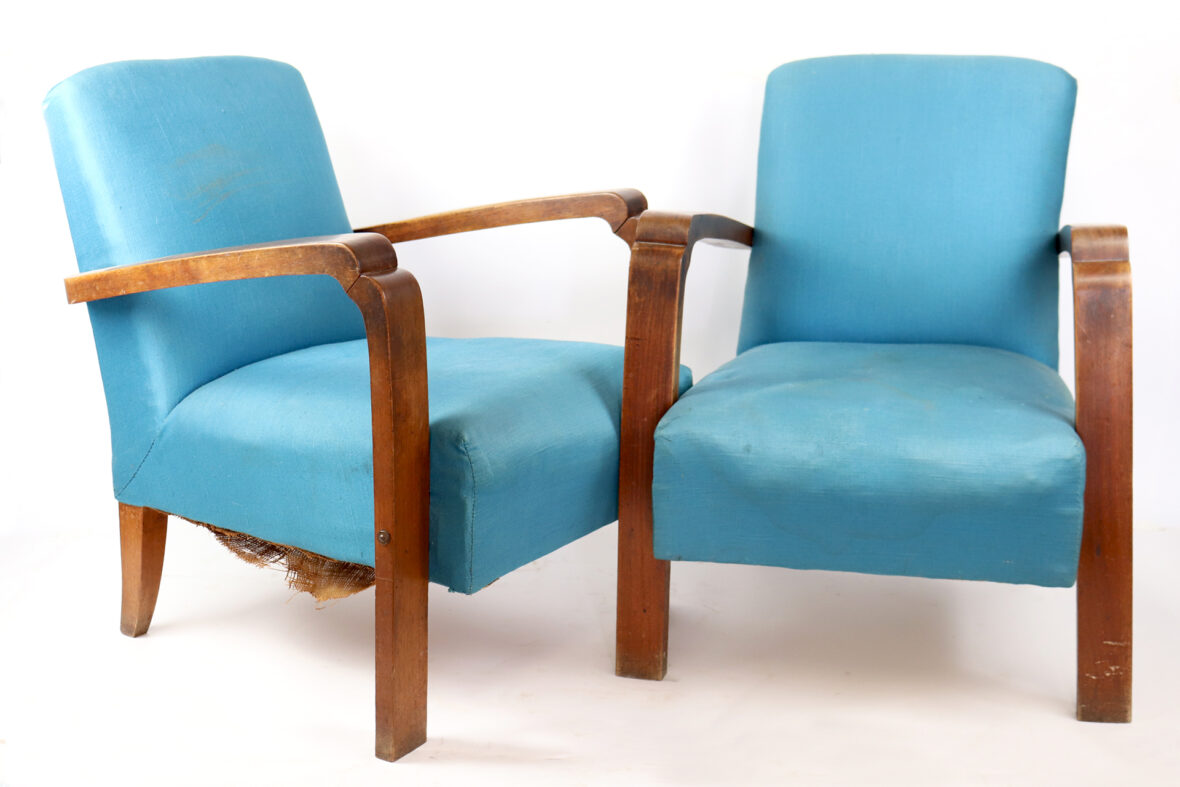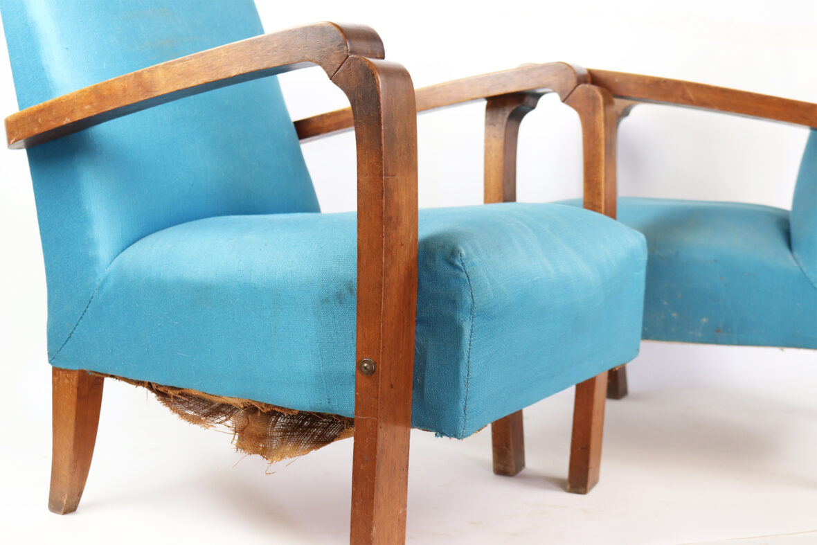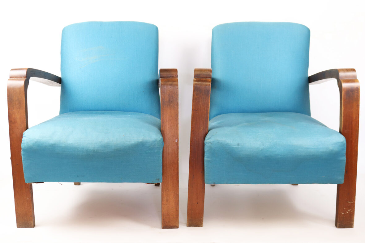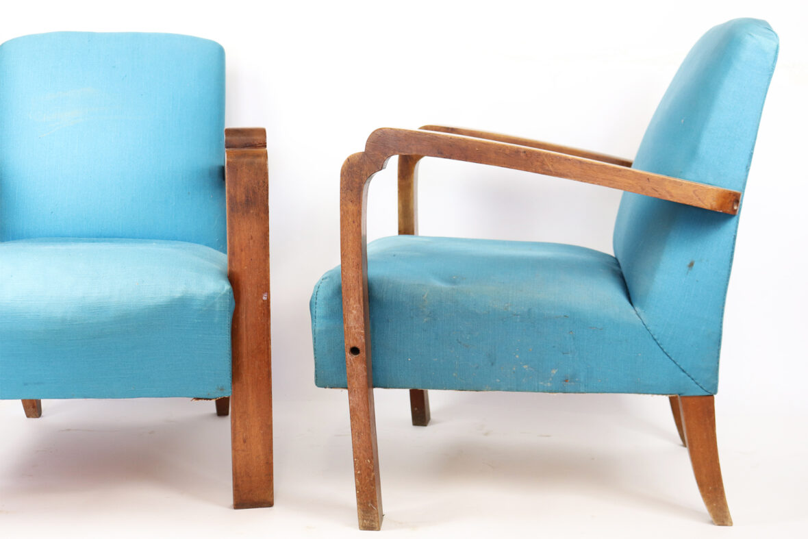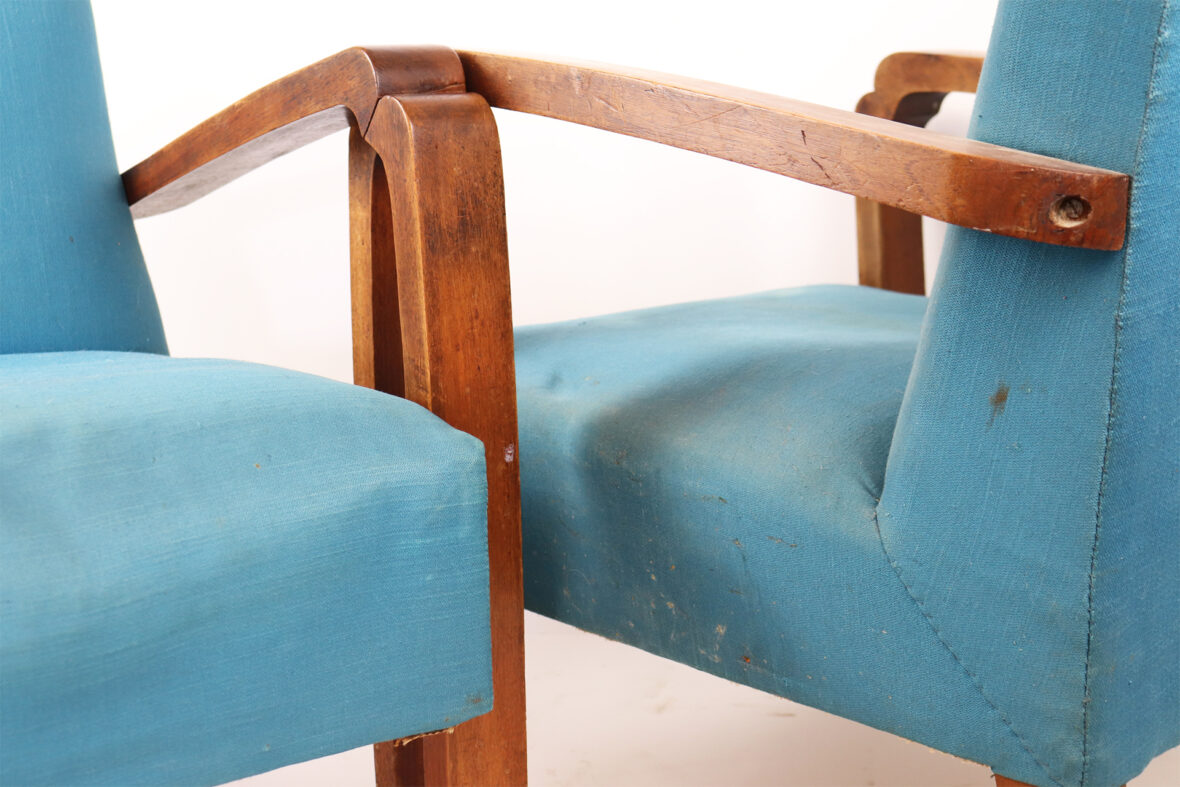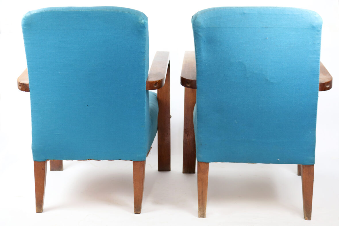 Paire de fauteuils club en bois naturel. Les accotoirs et piètement avant droits, le piètement arrière sabre. Garniture de tissu bleu.