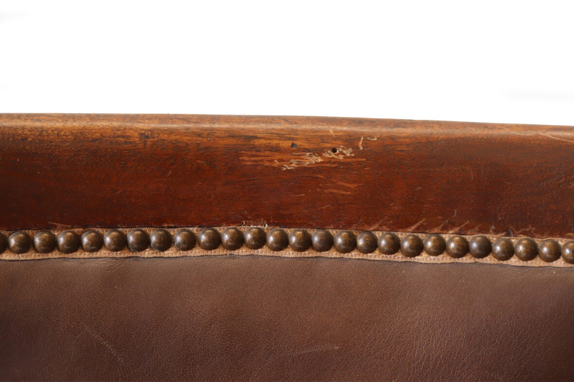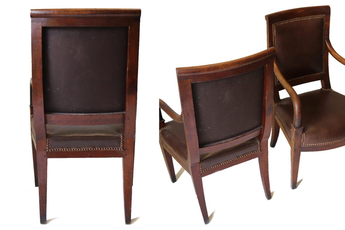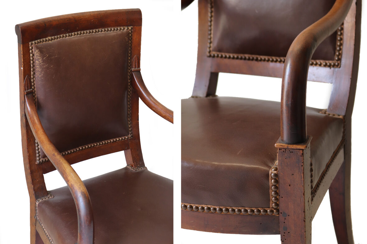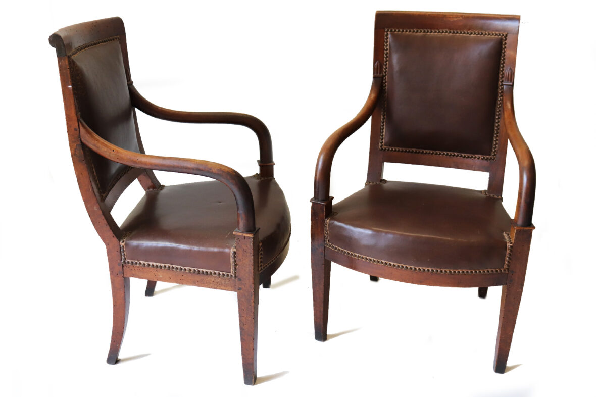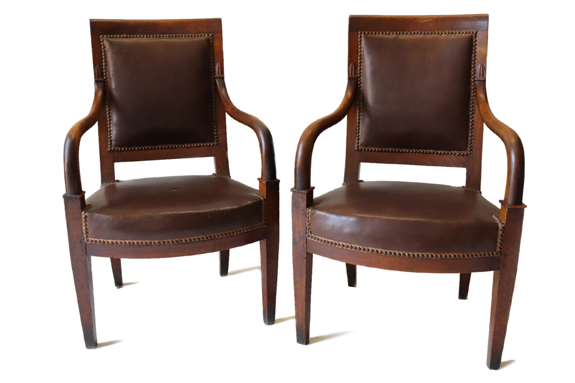 Paire de fauteuils de style Empire en bois naturel, le dossier et l’assise garnis de skaï brun.