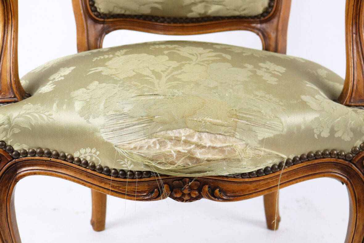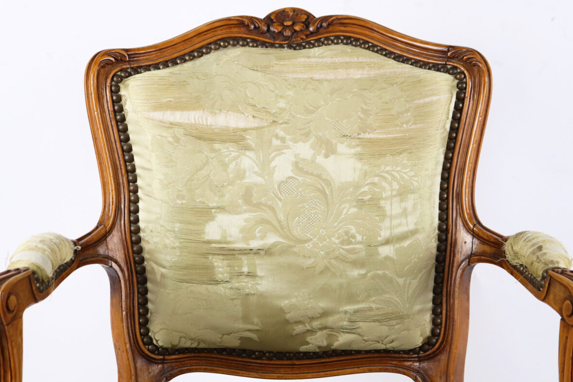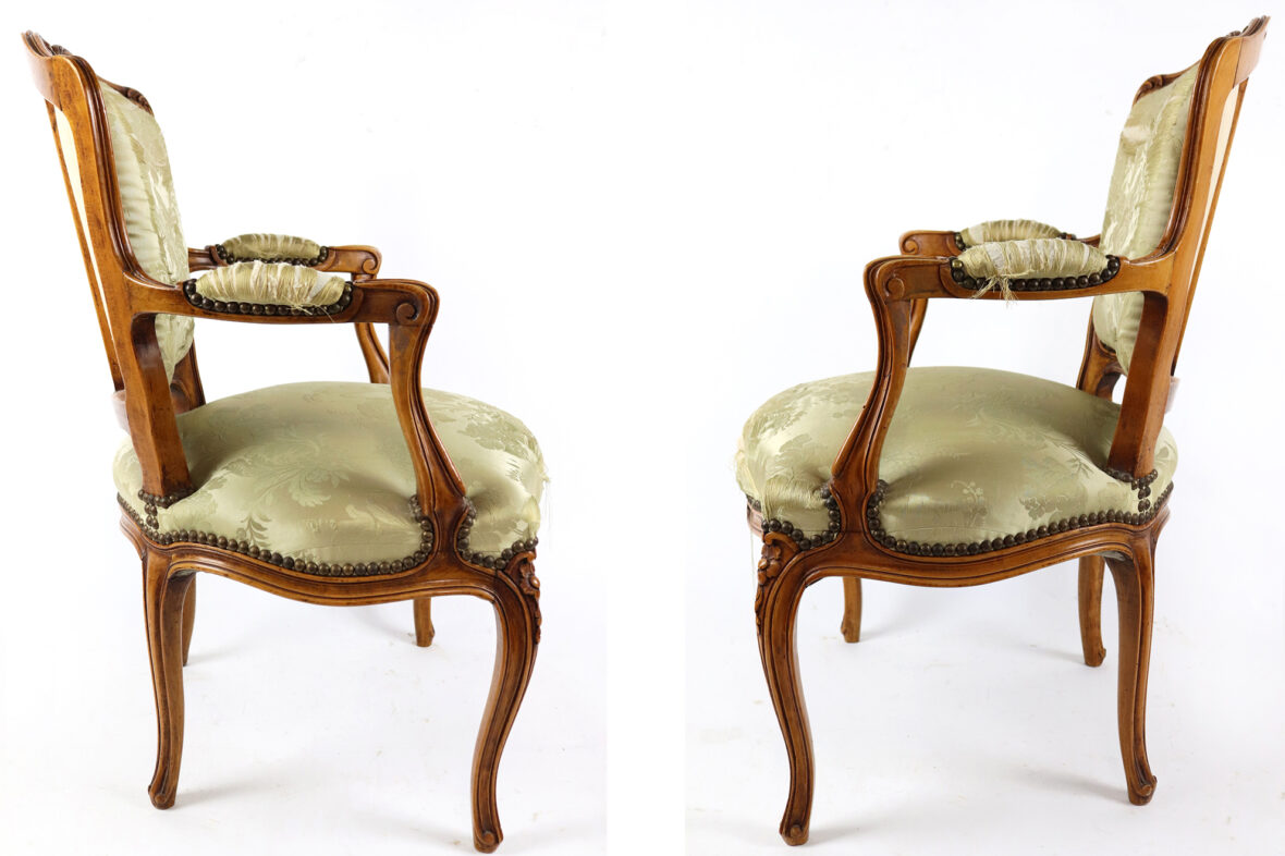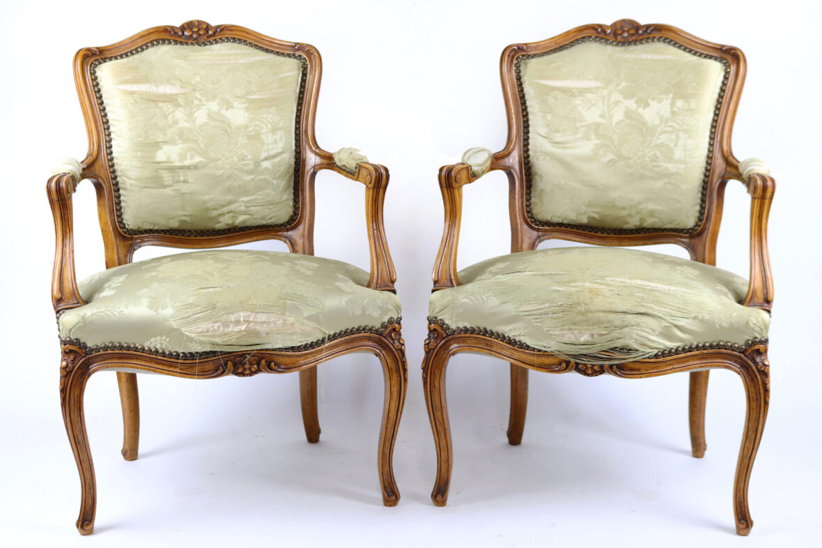 Paire de fauteuils de style Louis XV en bois naturel mouluré et sculpté à décor de fleurettes. Les accotoirs en coup de fouet. Garniture de soie verte à motif floral. (Usures et manques à la garniture).