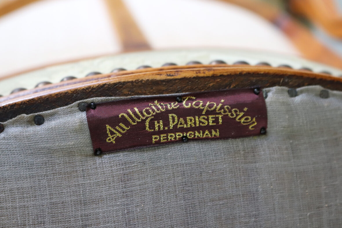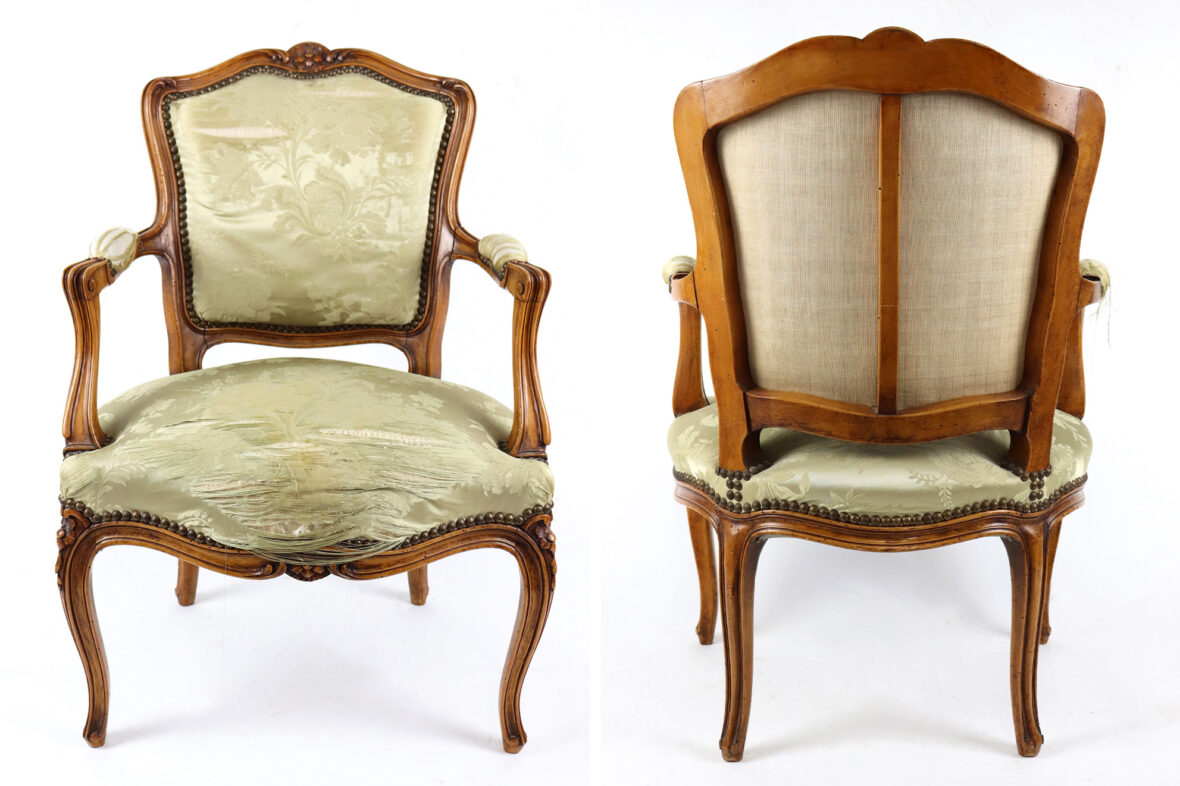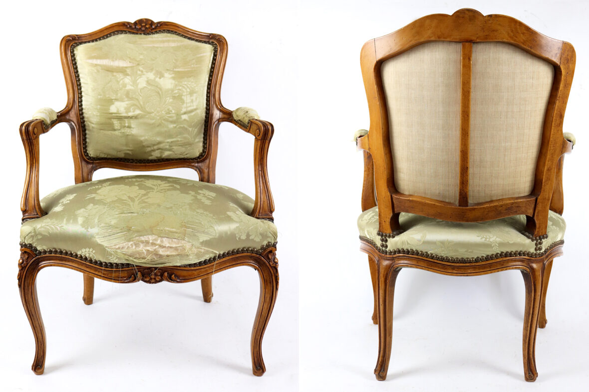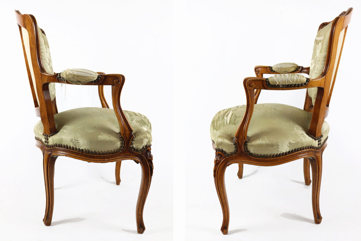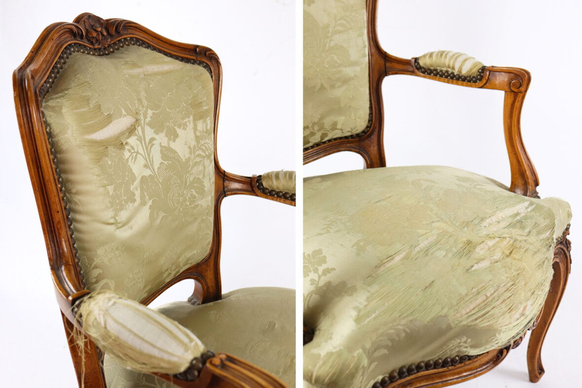 Paire de fauteuils de style Louis XV en bois naturel mouluré et sculpté à décor de fleurettes. Les accotoirs en coup de fouet. Garniture de soie verte à motif floral. (Usures et manques à la garniture).