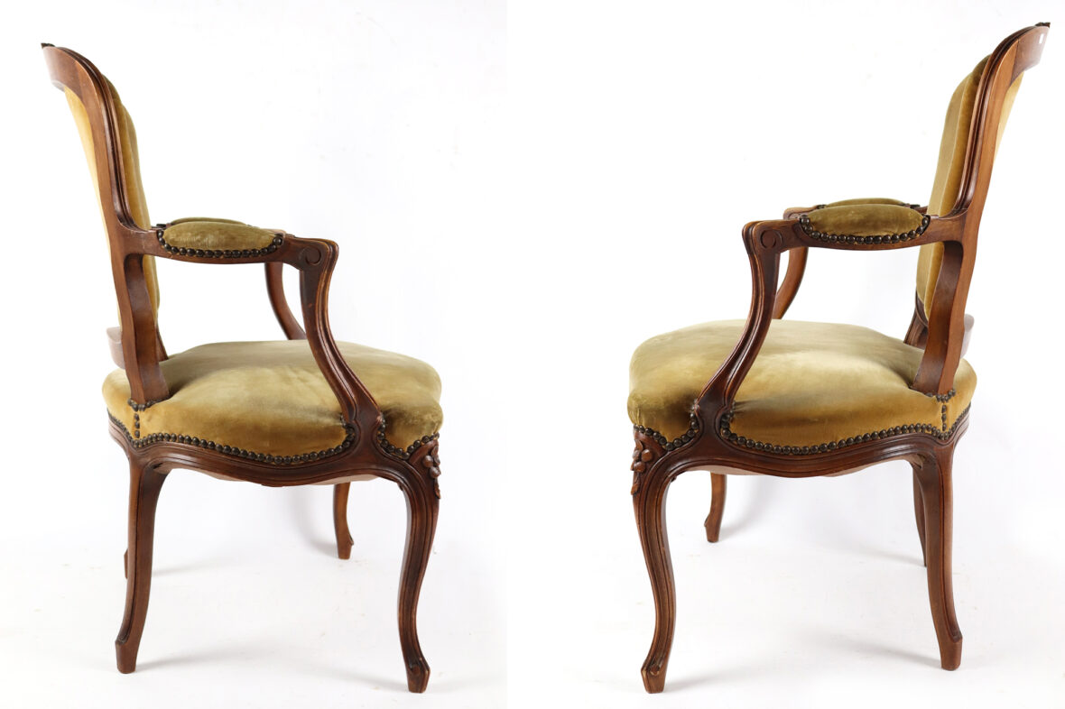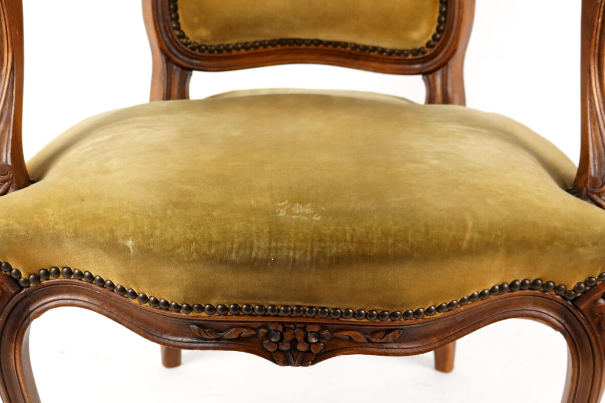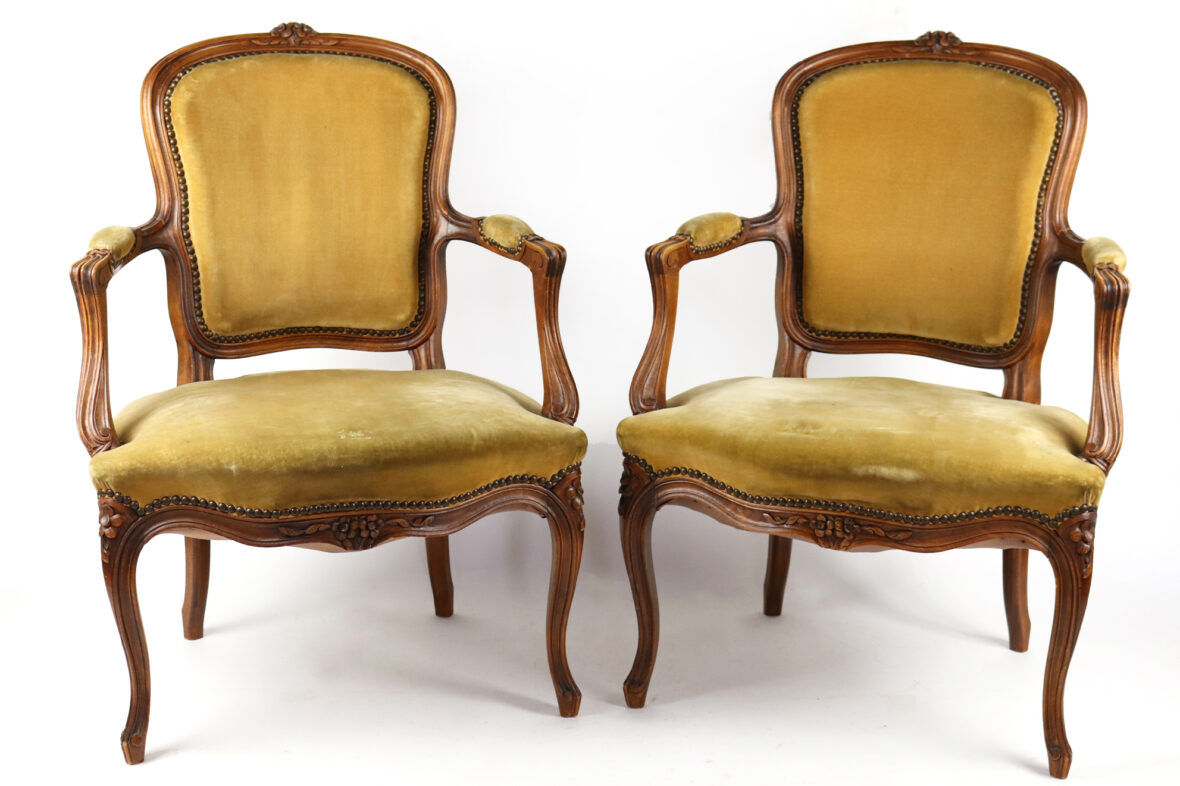 Paire de fauteuils de style Louis XV en bois naturel mouluré et sculpté à décor de fleurettes. Les accotoirs en coup de fouet. Garniture de velours vert (insolé).