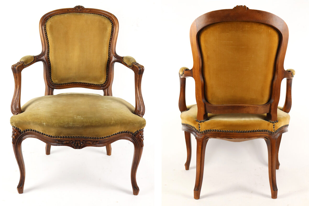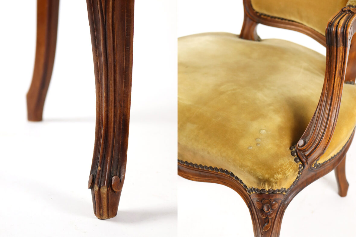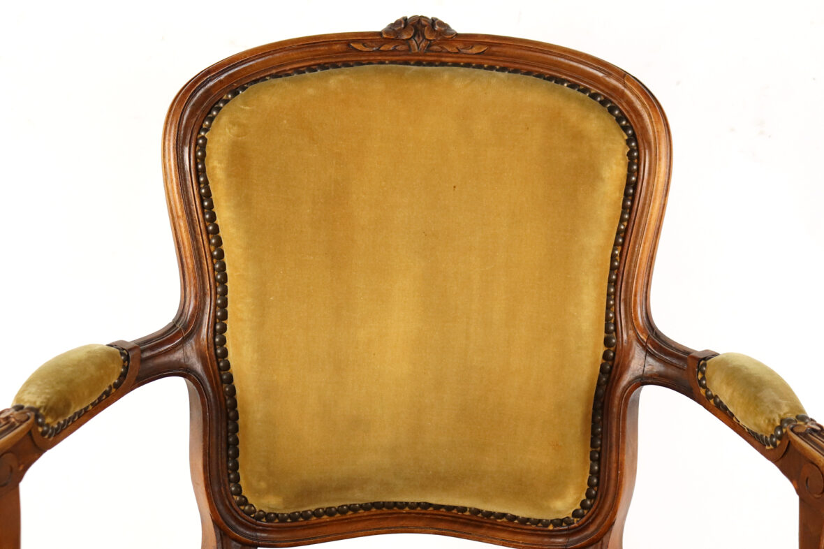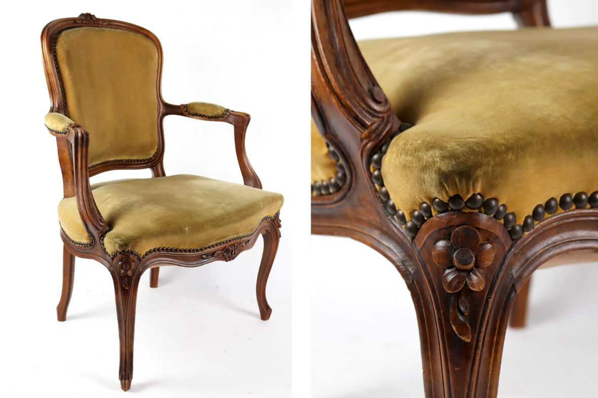 Paire de fauteuils de style Louis XV en bois naturel mouluré et sculpté à décor de fleurettes. Les accotoirs en coup de fouet. Garniture de velours vert (insolé).