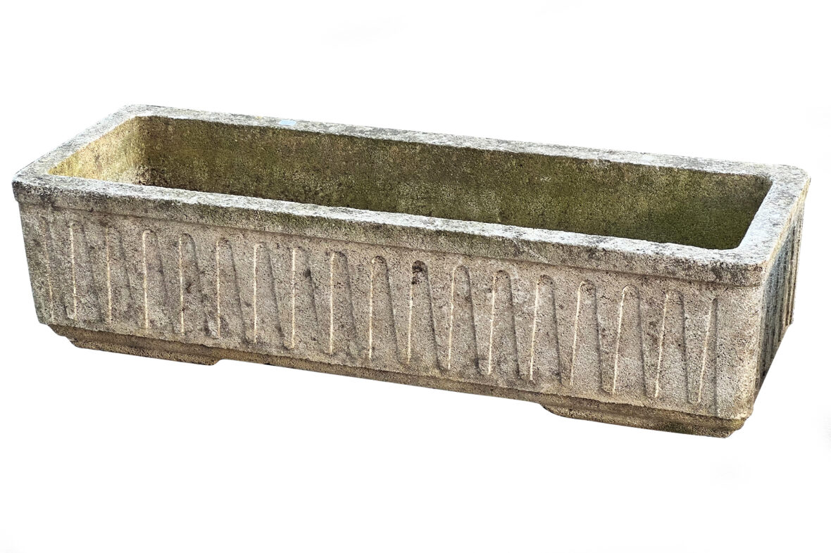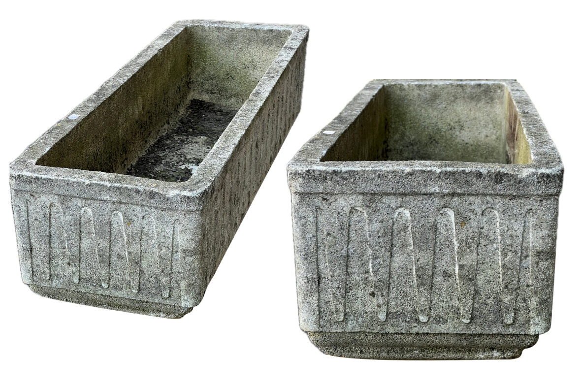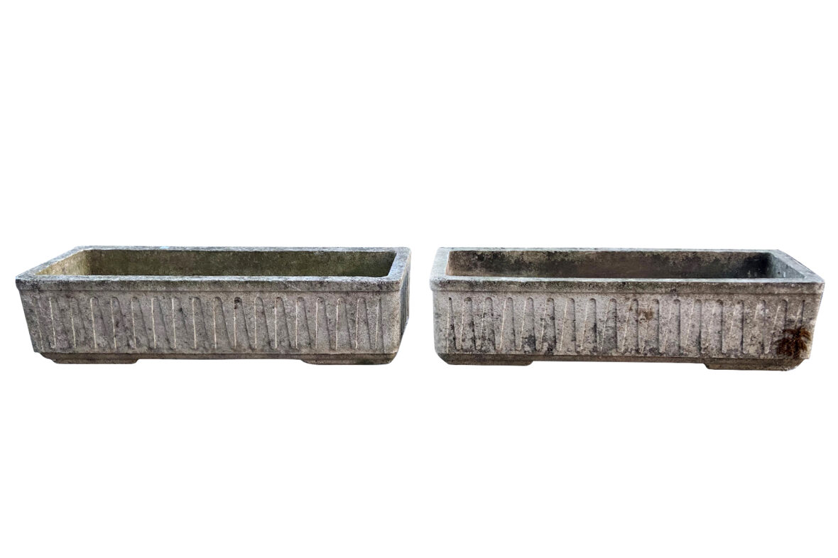 Paire de jardinières rectangulaires en béton moulé à motif de peigné sur les côtés.
