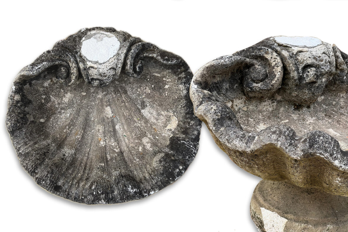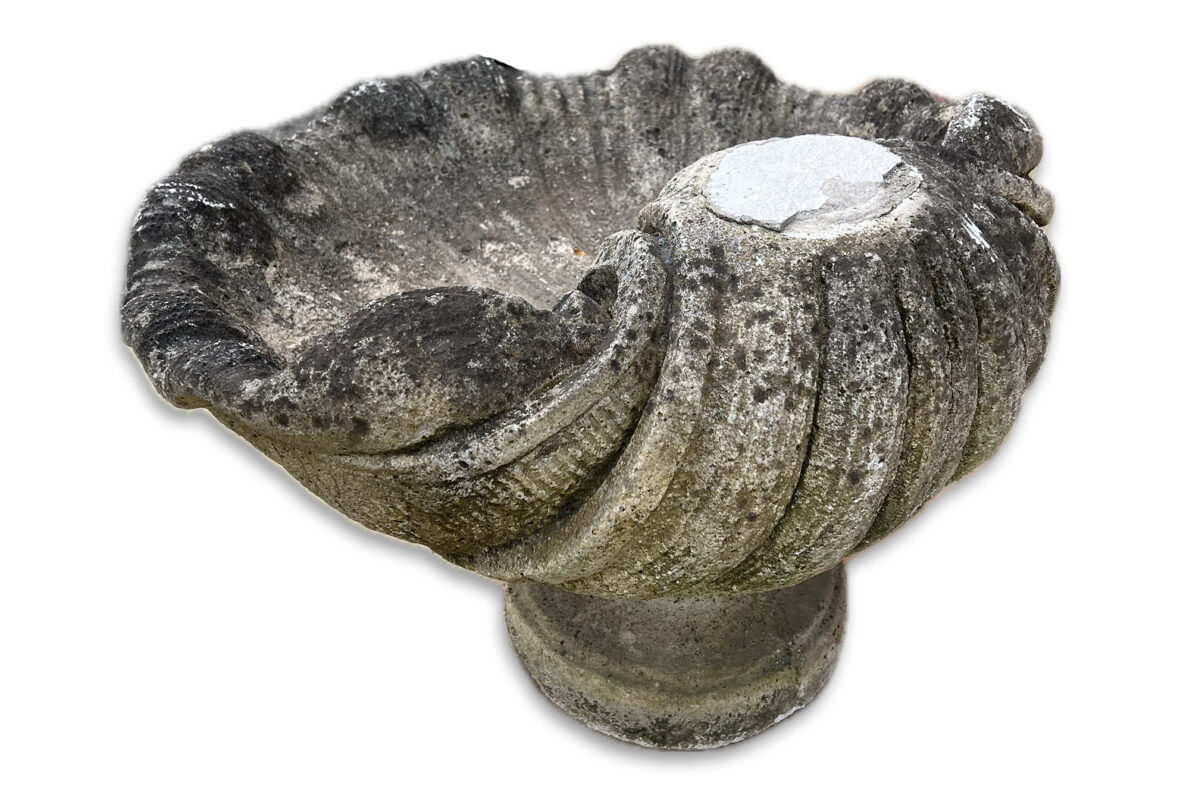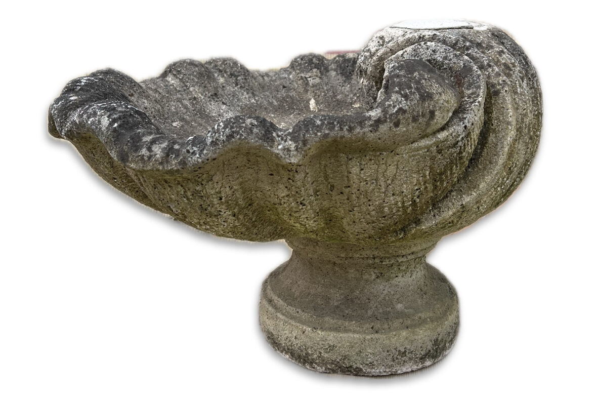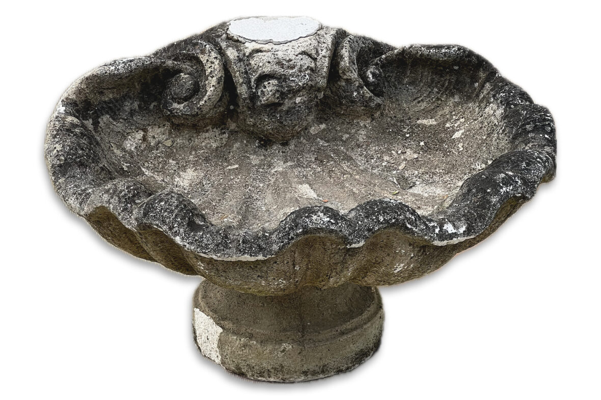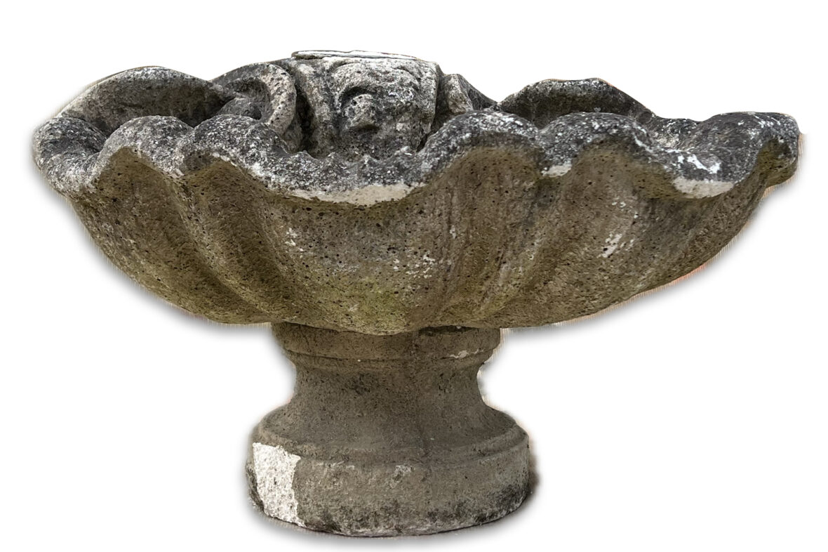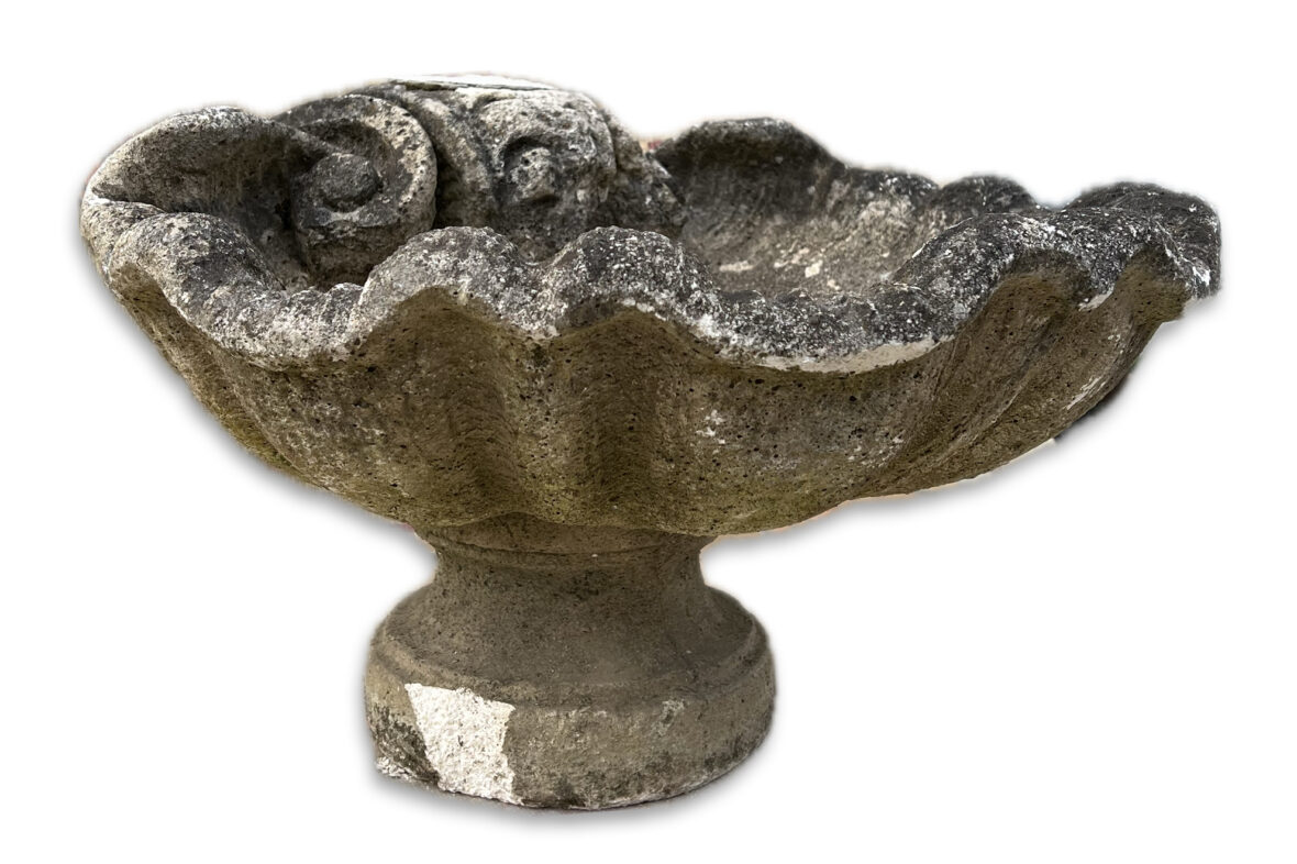 On y joint une vasque de jardin en pierre reconstituée en forme de coquille.