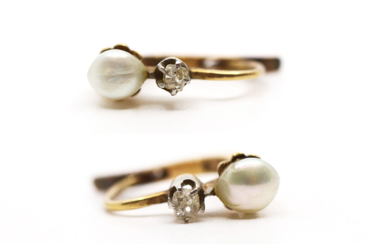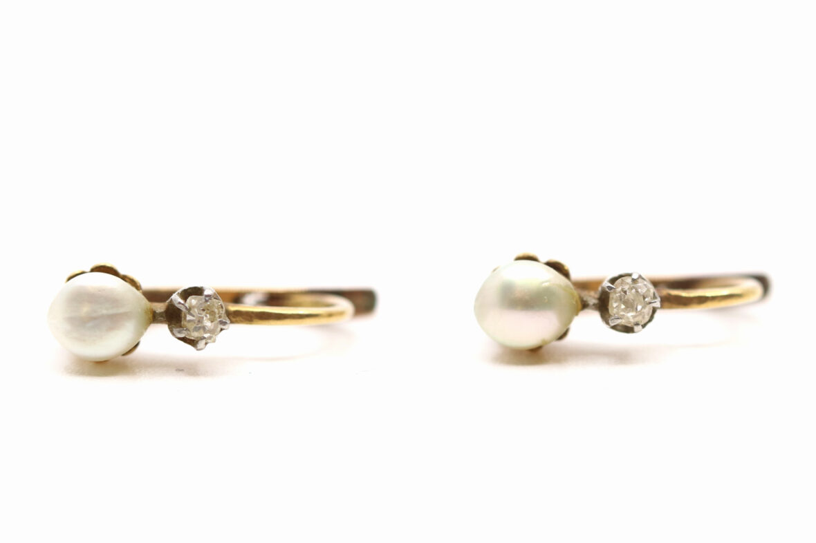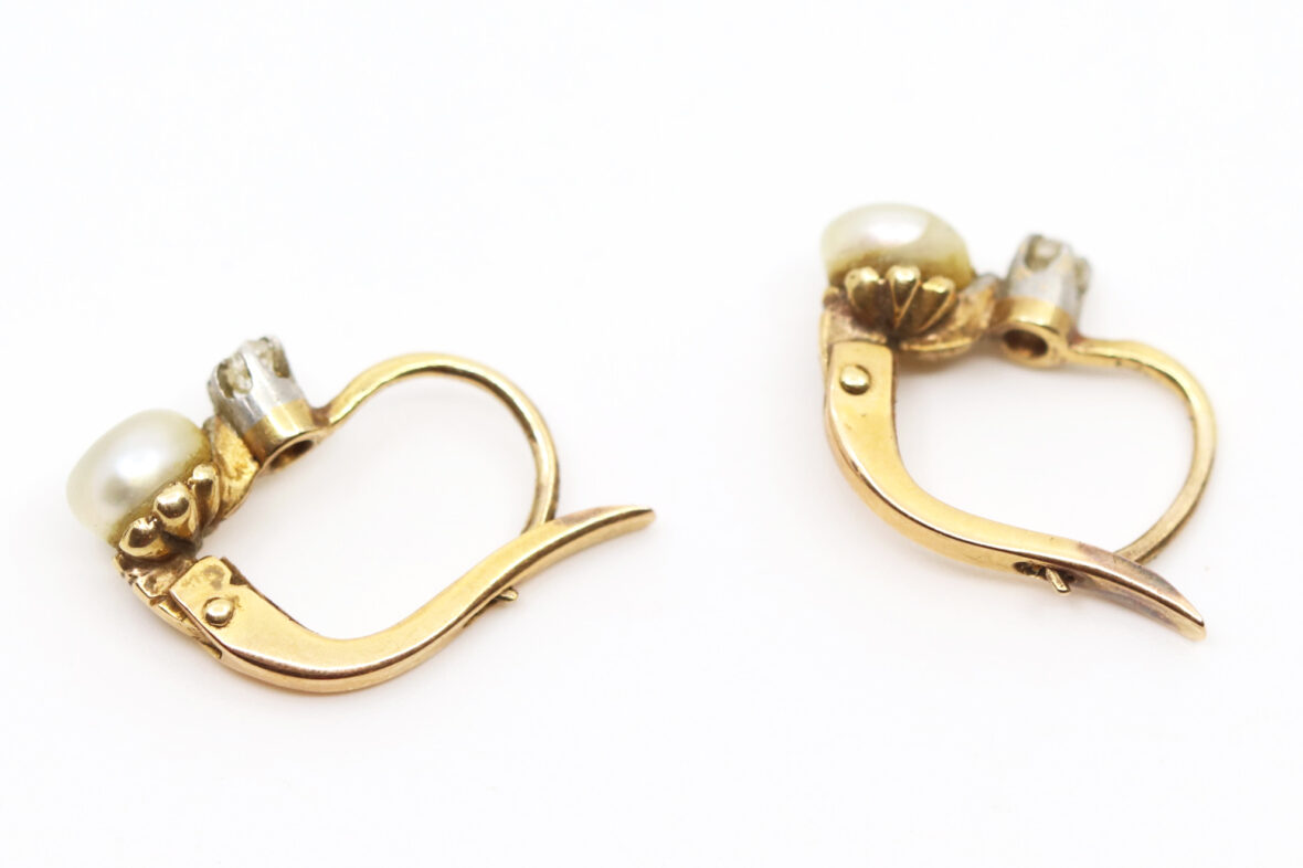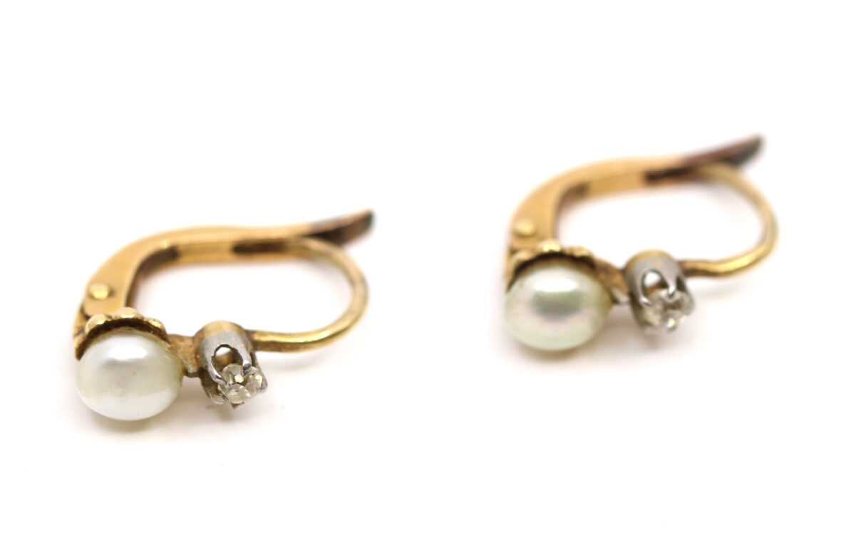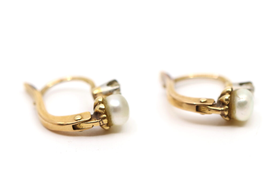 Paire de petites boucles d’oreilles en or jaune ornée d’une perle et d’une petite rose.