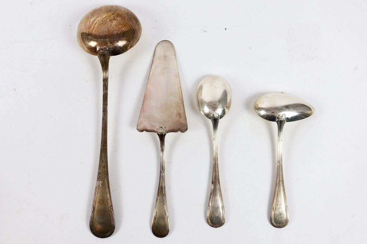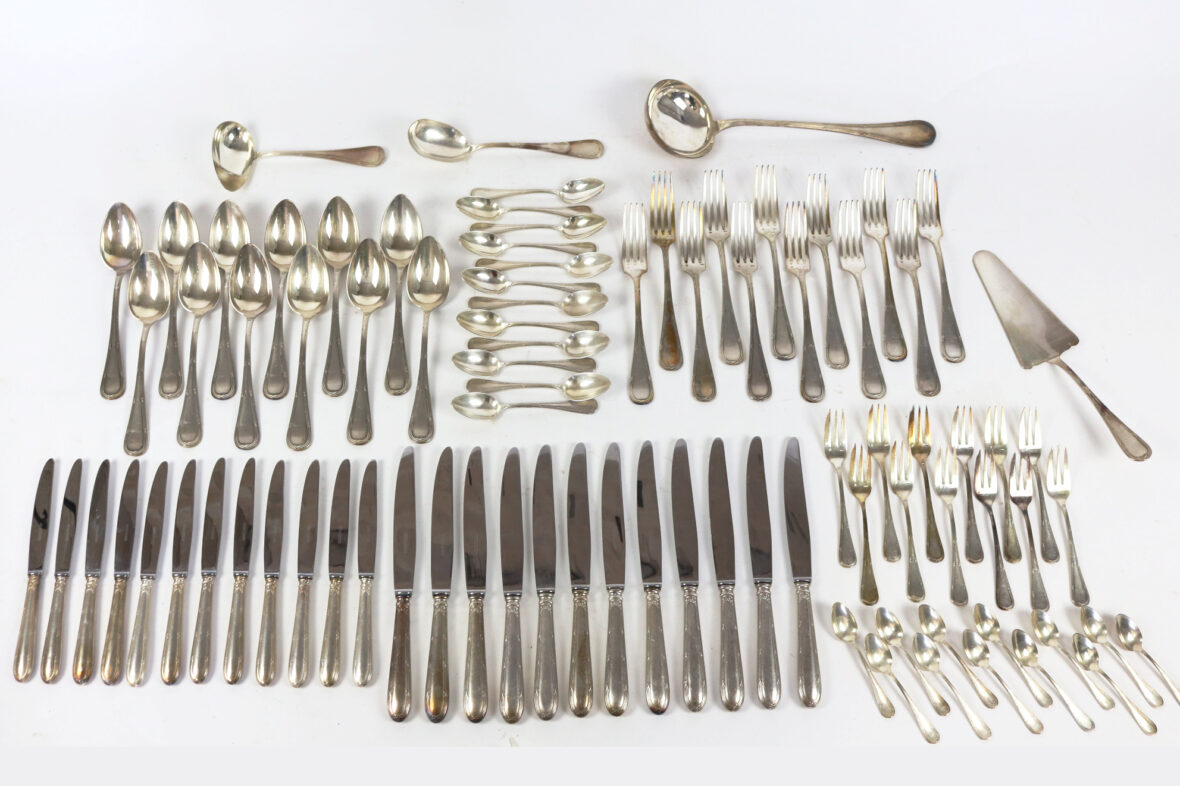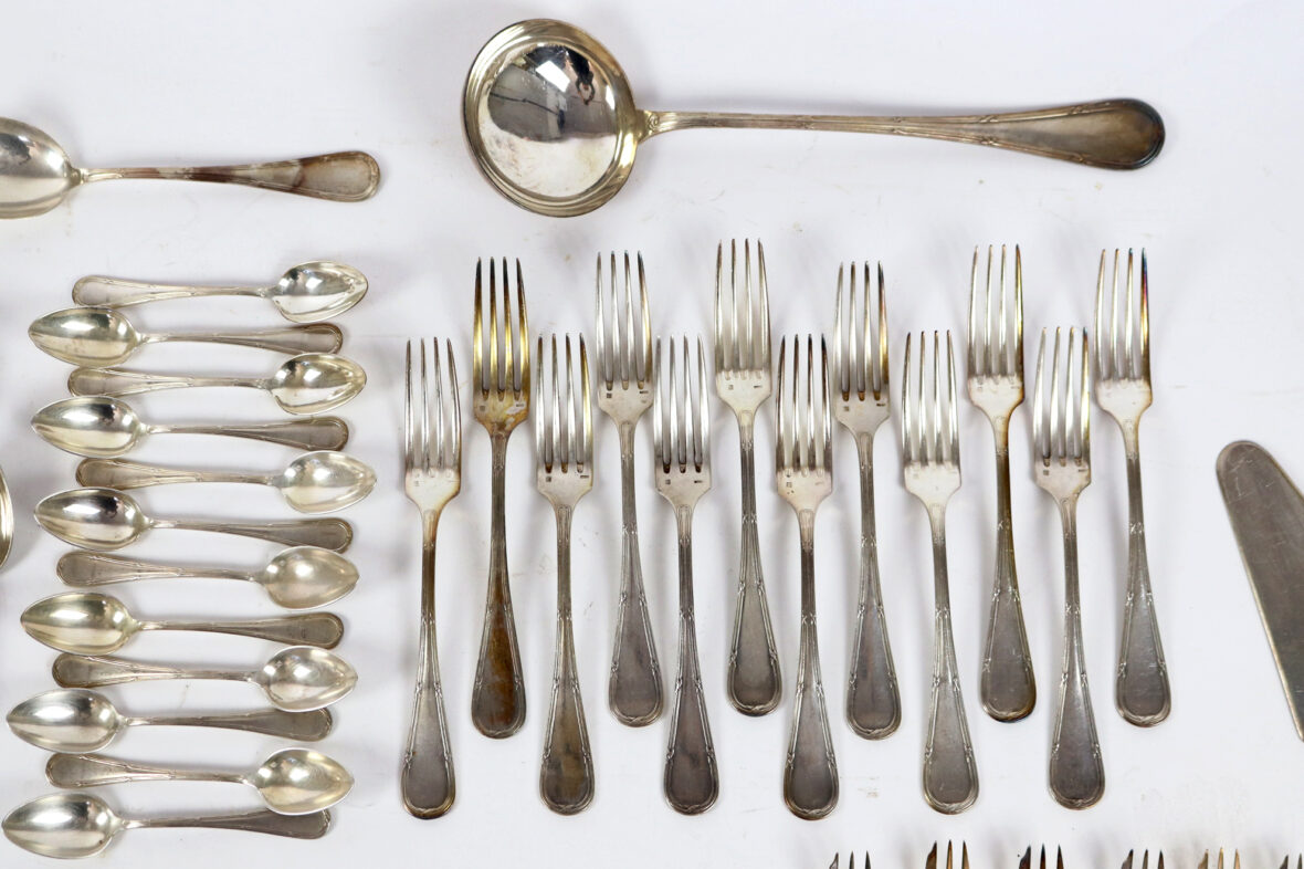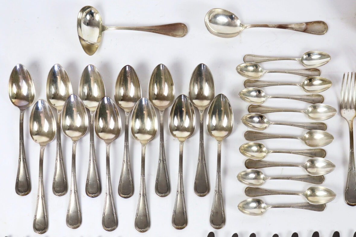 Partie de ménagère en métal argenté à décor de filet enrubanné comprenant 12 cuillères à café, 12 petites cuillères, 12 cuillères à soupe, 12 fourchettes, 12 fourchettes à dessert, 12 couteaux à fromage, 12 couteaux de table, une pelle à tarte, une louche, une cuillère à sauce gras maigre et une cuillère à glace.