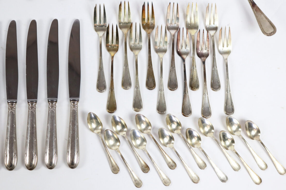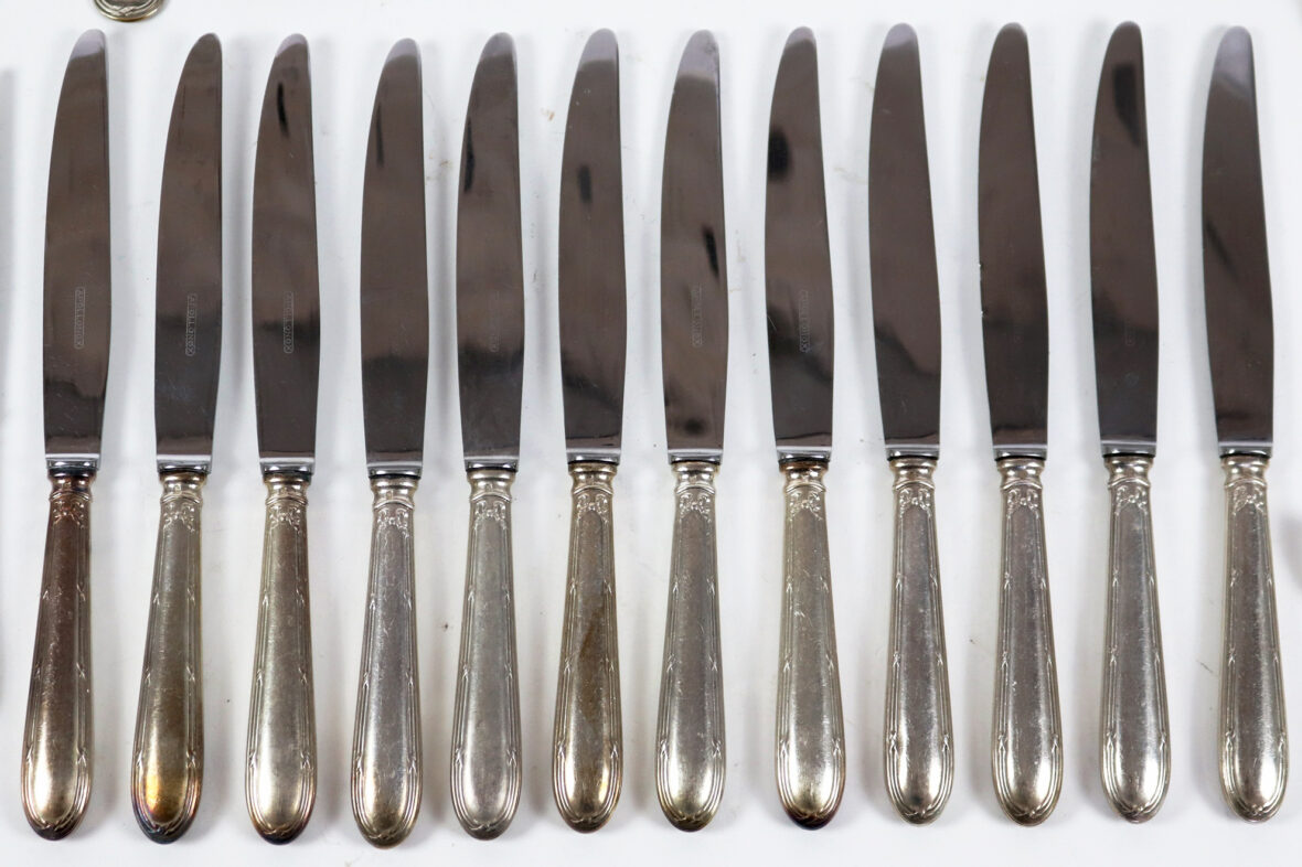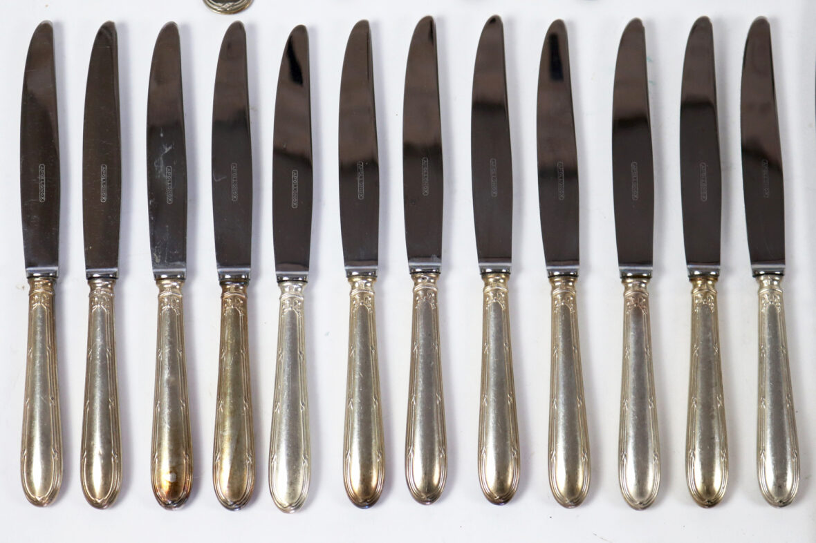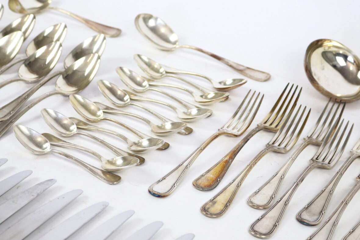Partie de ménagère en métal argenté à décor de filet enrubanné comprenant 12 cuillères à café, 12 petites cuillères, 12 cuillères à soupe, 12 fourchettes, 12 fourchettes à dessert, 12 couteaux à fromage, 12 couteaux de table, une pelle à tarte, une louche, une cuillère à sauce gras maigre et une cuillère à glace.