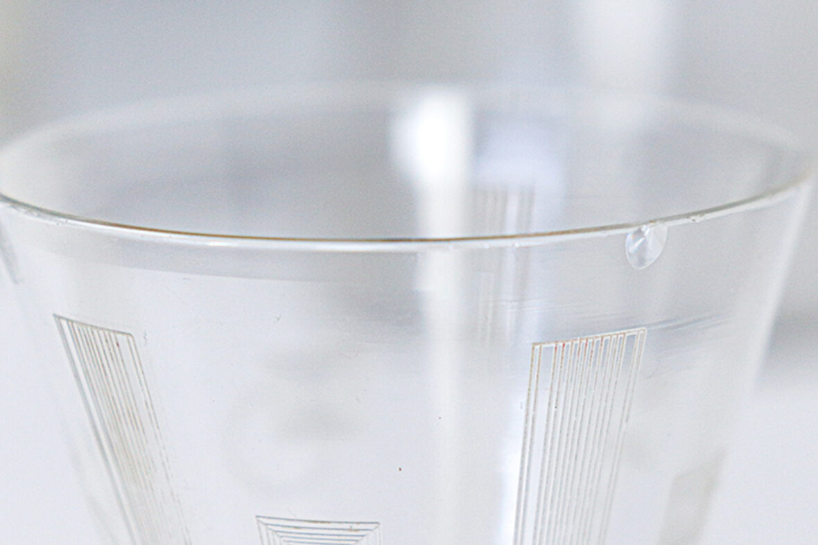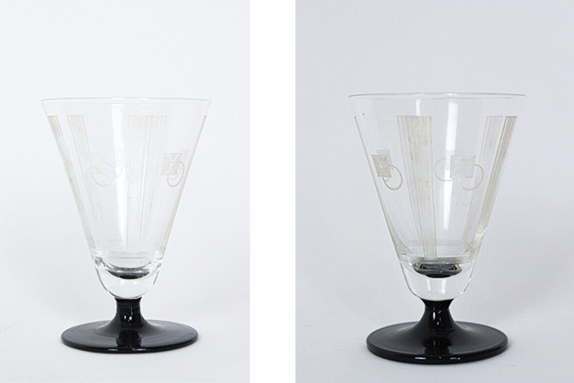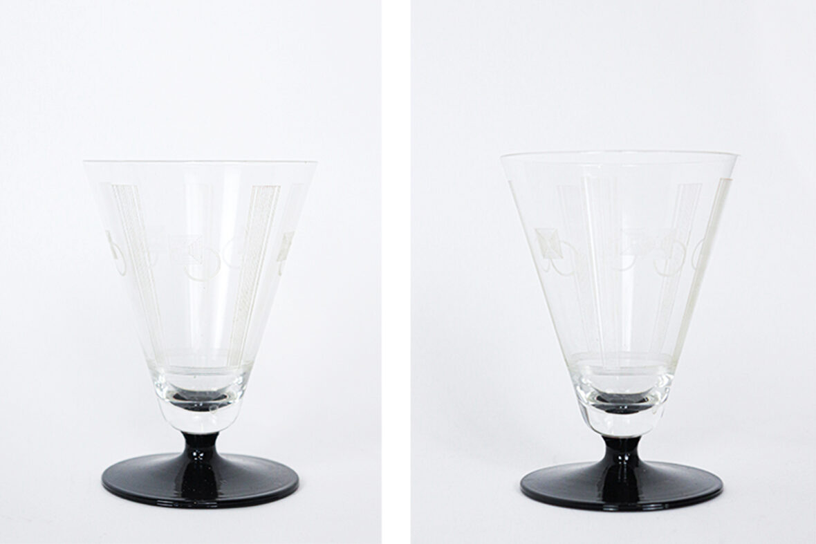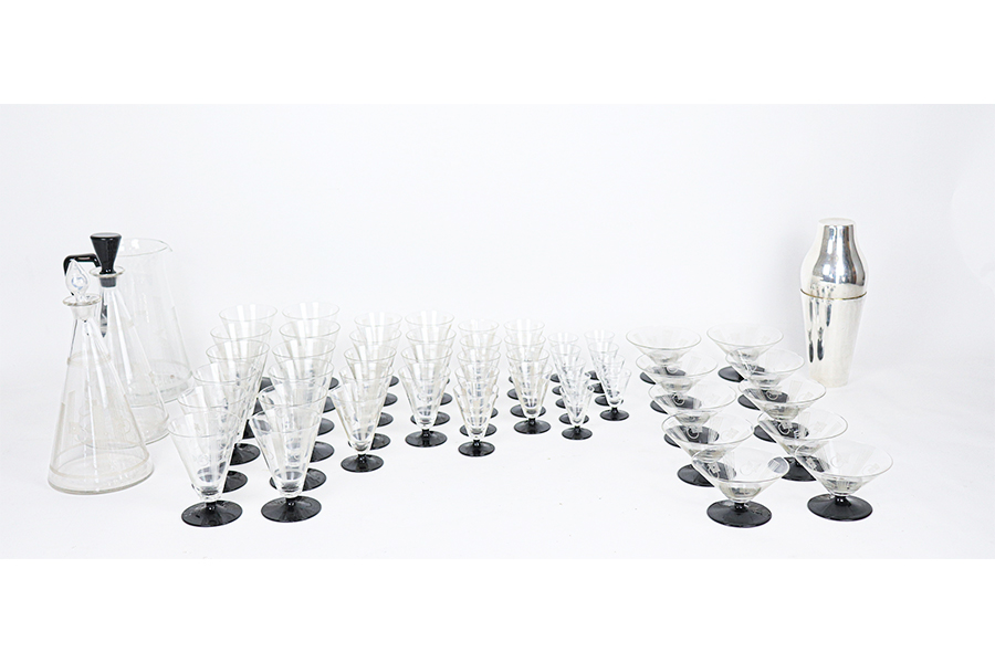Partie de service de verres de style Art Déco de forme conique à décor gravé de motifs géométriques, le pied en verre teinté noir, comprenant 12 verres à eau, 9 verres à vin rouge, 9 verres à vin blanc, 9 verres à liqueur, 10 coupes, 1 carafe à vin et un broc à eau. (Quelques égrenures. Manque le bouchon d’une des carafes à vin).