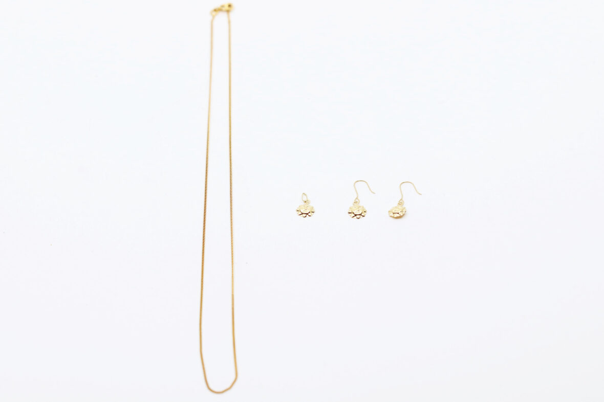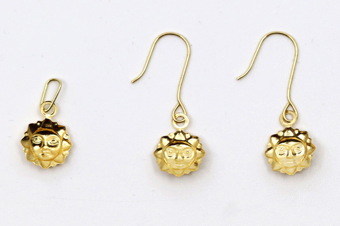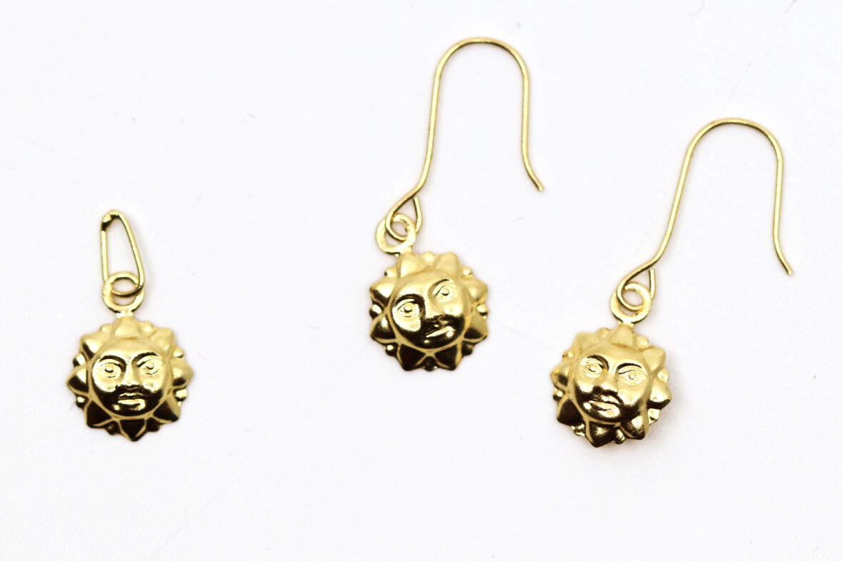 Parure d’enfant en or jaune comprenant une paire de boucles d’oreilles et un pendentif en forme de soleil. On y joint une chaîne en métal doré.