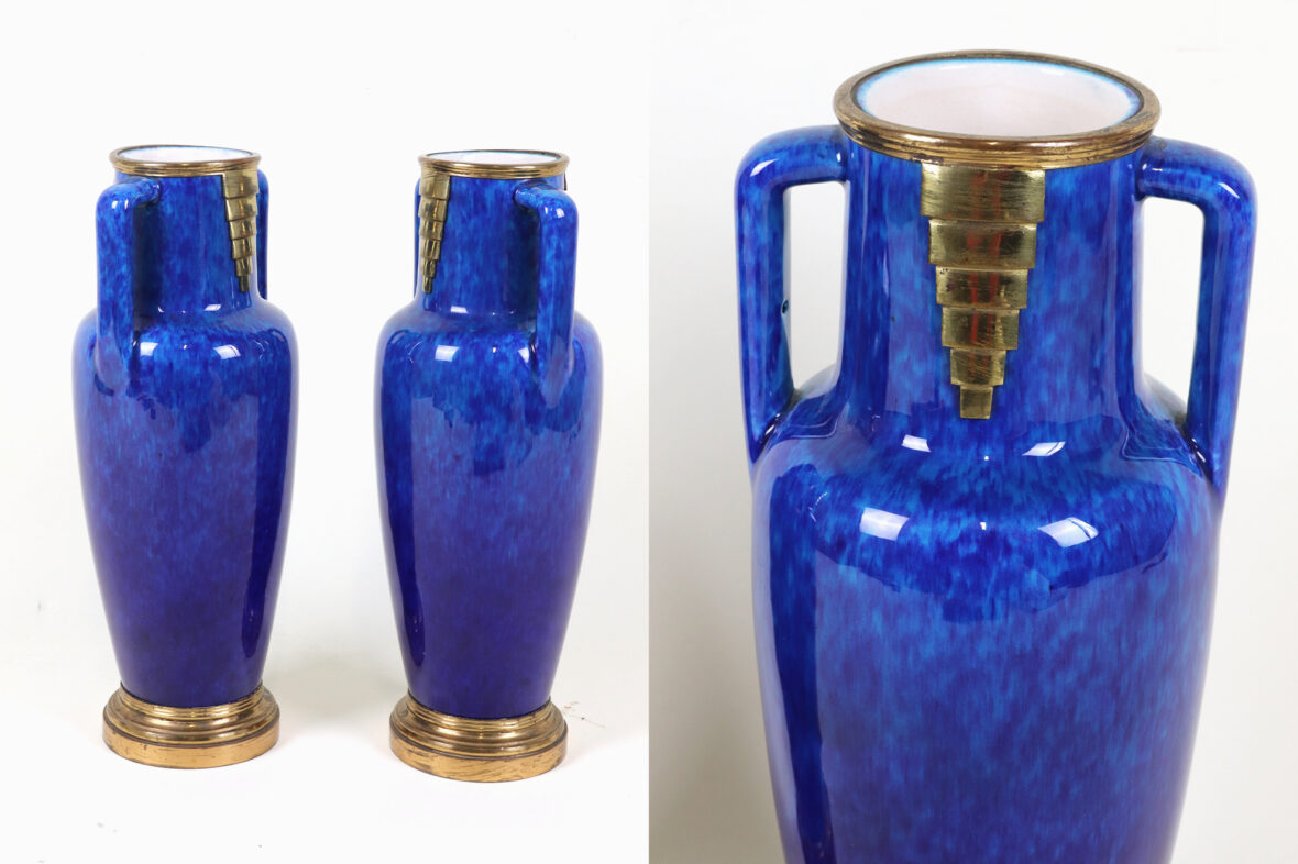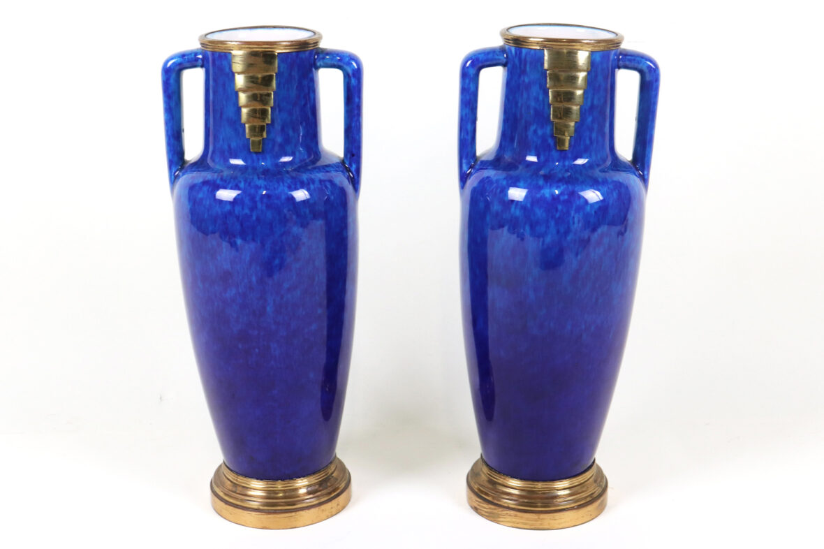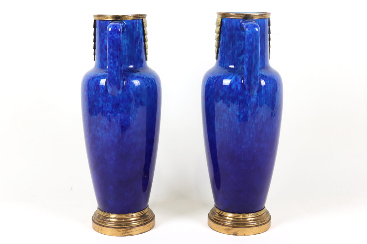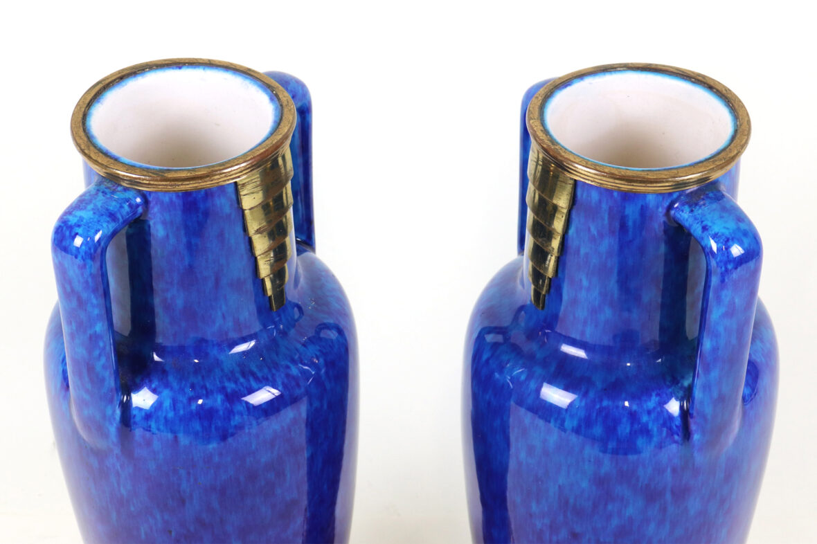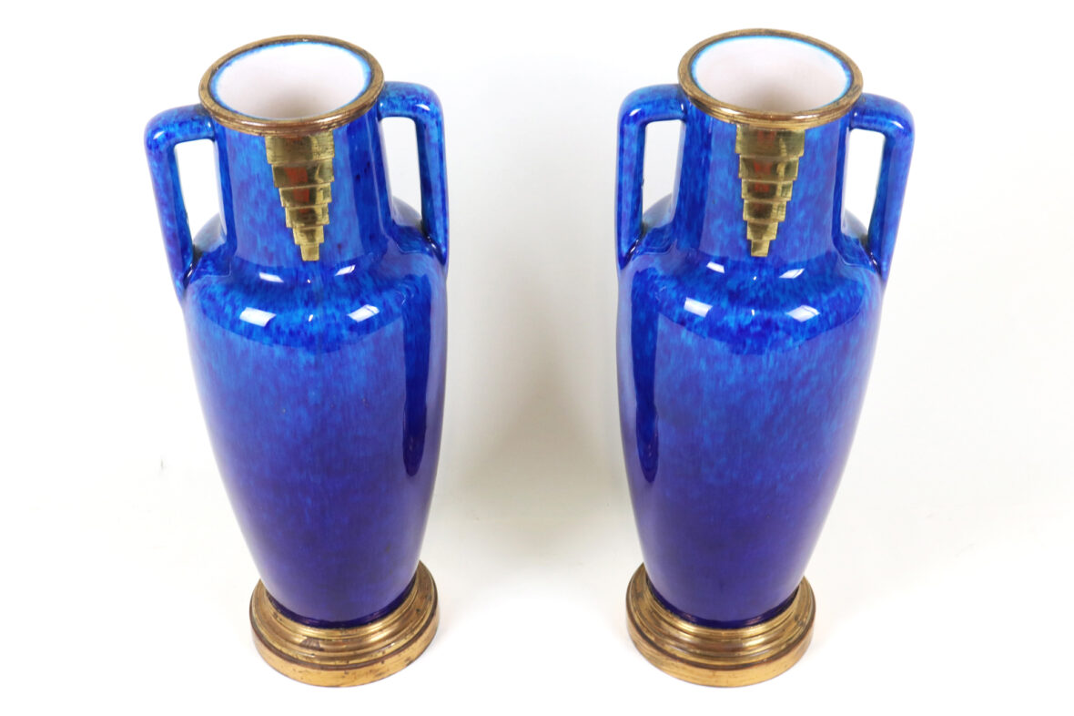Paire de vases balustres à deux anses avec monture en métal doré. Épreuve en faïence émaillée bleu jaspé à décor géométrique doré.