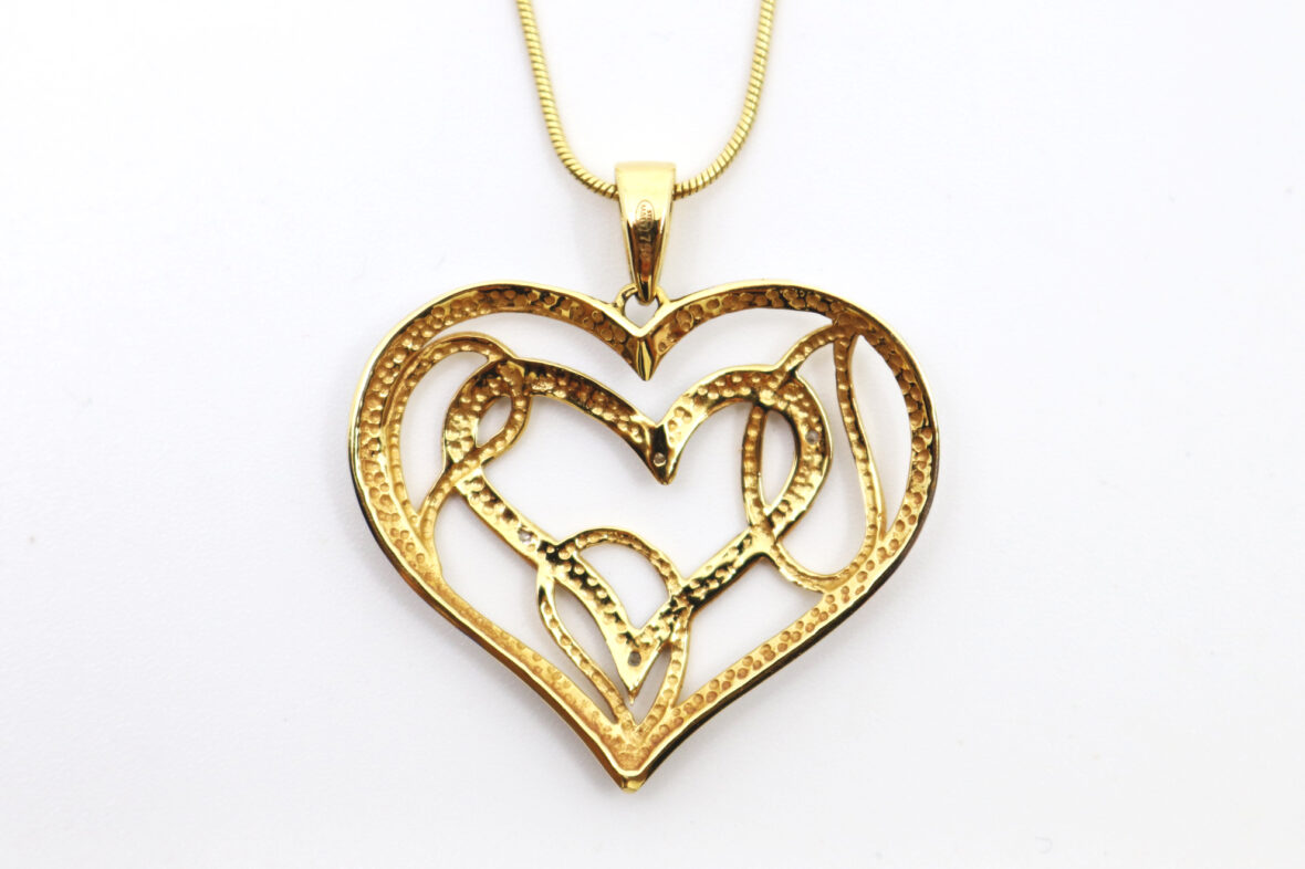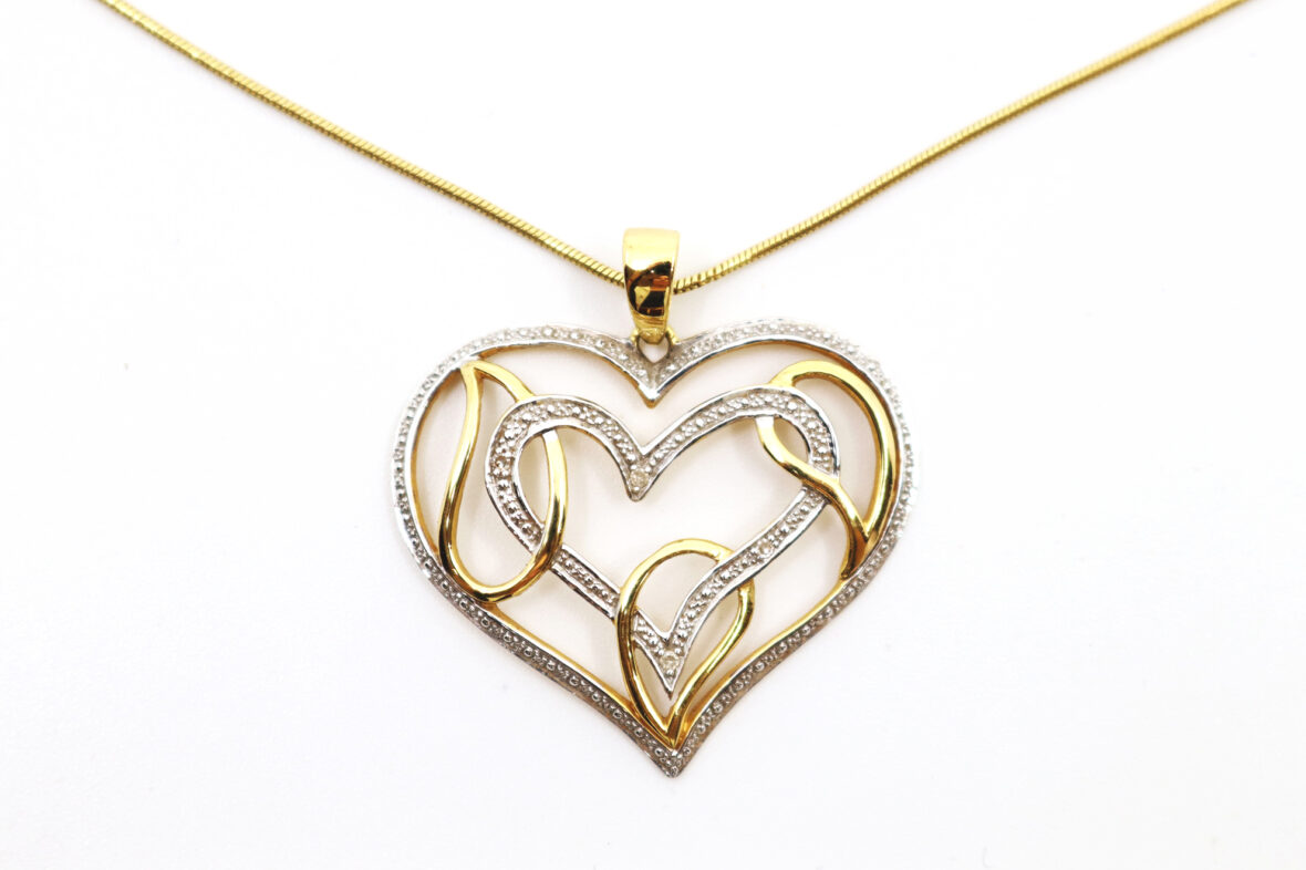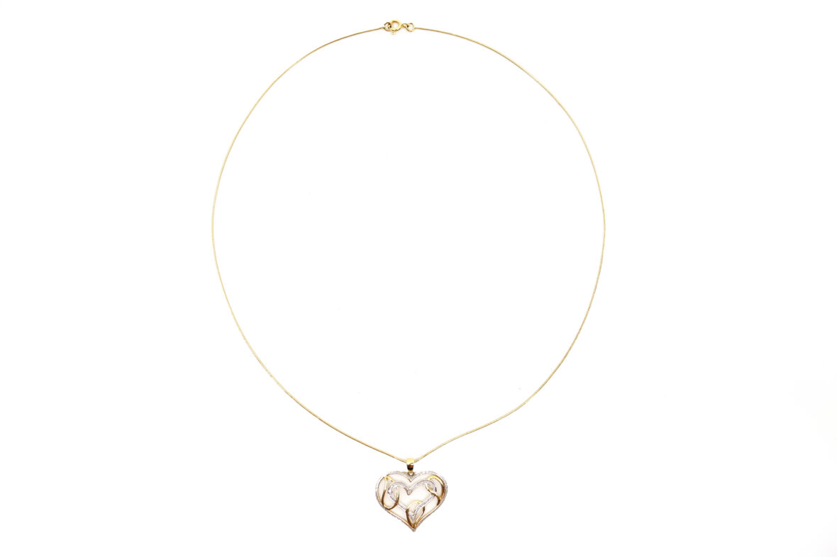 Pendentif cœur en or jaune et gris et sa chaîne en or jaune. Poids : 5,3 g