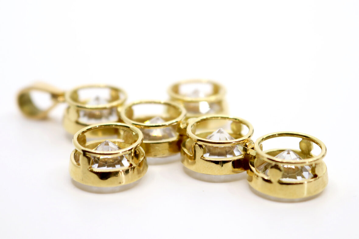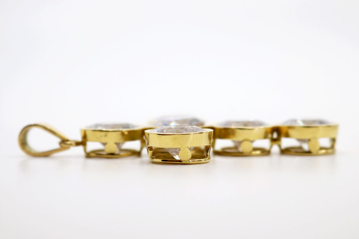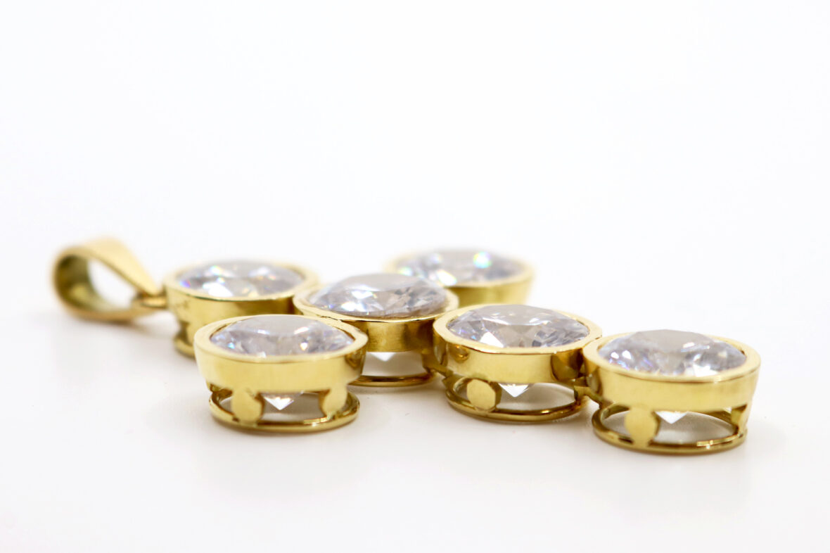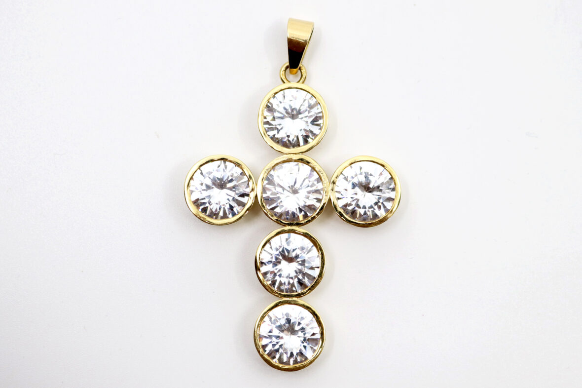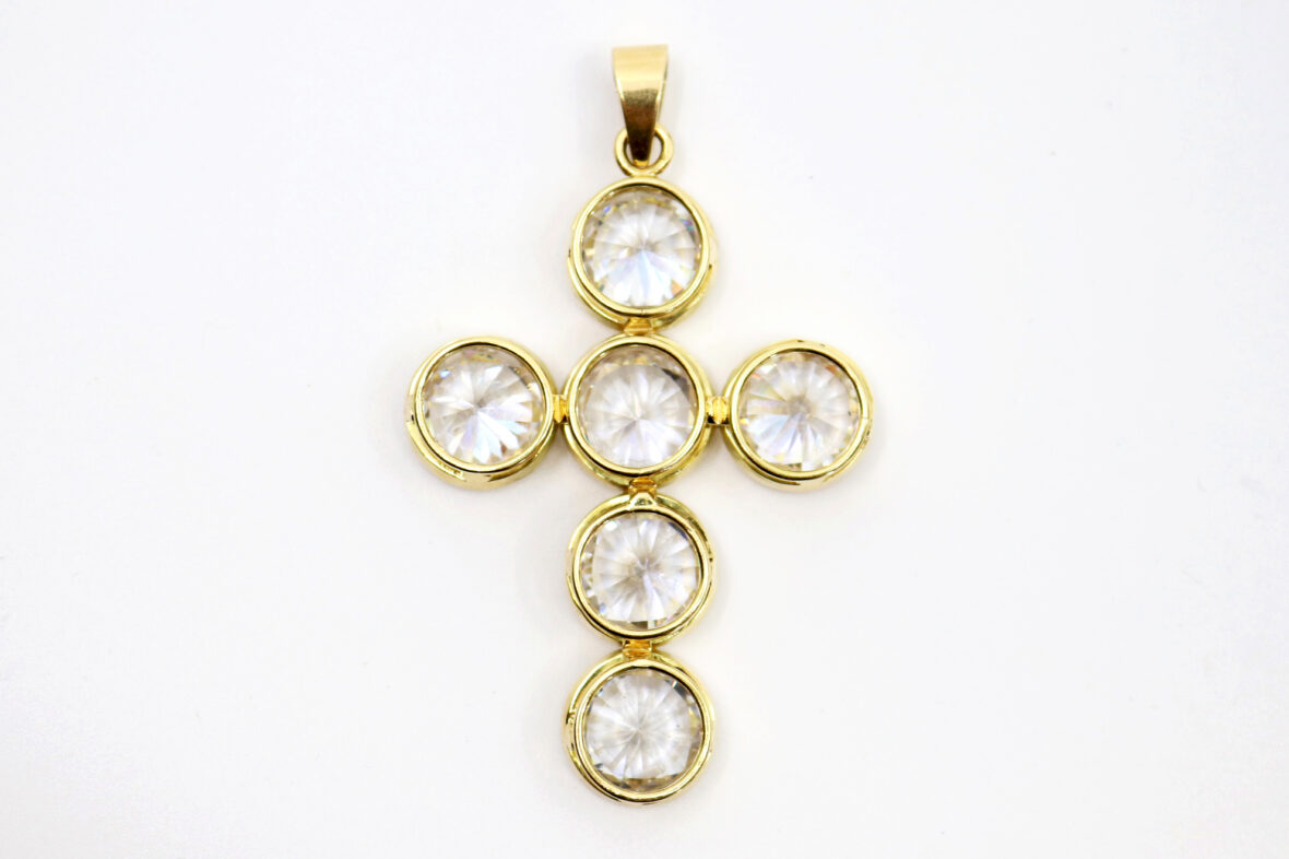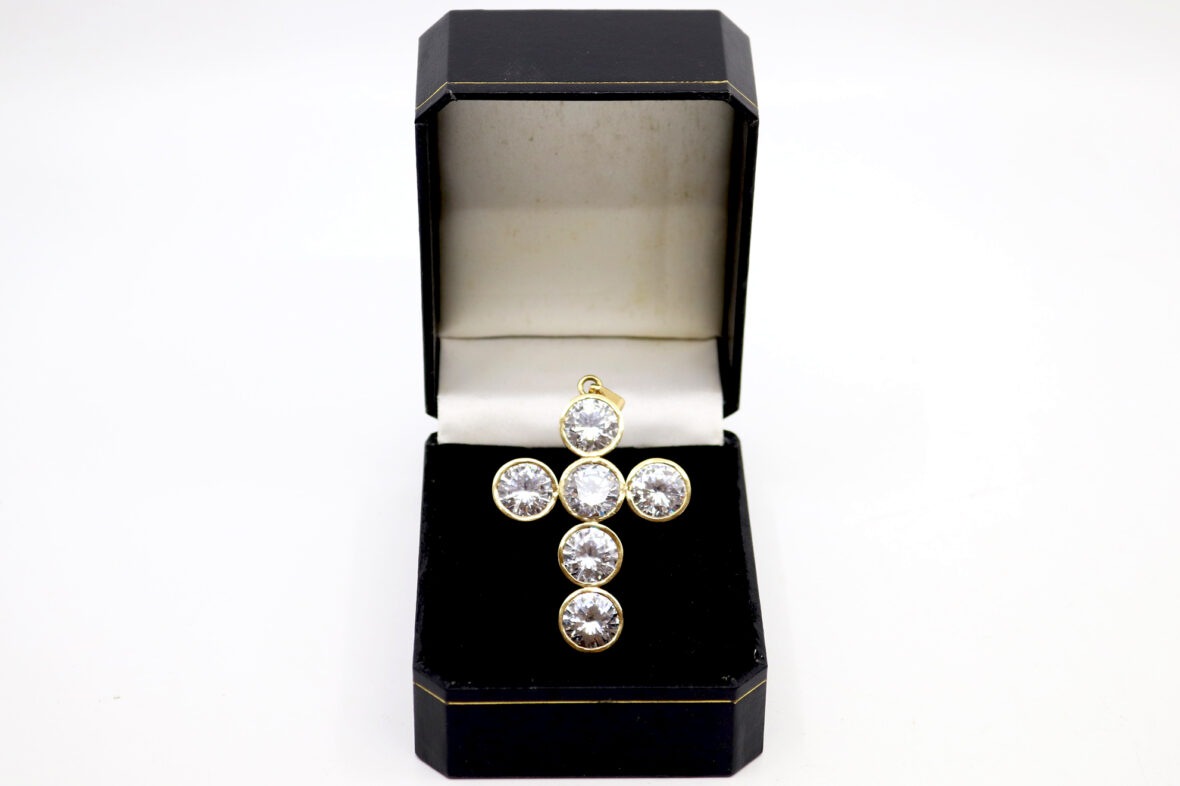 Pendentif croix en or jaune serti de 6 cristaux blancs. Poids brut : 32,2 g