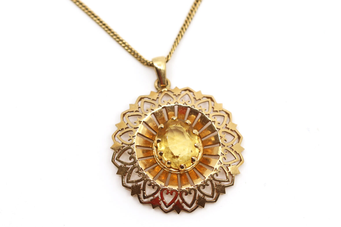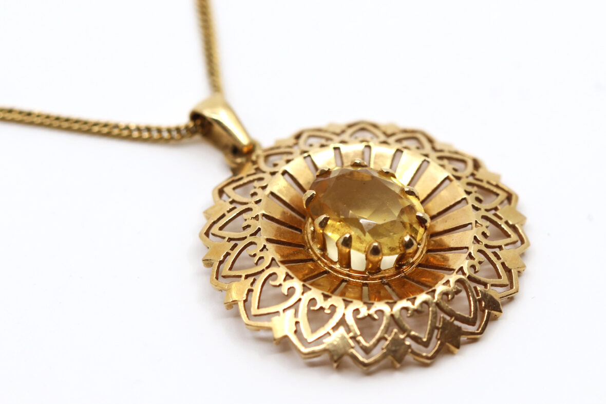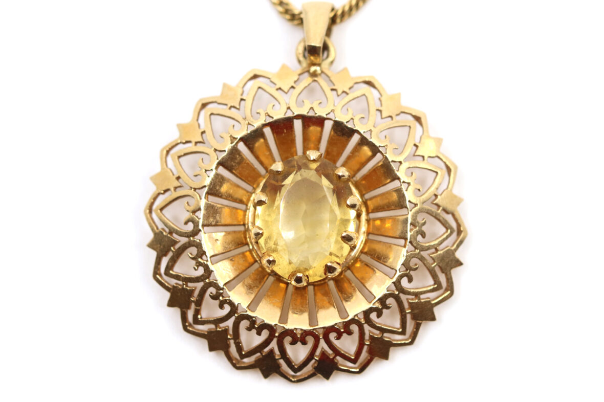 Pendentif en or jaune de forme circulaire à motifs ajourés rayonnants de cœurs et orné en son centre d’une citrine de taille ovale. Avec sa chaîne.