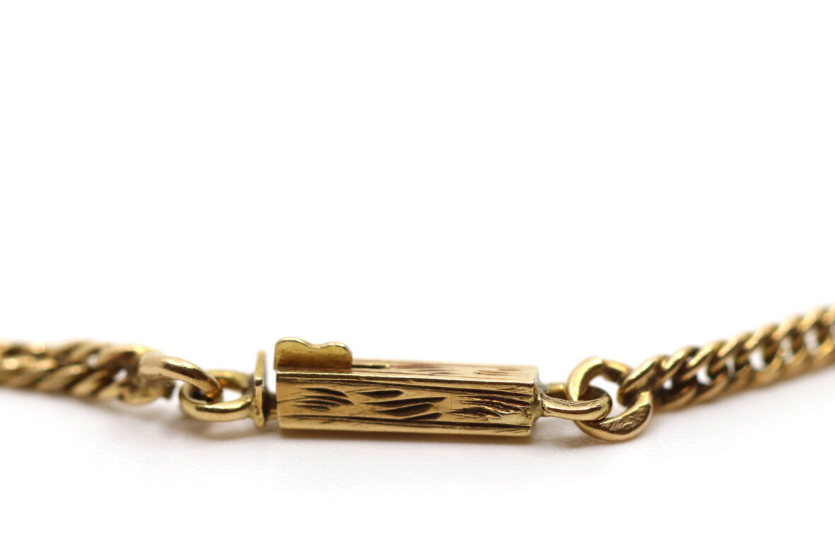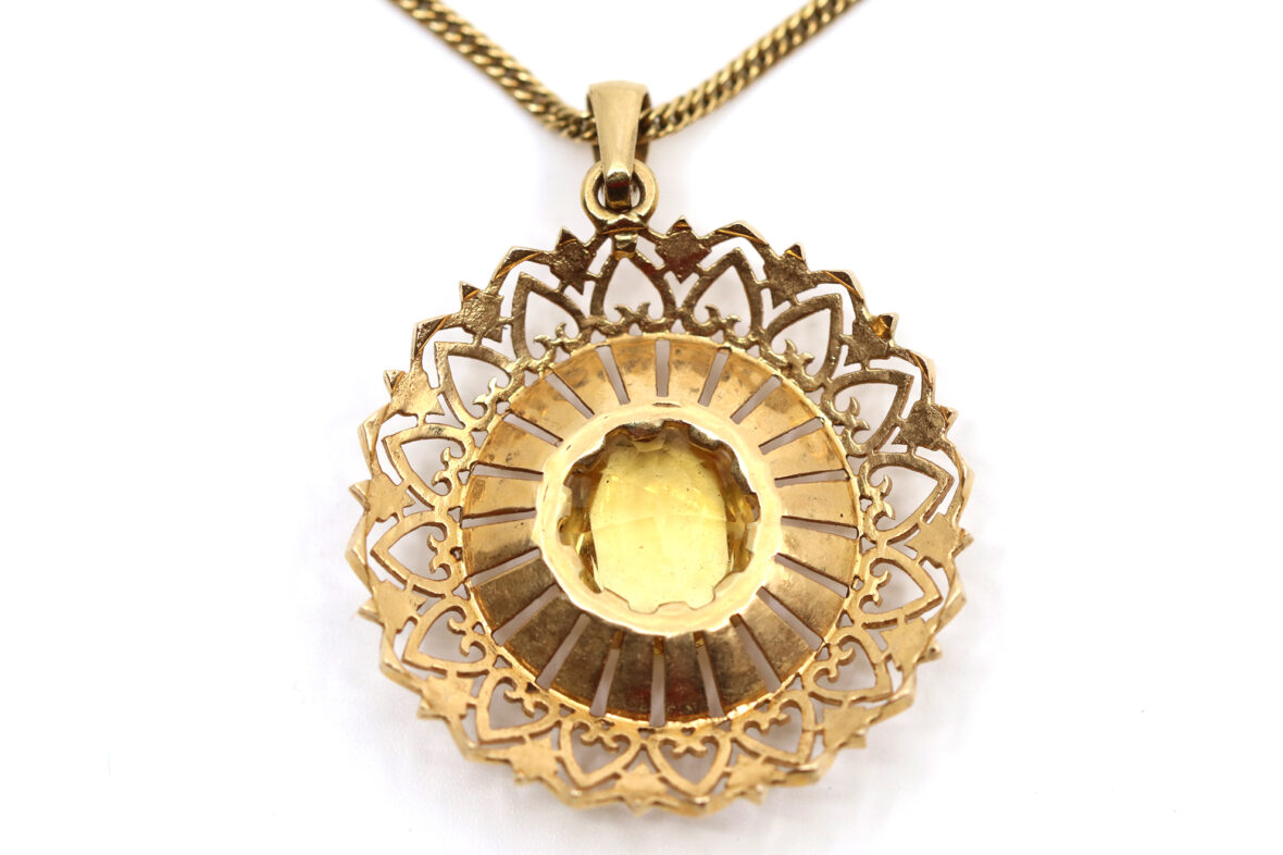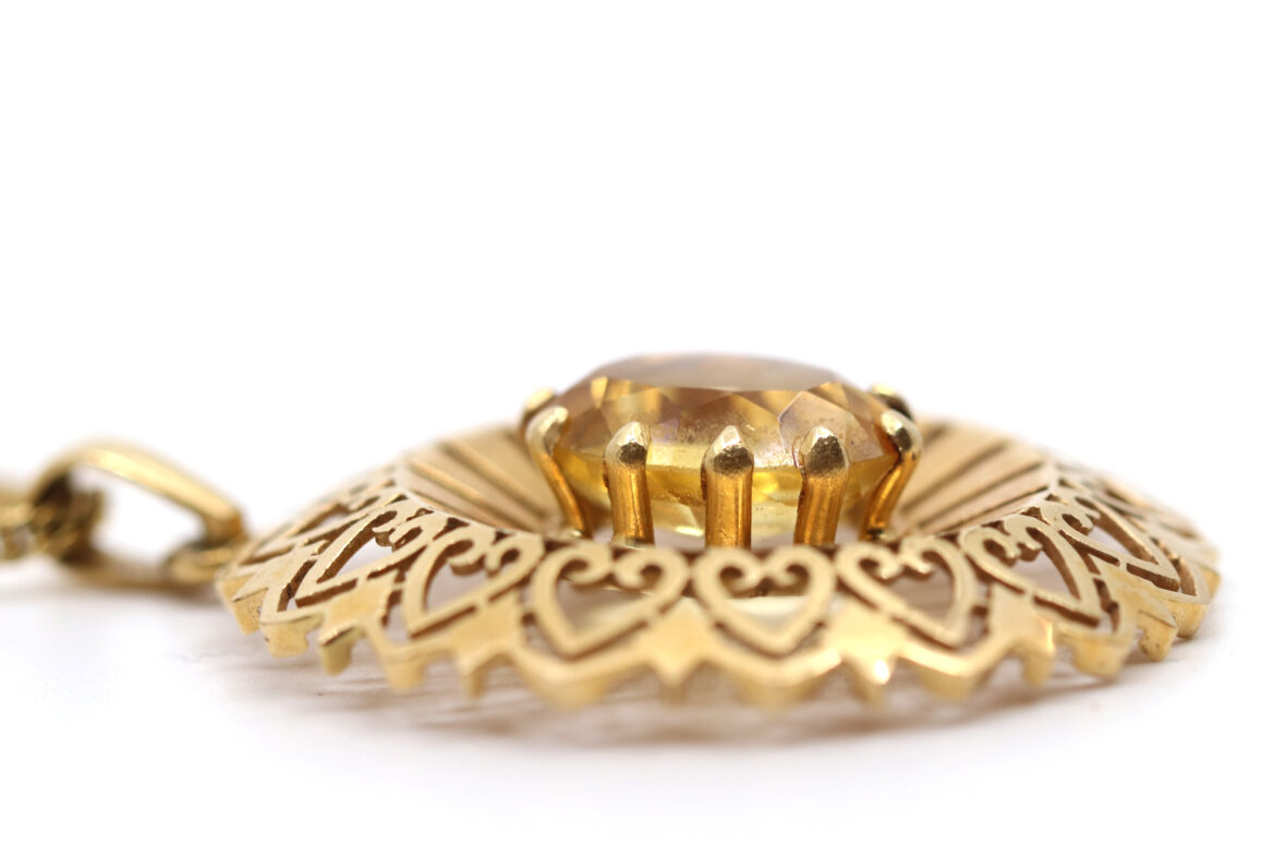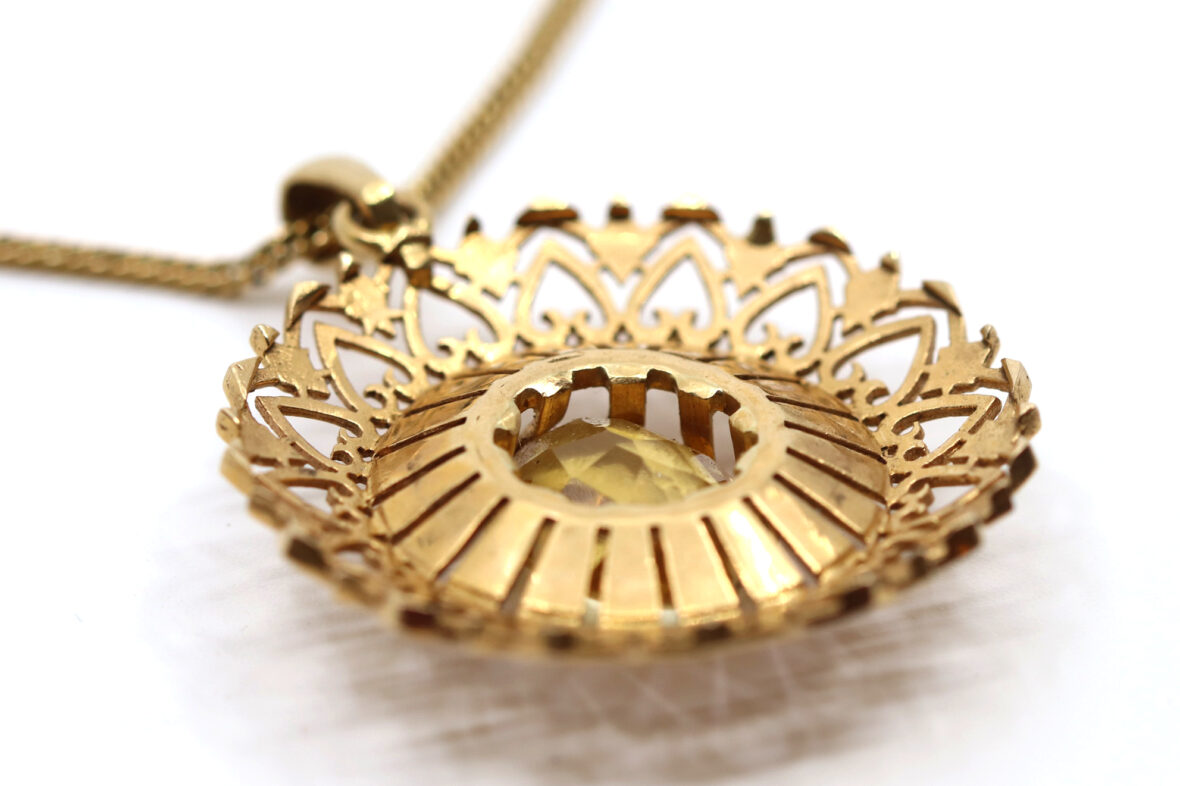 Pendentif en or jaune de forme circulaire à motifs ajourés rayonnants de cœurs et orné en son centre d’une citrine de taille ovale. Avec sa chaîne.