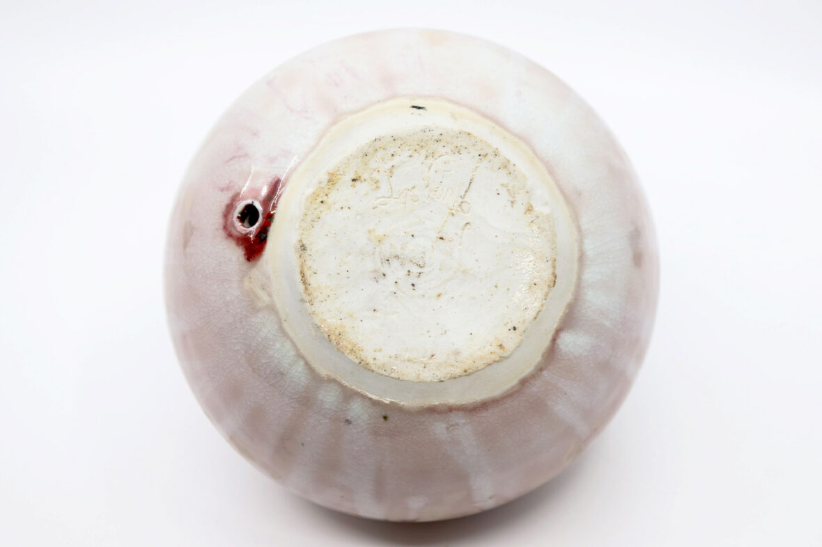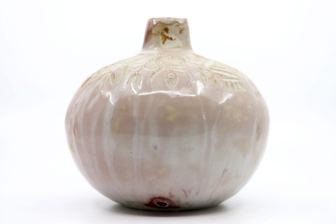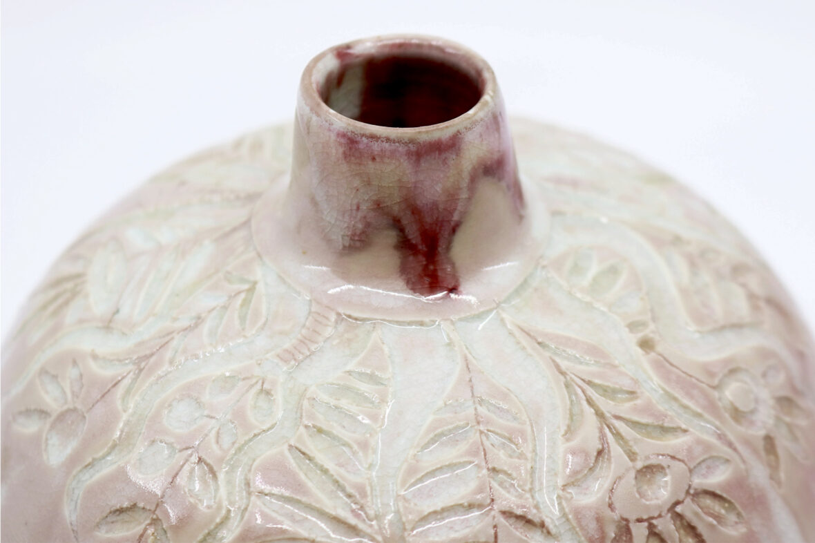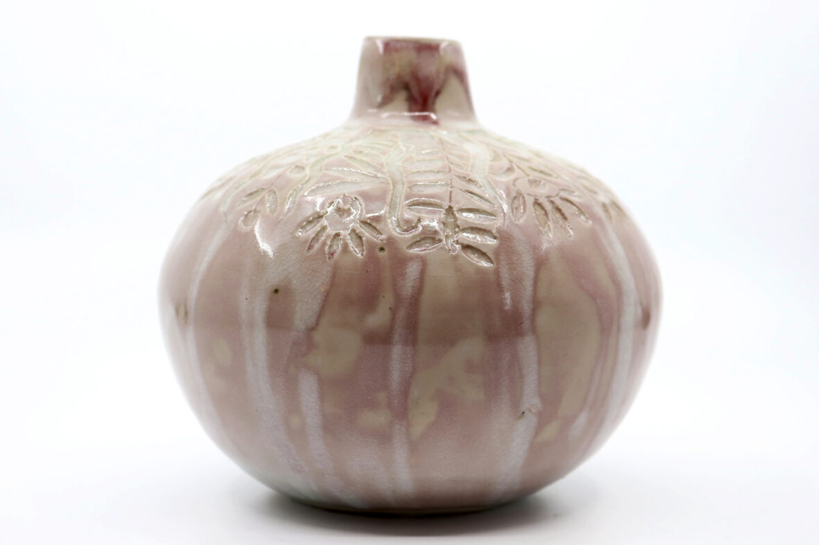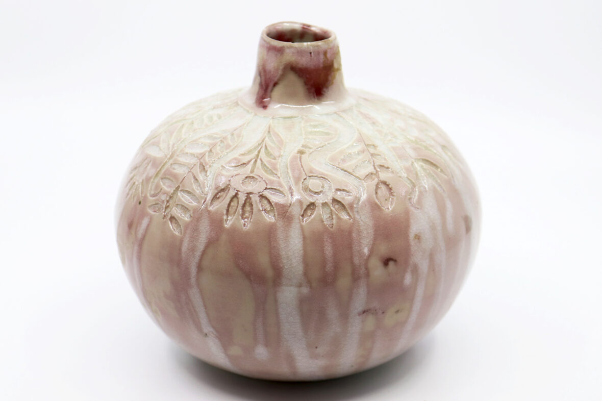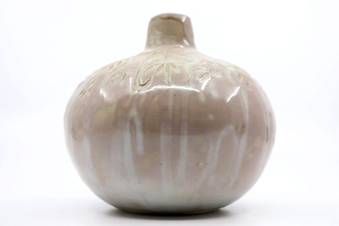 Petit vase en grès émaillé à couverte nuancée beige rosé et décor gravé de motifs floraux stylisés.