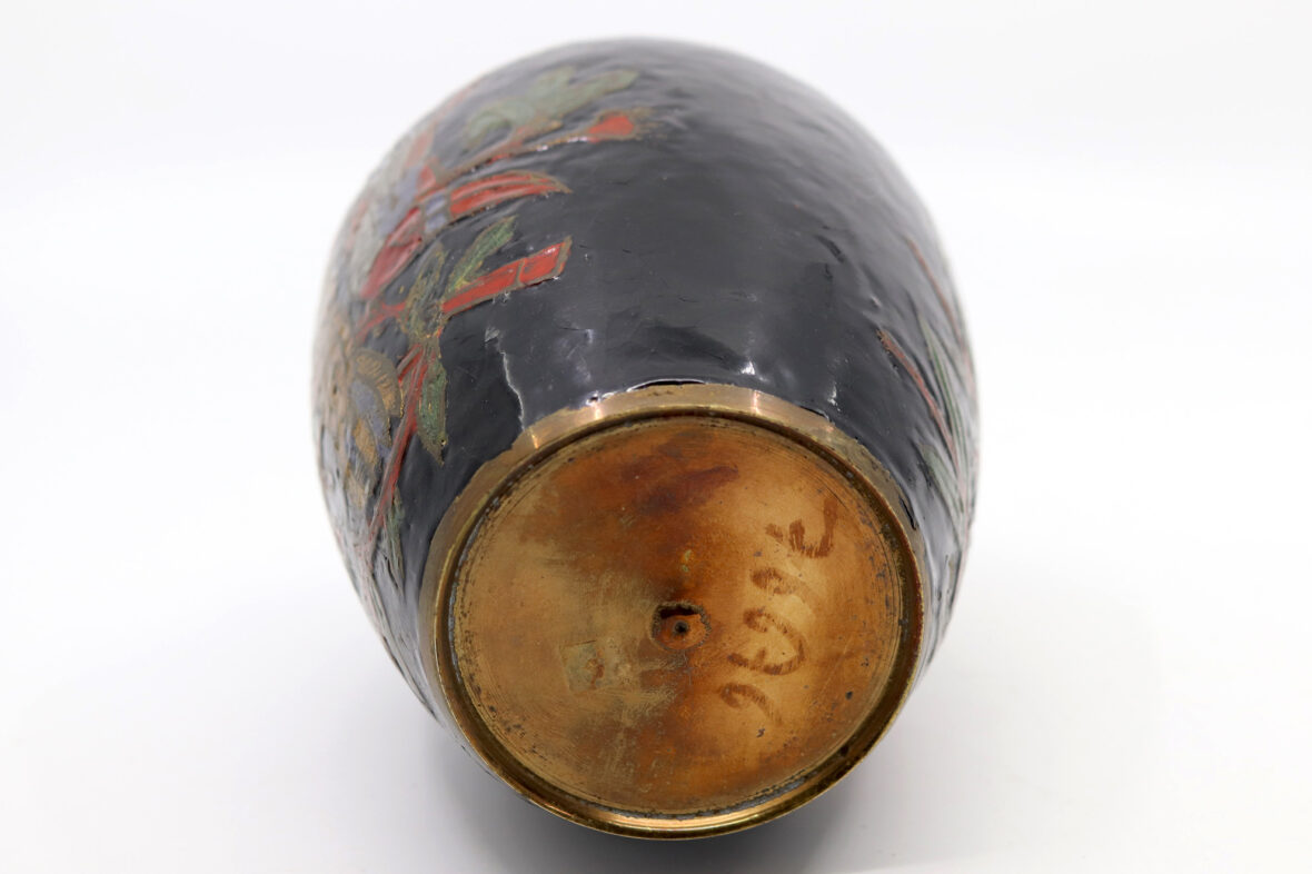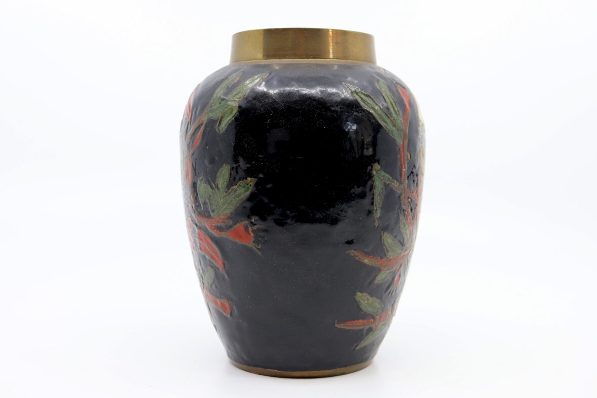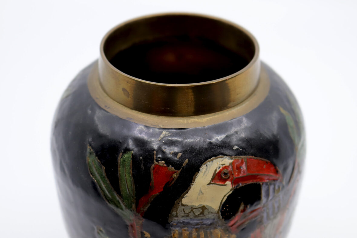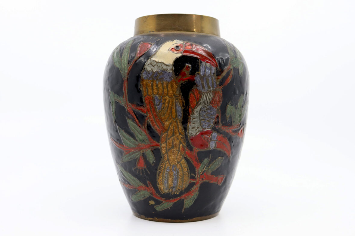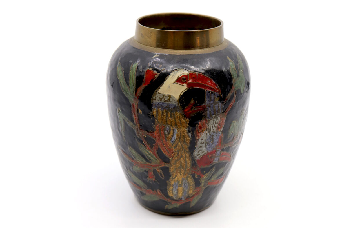 Petit vase en métal émaillé cloisonné à décor polychrome d’un toucan branché.