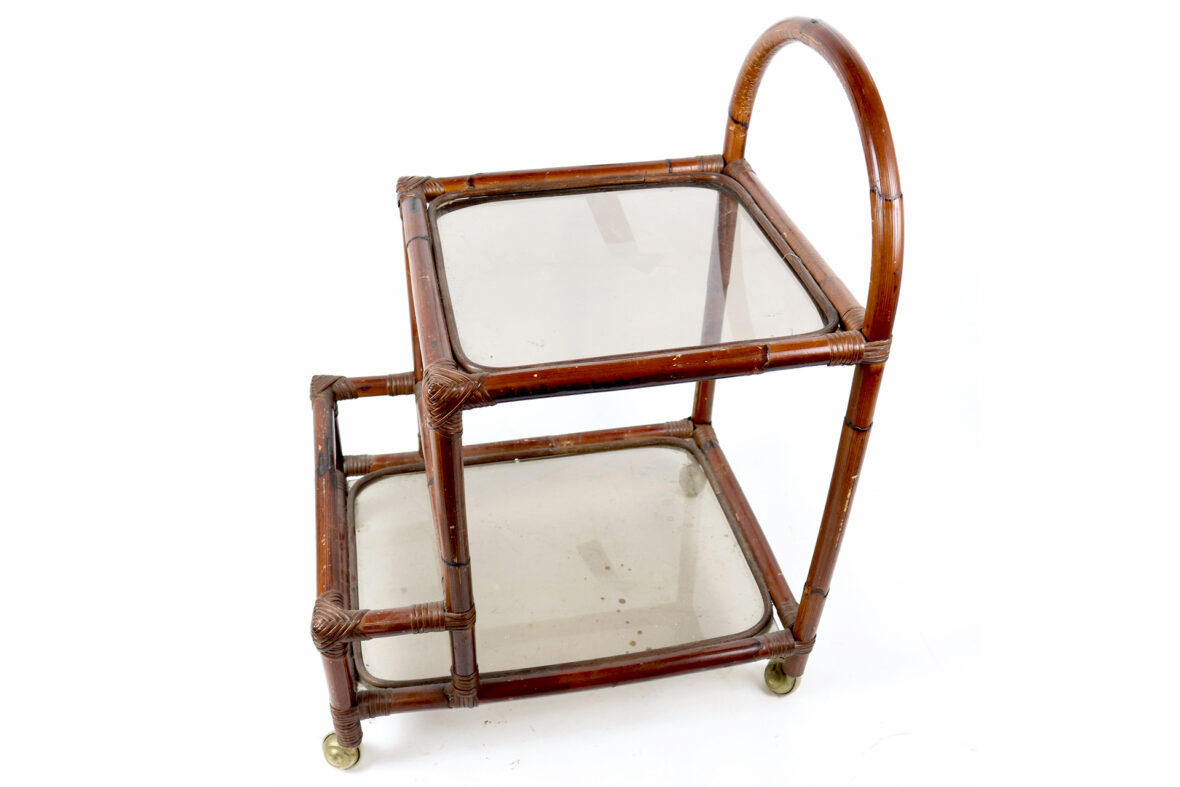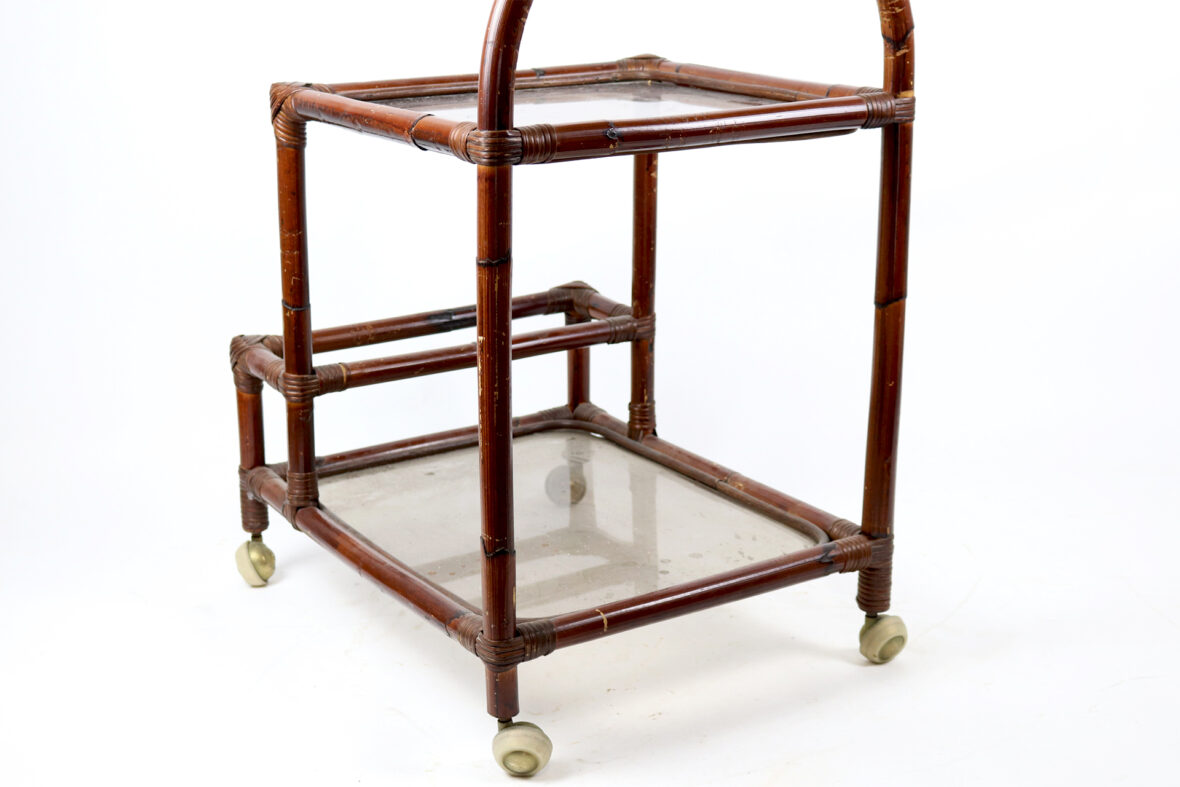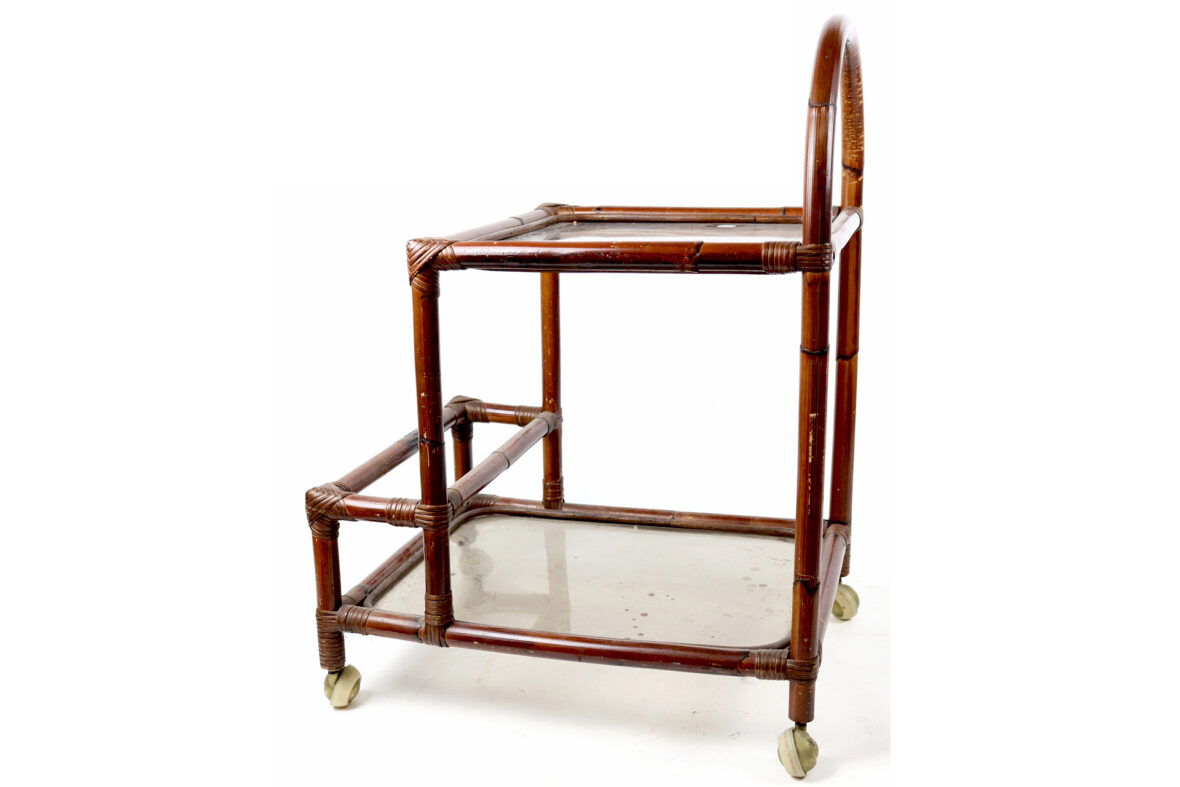 Petite desserte en rotin à deux plateaux en verre et un compartiment range-bouteilles. Repose sur quatre roulettes.