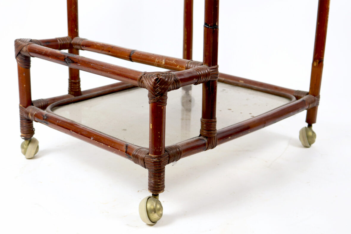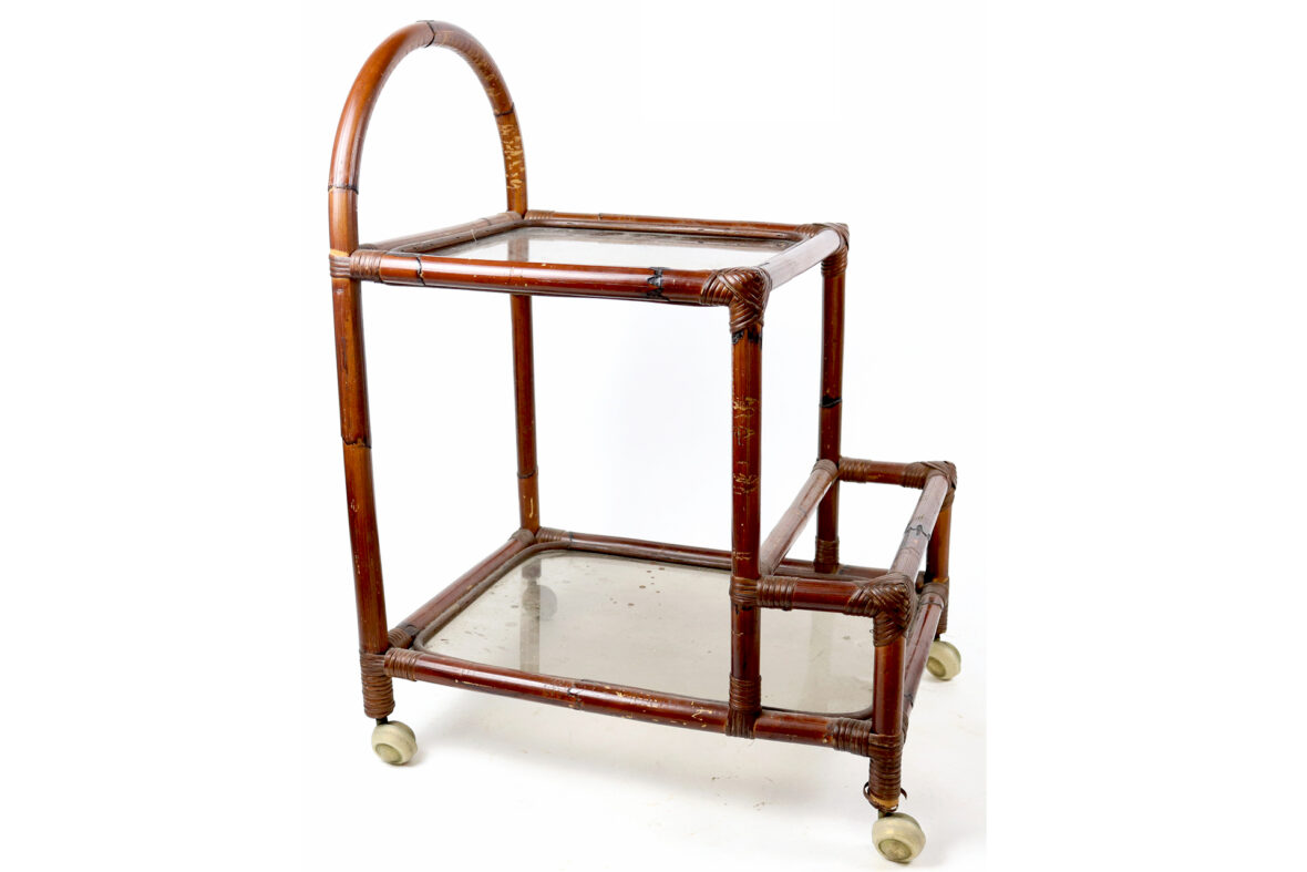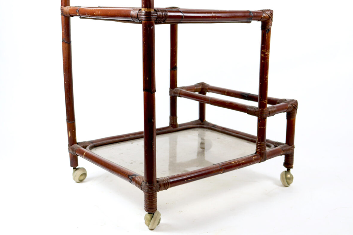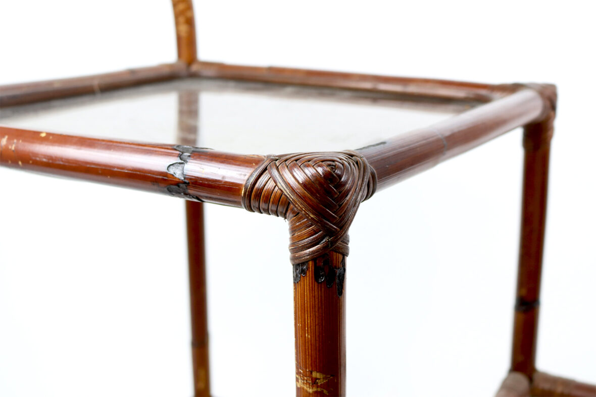 Petite desserte en rotin à deux plateaux en verre et un compartiment range-bouteilles. Repose sur quatre roulettes.