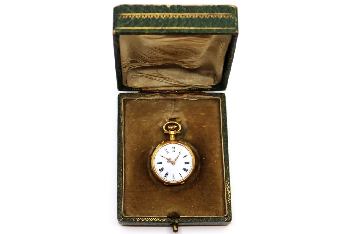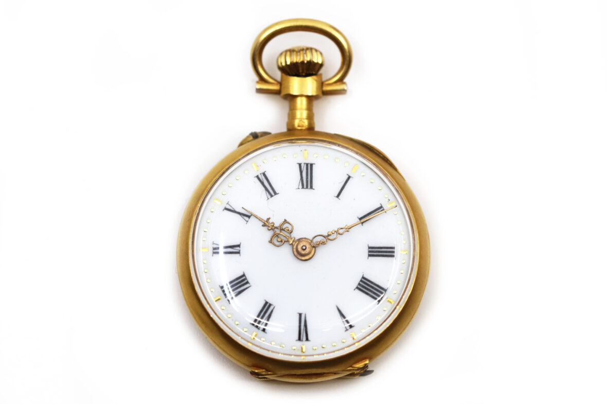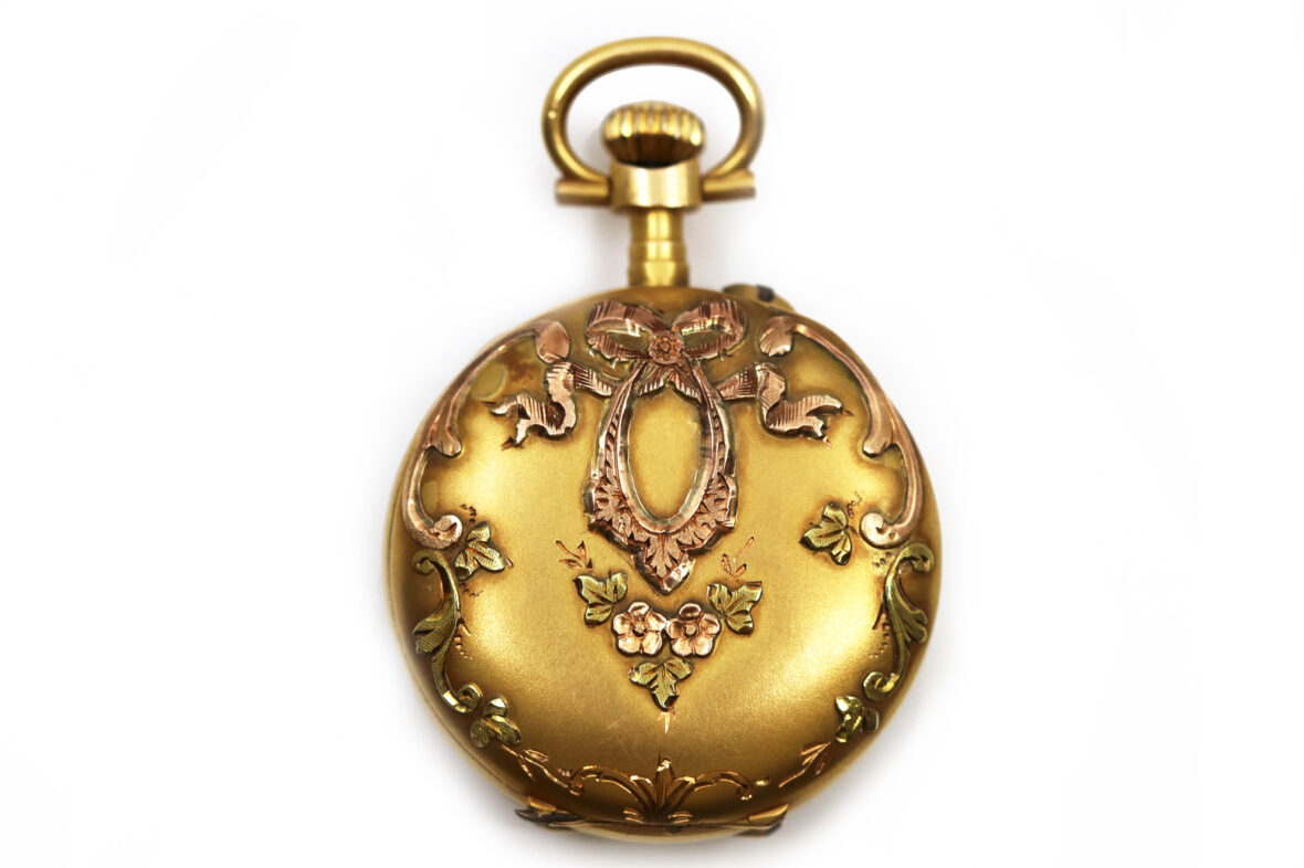 Petite montre de col en or à décor de ruban, rinceaux feuillagés et fleurettes. Double cuvette en or. Cadran émaillé blanc à chiffres romains.