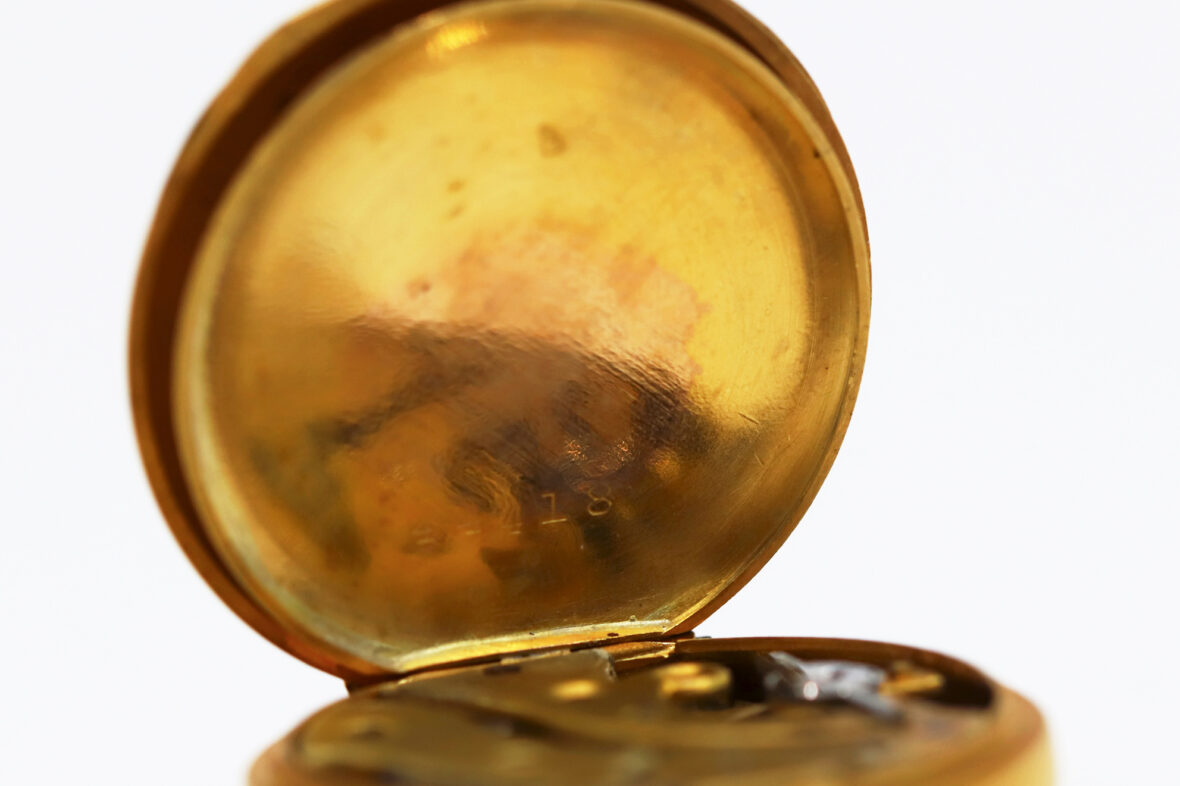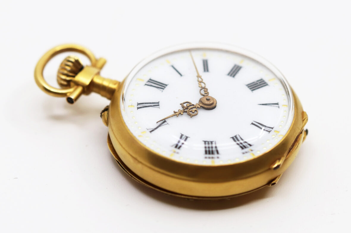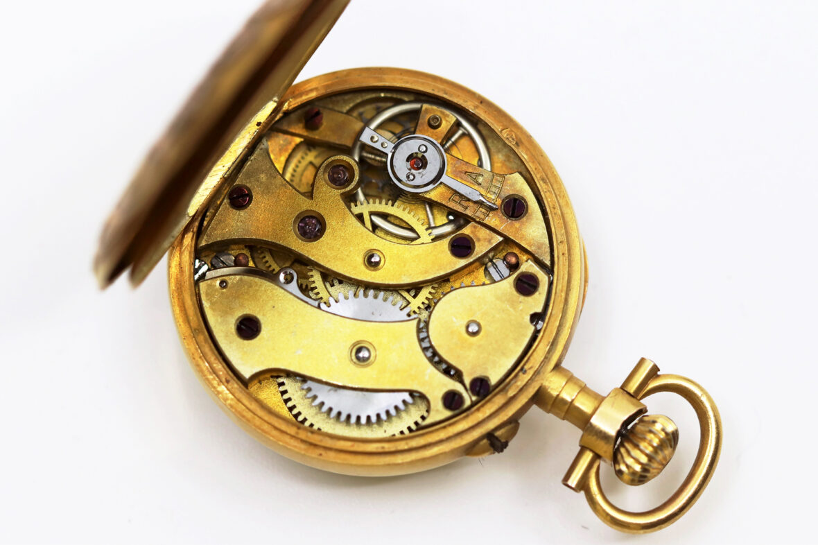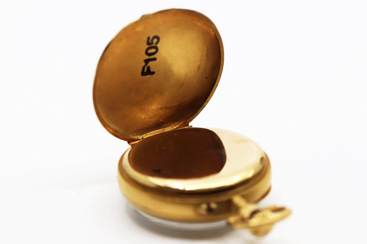 Petite montre de col en or à décor de ruban, rinceaux feuillagés et fleurettes. Double cuvette en or. Cadran émaillé blanc à chiffres romains.
