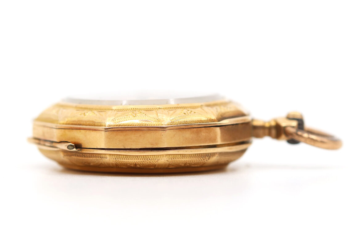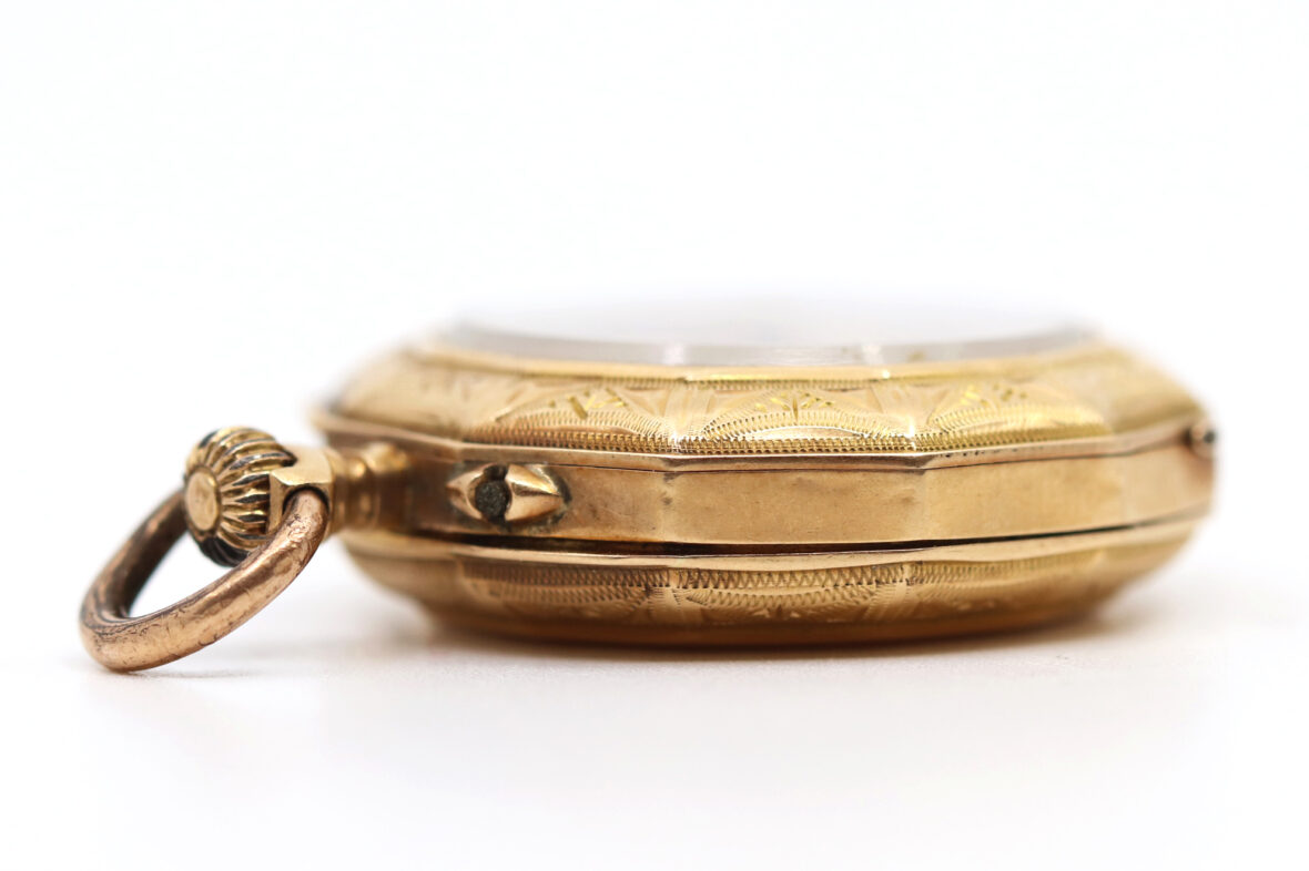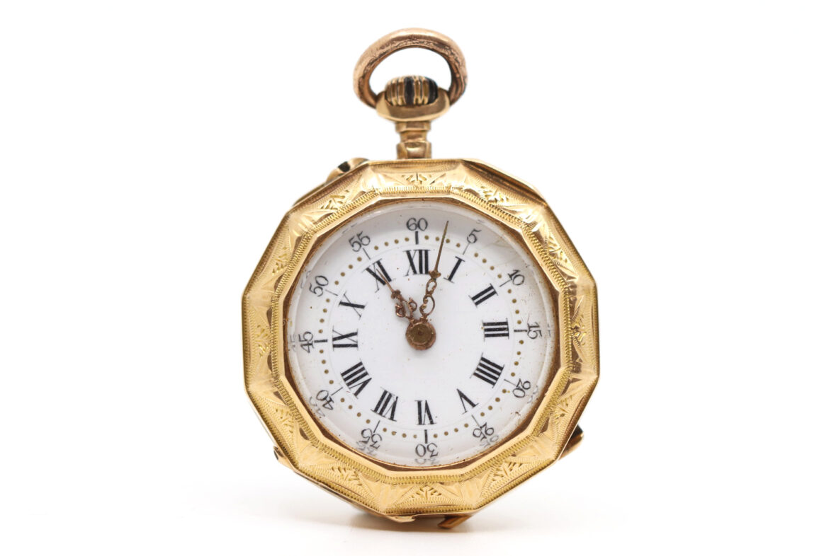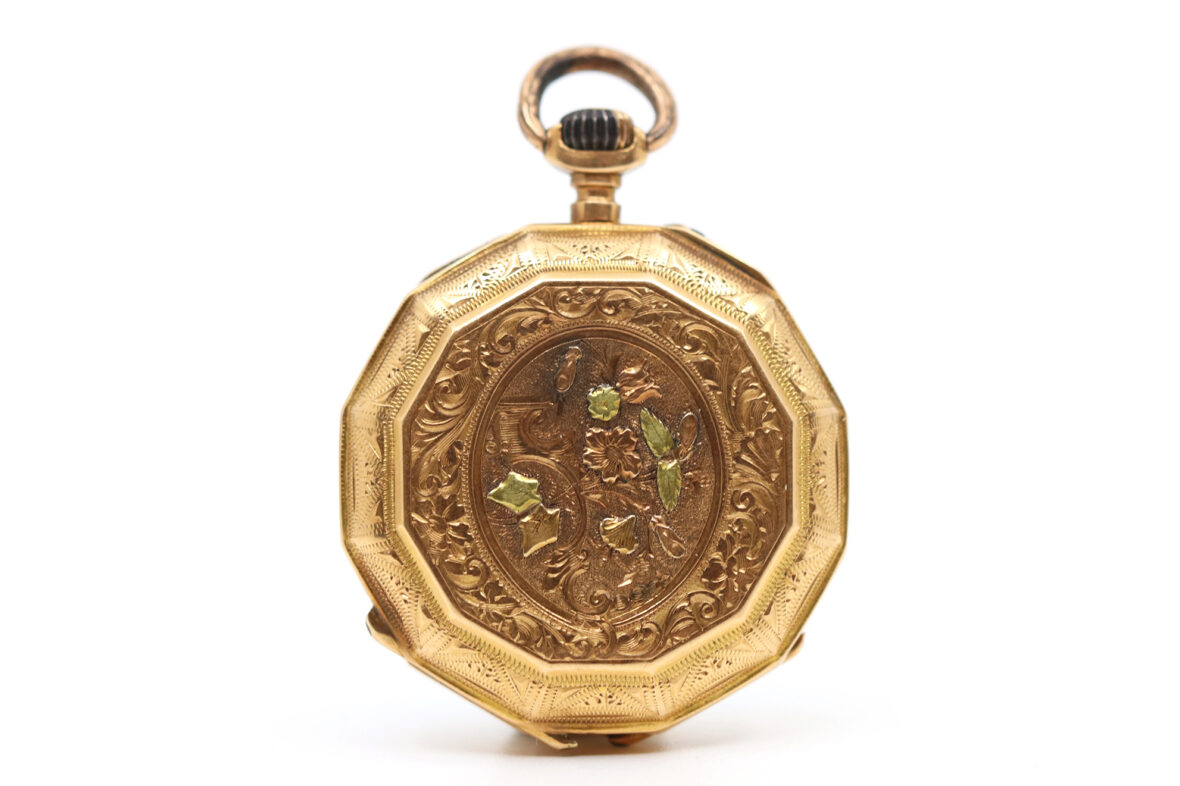 Petite montre de gousset en or jaune facetté à décor ciselé de guirlande feuillagée….