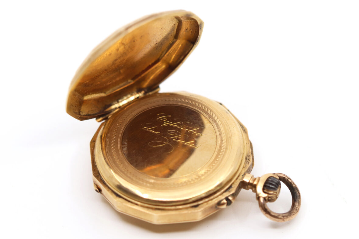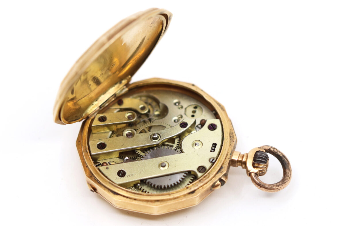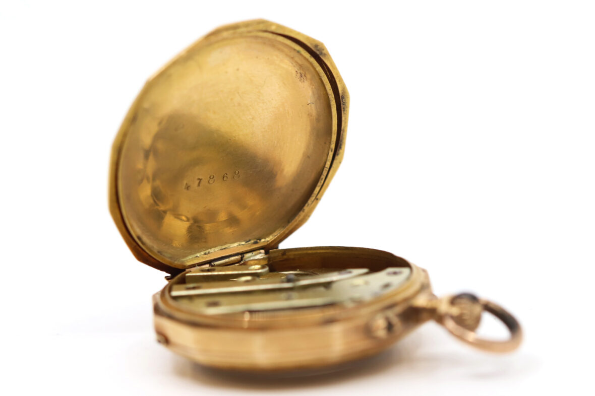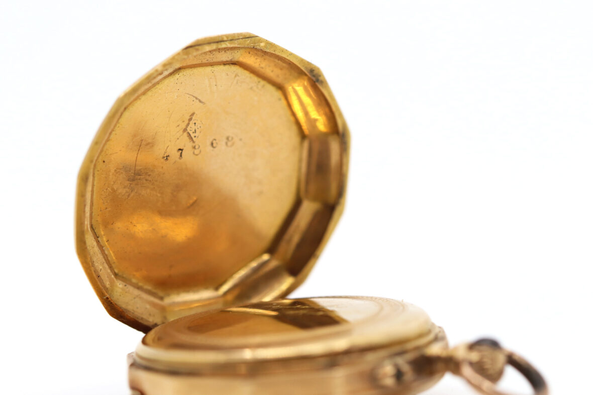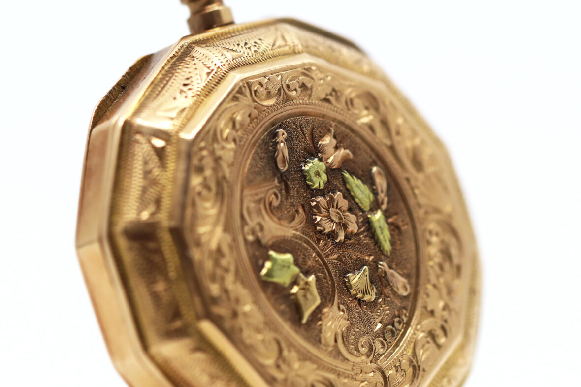 Petite montre de gousset en or jaune facetté à décor ciselé de guirlande feuillagée….