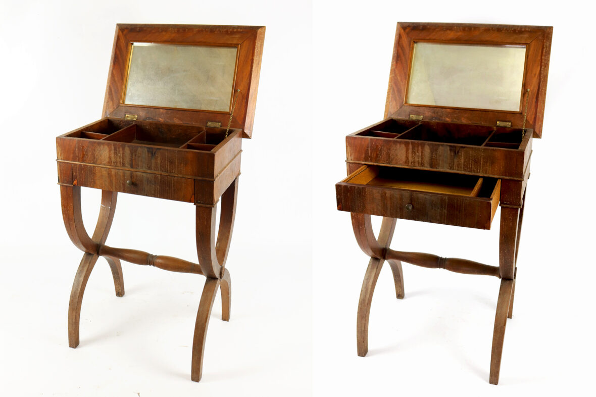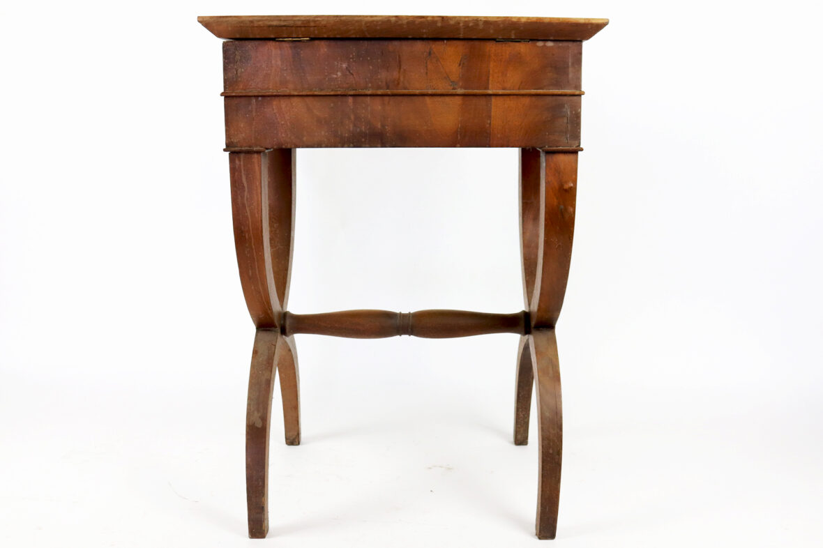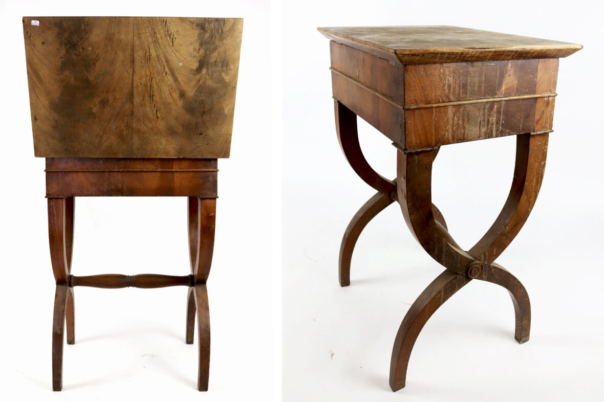 Petite travailleuse en bois de placage, l’abattant découvrant casiers et miroir, ouvrant à un tiroir à compartiments en ceinture. Piètement curule.