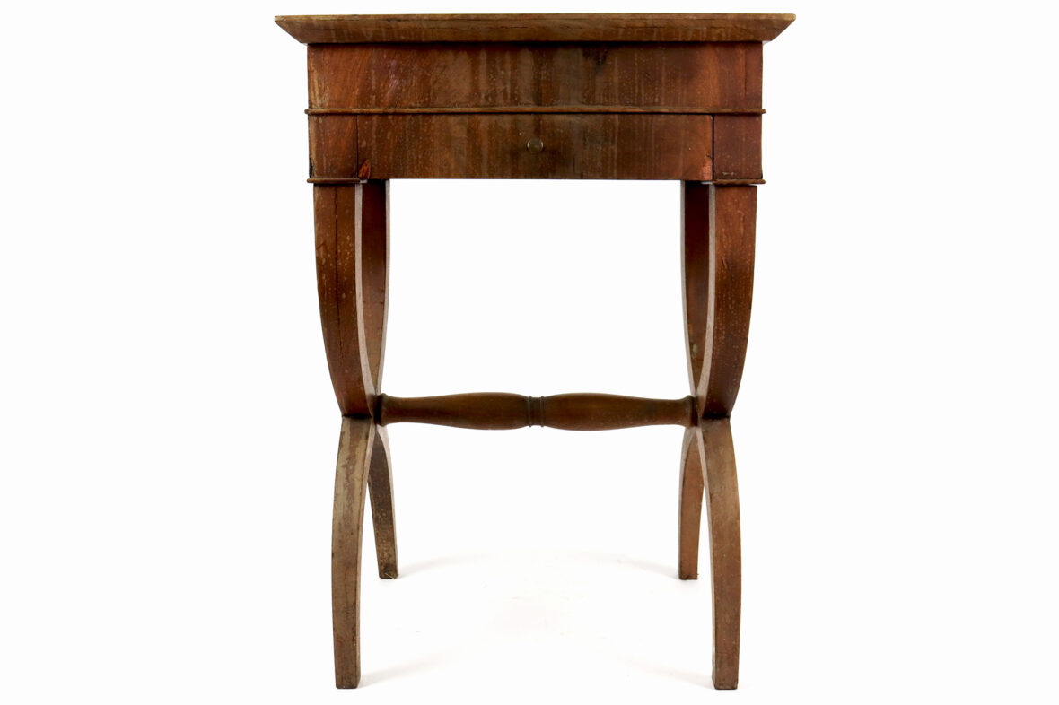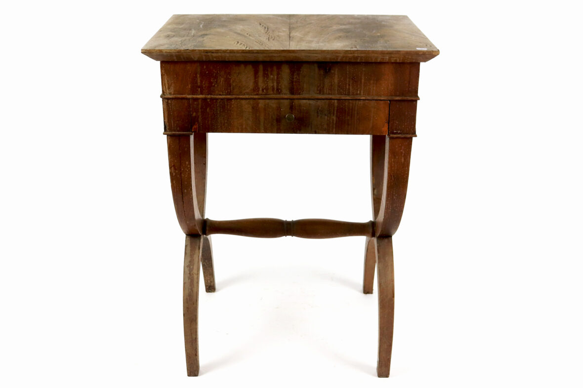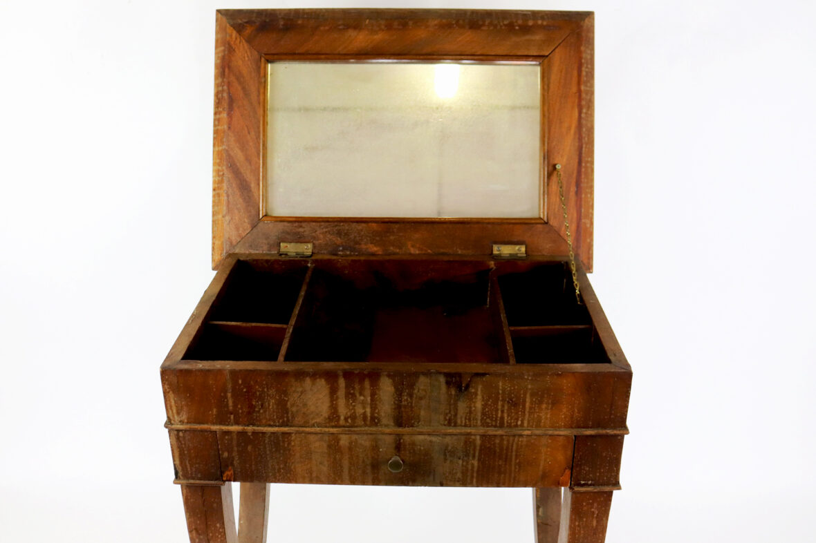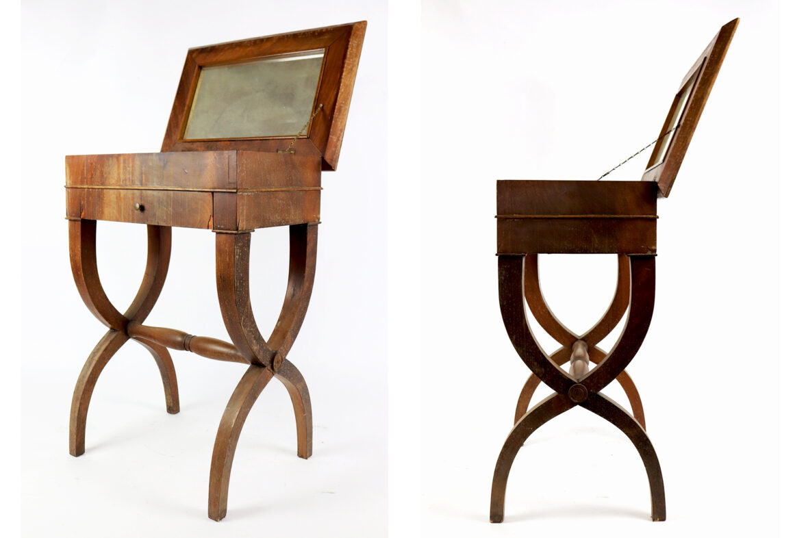 Petite travailleuse en bois de placage, l’abattant découvrant casiers et miroir, ouvrant à un tiroir à compartiments en ceinture. Piètement curule.