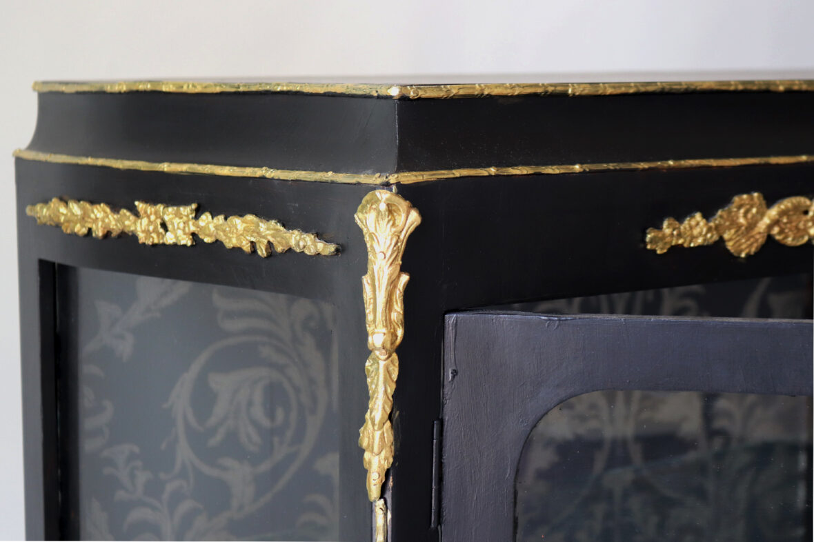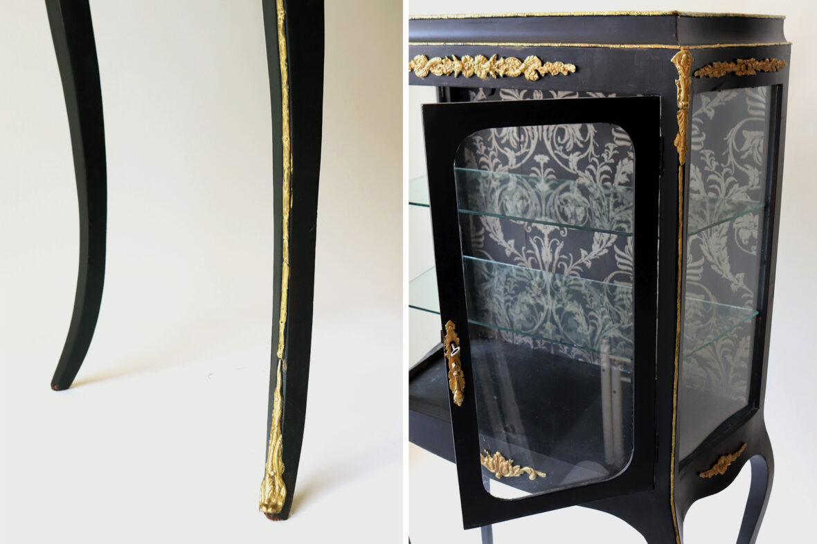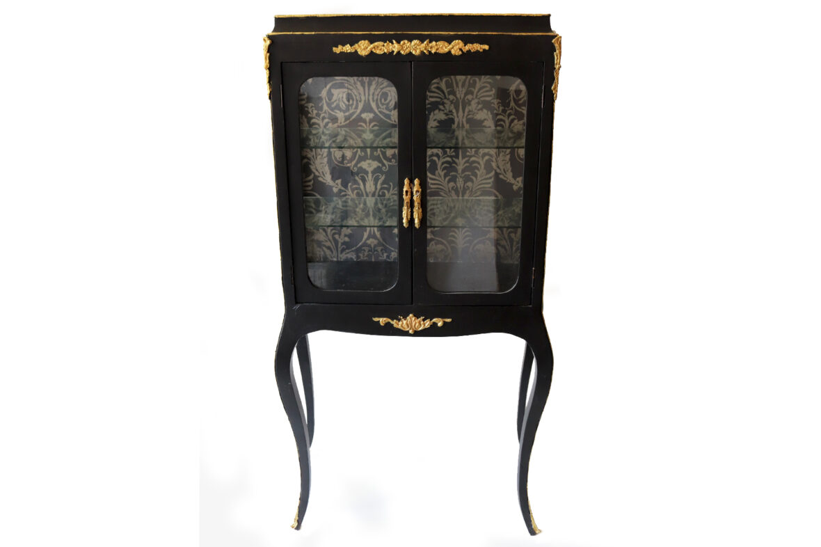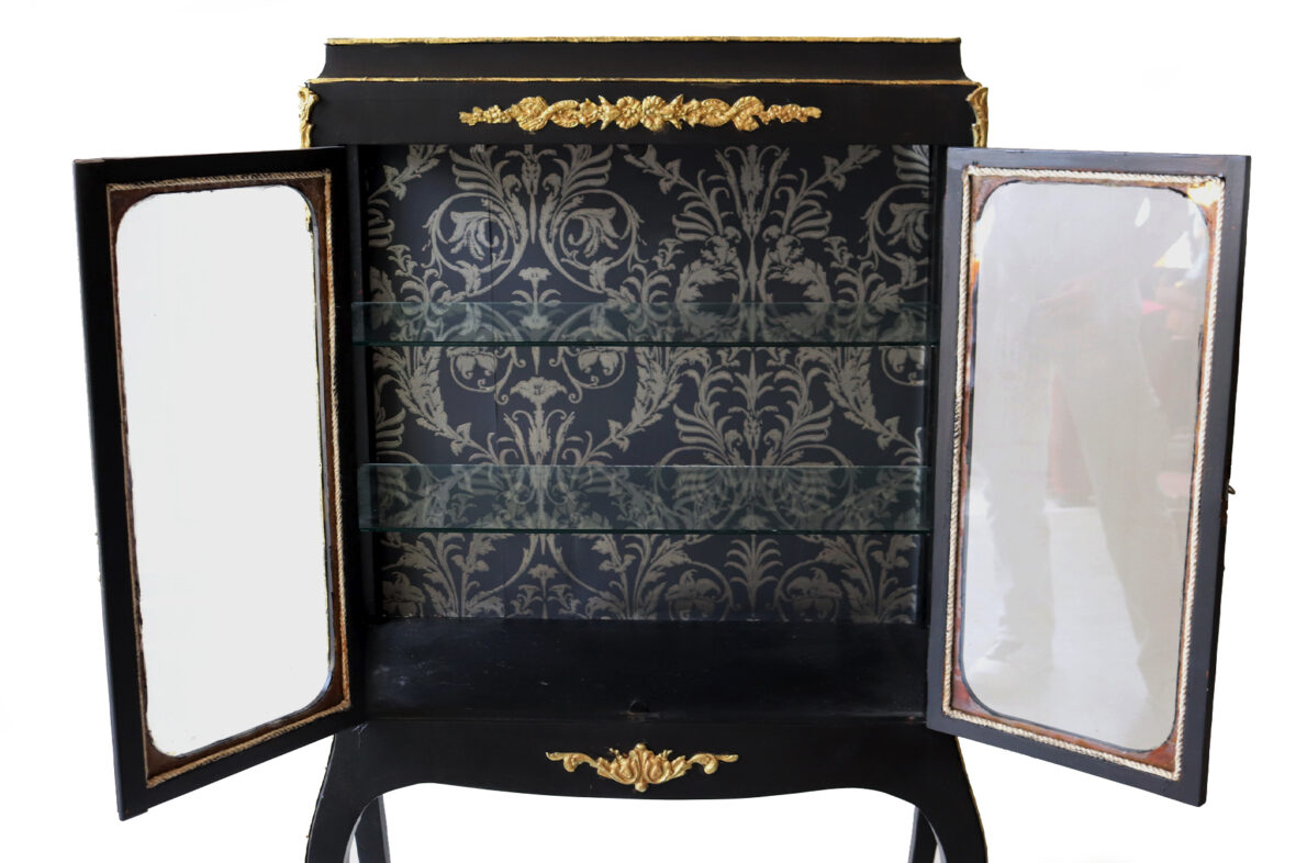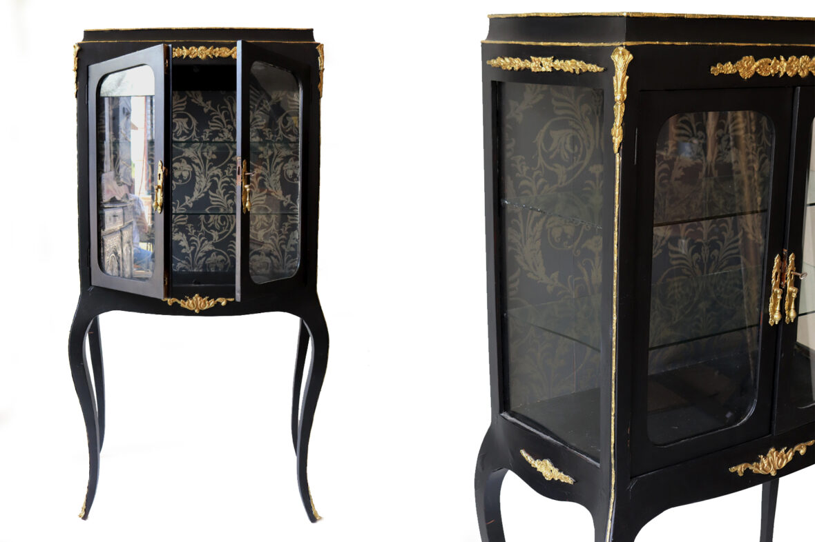 Petite vitrine de forme galbée en bois noirci ouvrant par deux portes vitrées en façade. Les parois latérales vitrées. Piètement cambré. Garniture de bronze doré. Fin du XIXe.