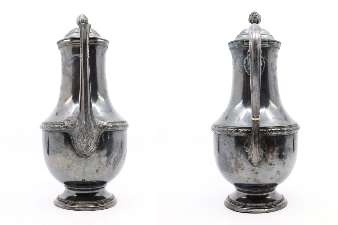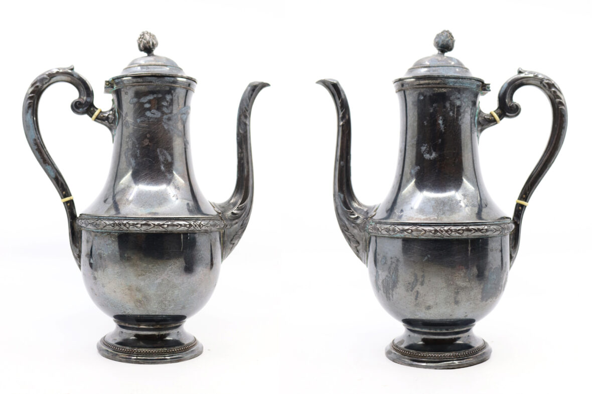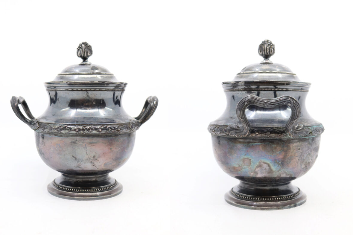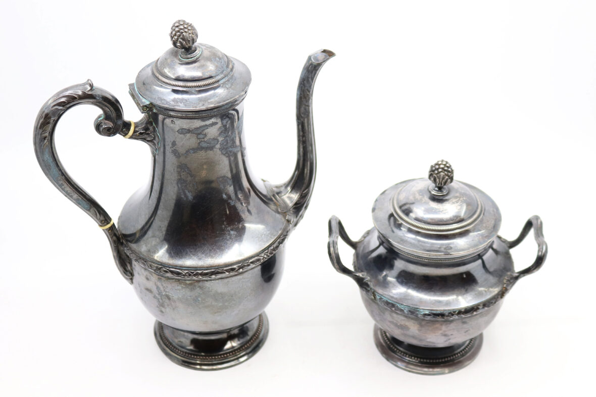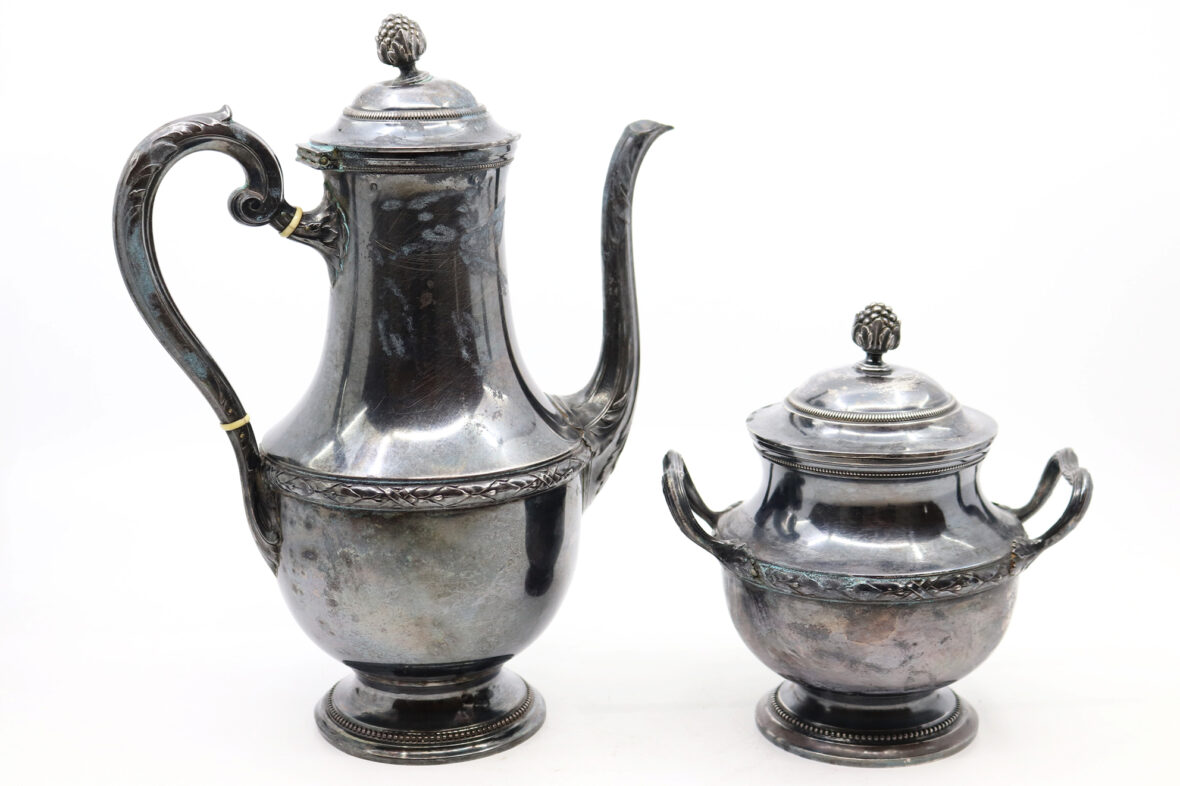 Partie de service à thé en argent comprenant une théière et un sucrier sur piédouche à décor de style Louis XVI composé de frises de laurier, de perles et de godrons. Le frétel figurant une pomme de pin.