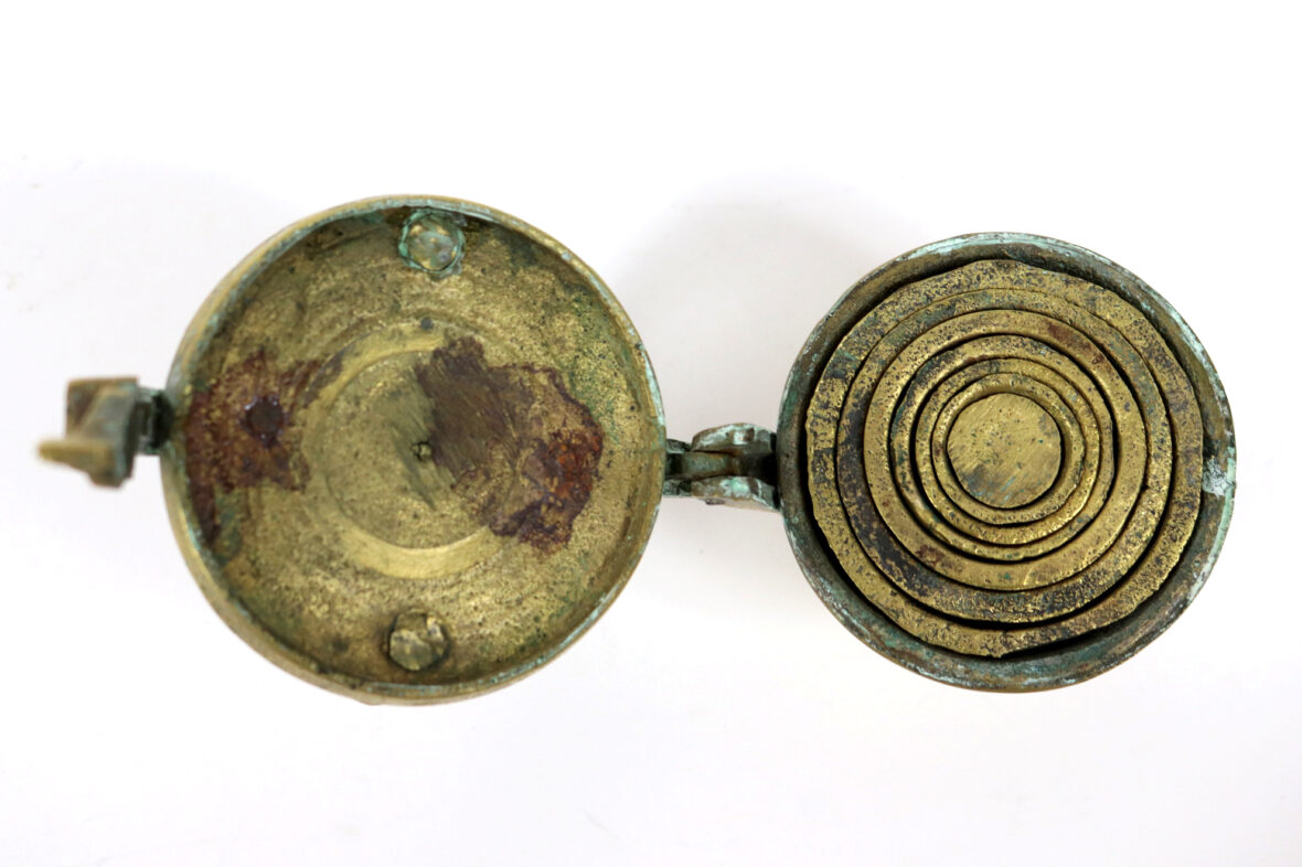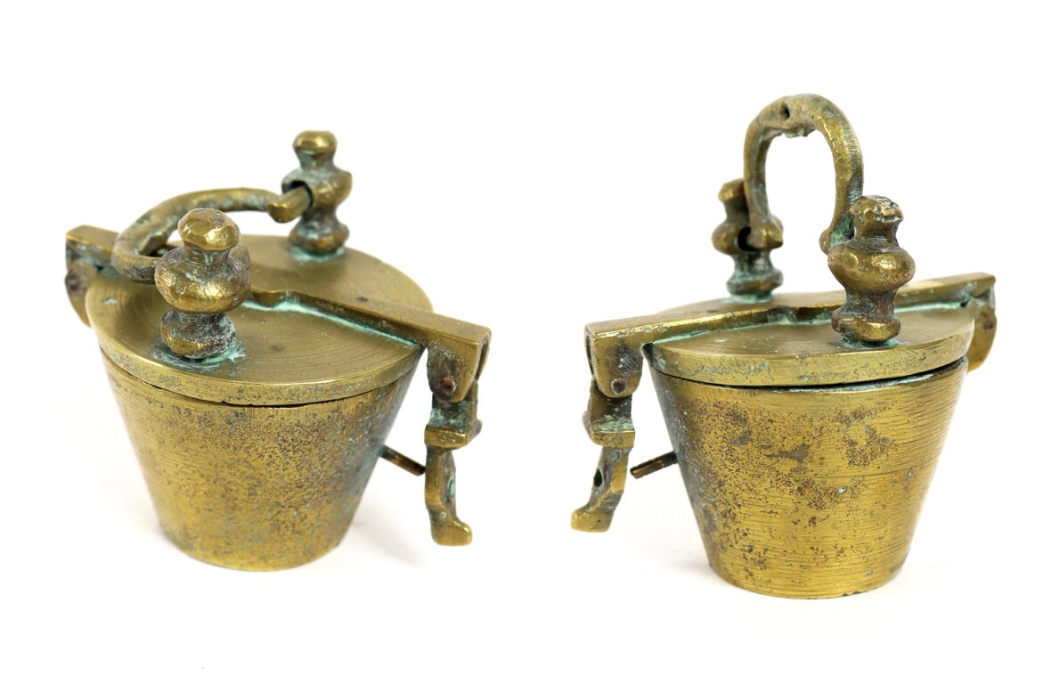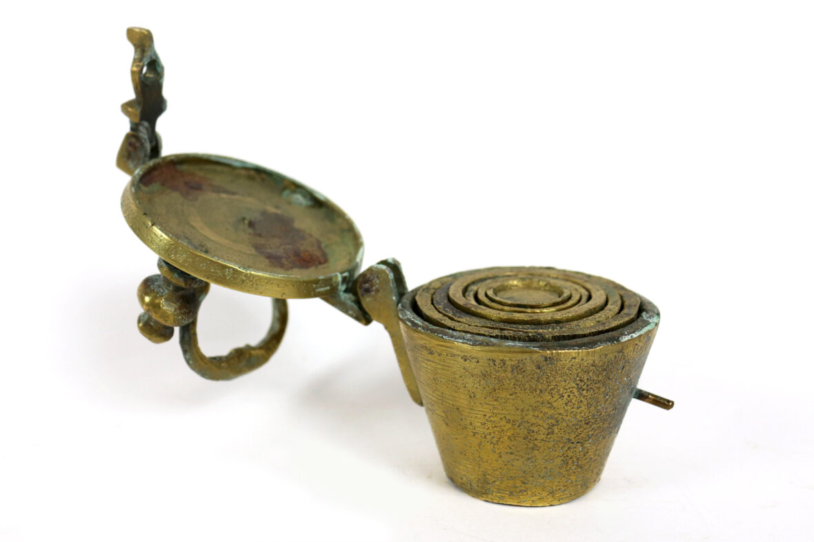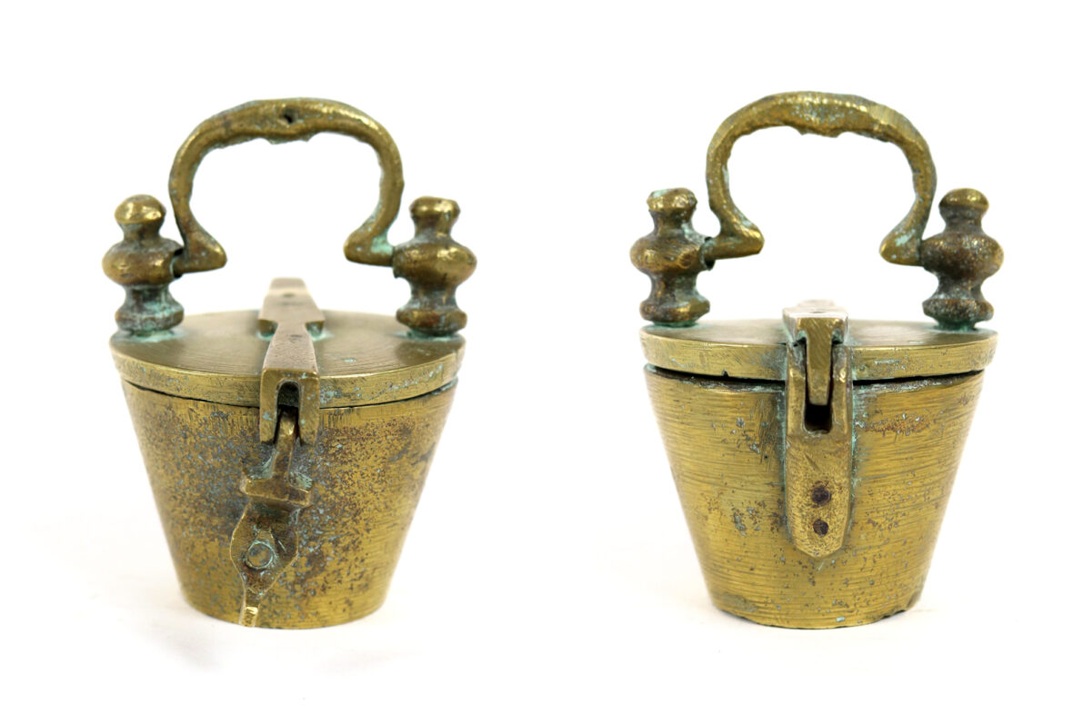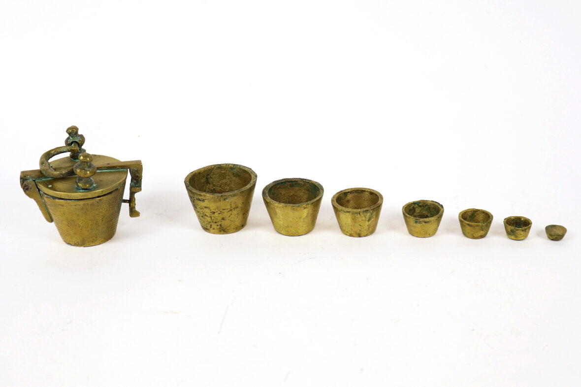 Pile de poids dite de Nuremberg en bronze. Le couvercle muni d’une prise de transport fermant par un moraillon. Sept mesures.