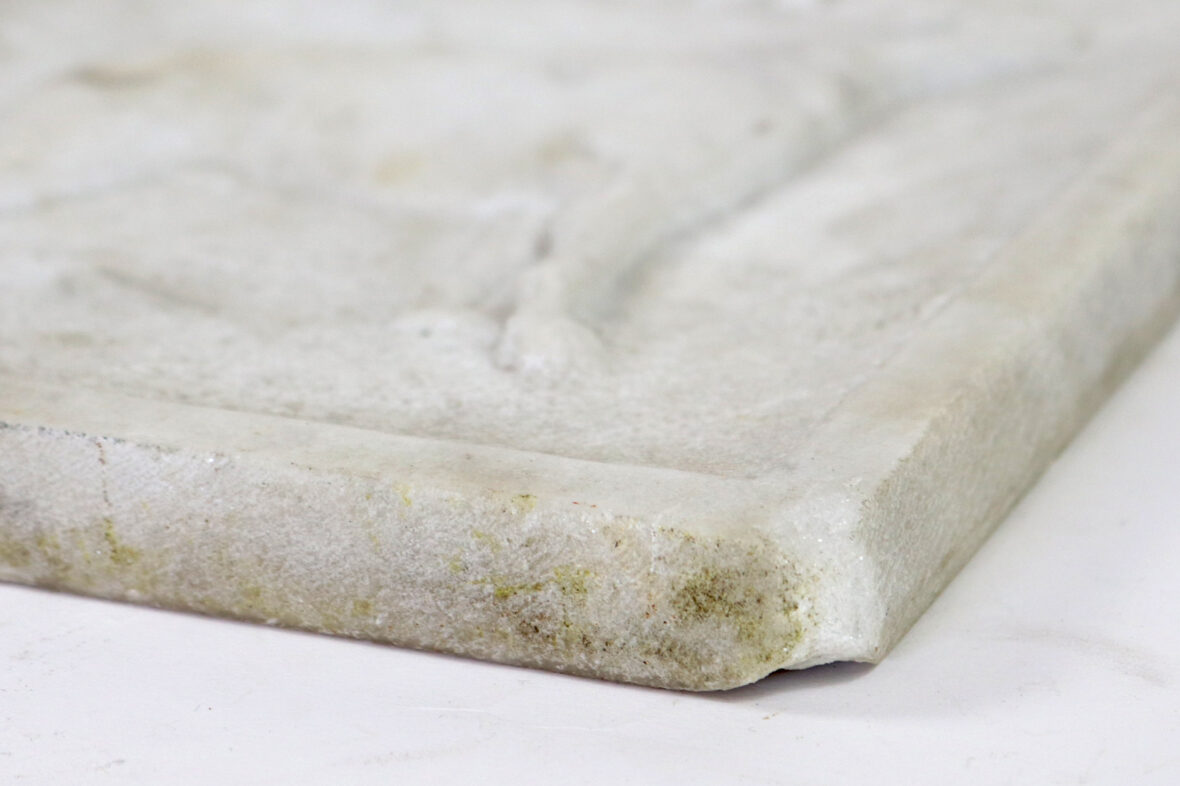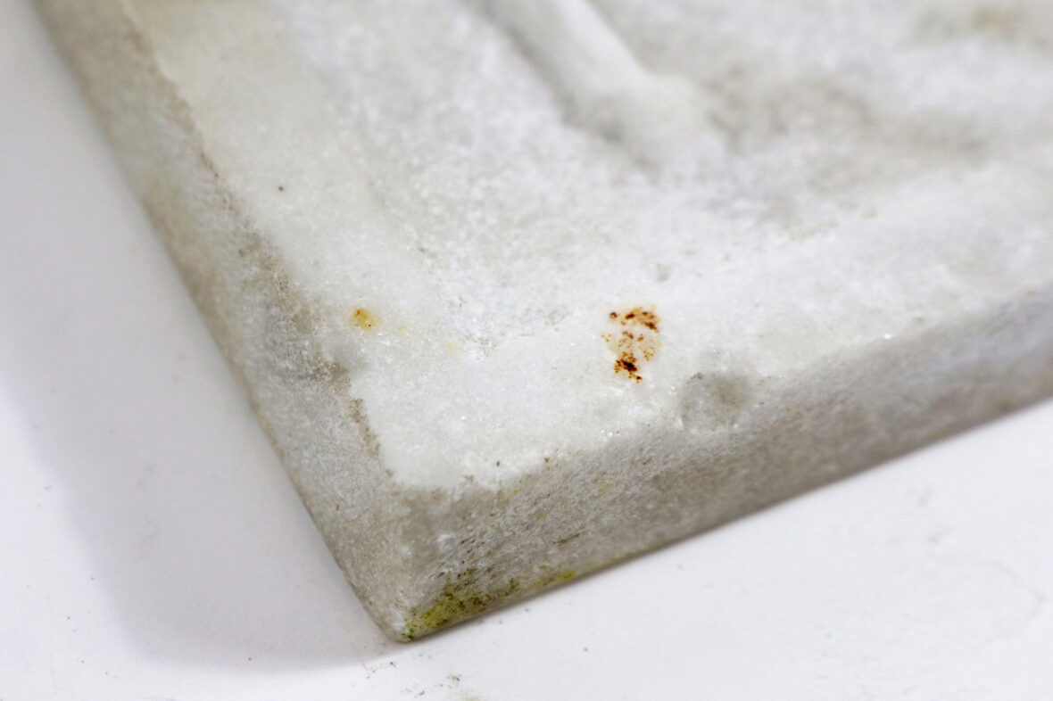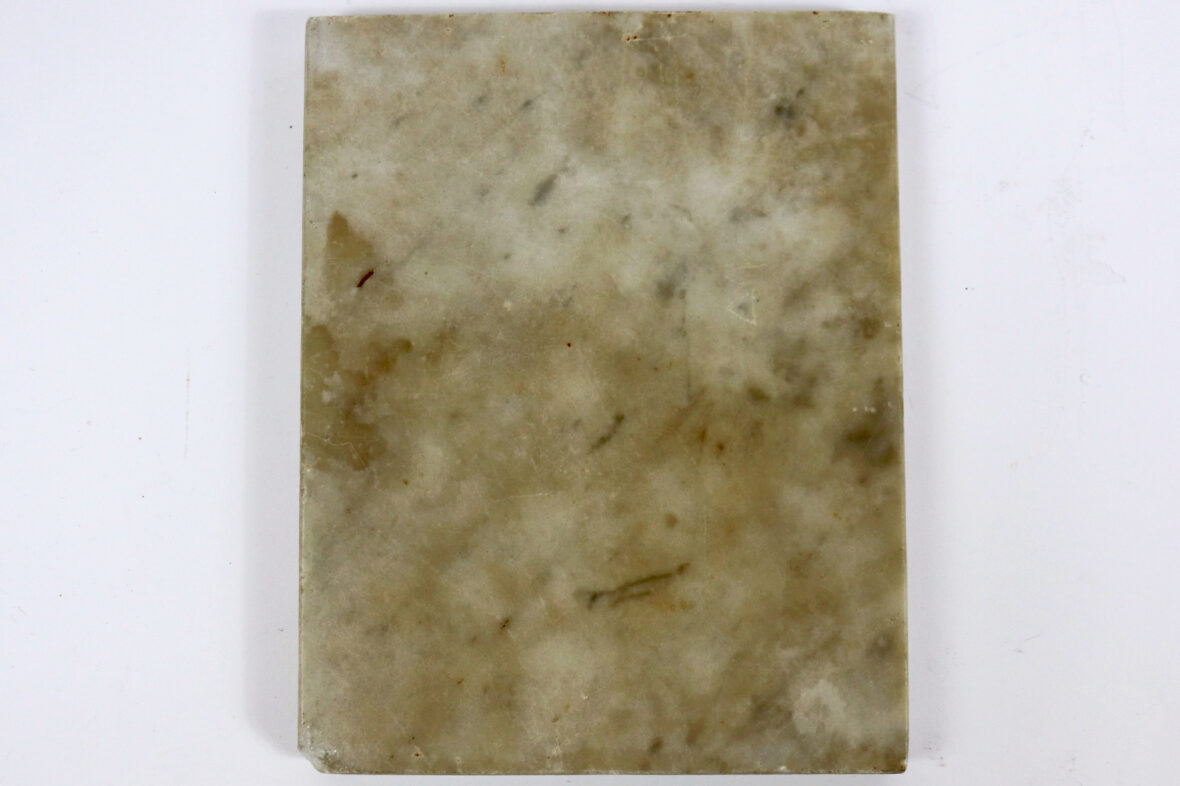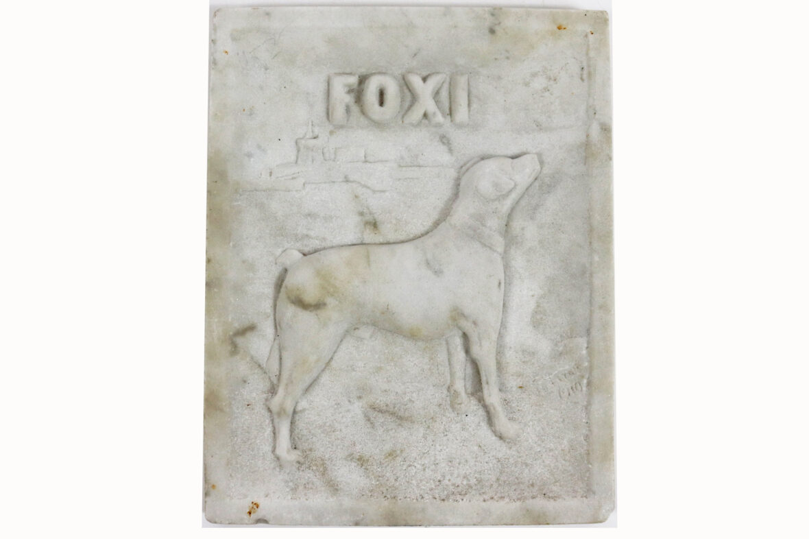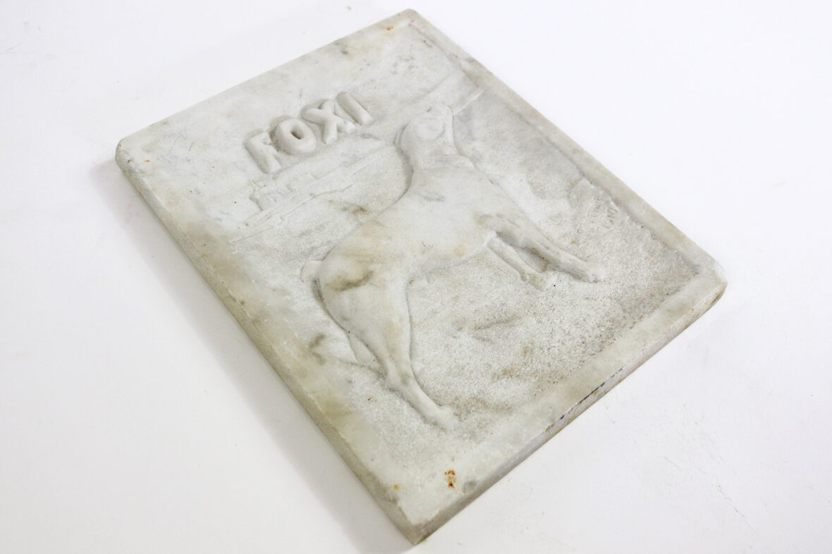 Plaque d’albâtre sculpté en bas relief à décor d’un chien, titrée en haut au centre « FOXI ». Signé et daté 1910 en bas à droite.