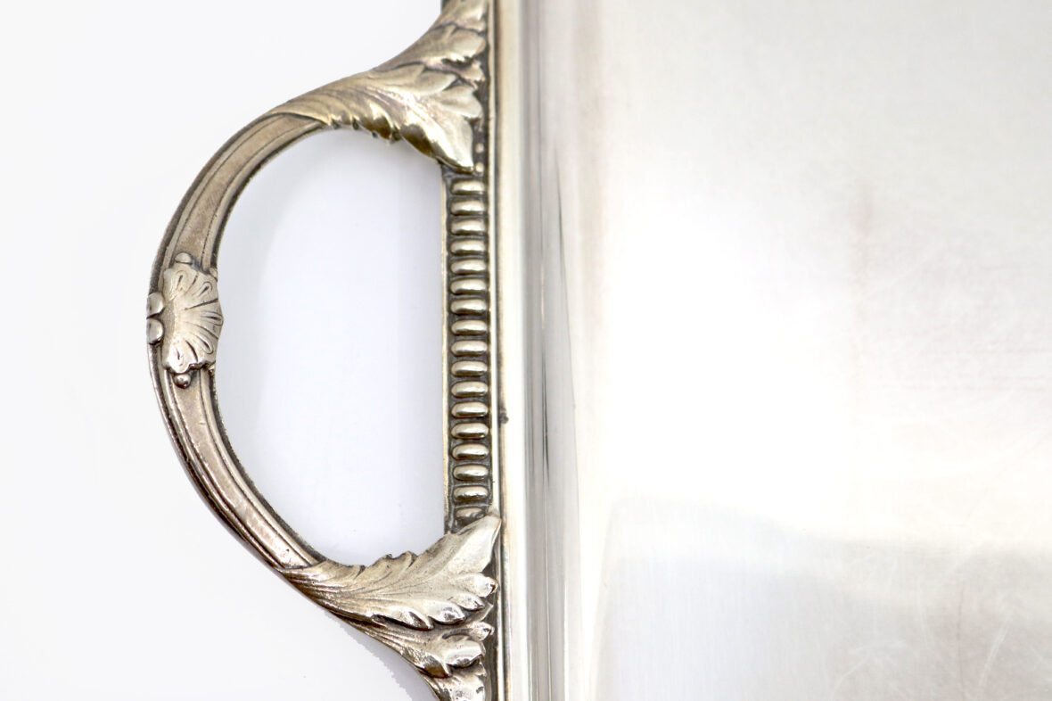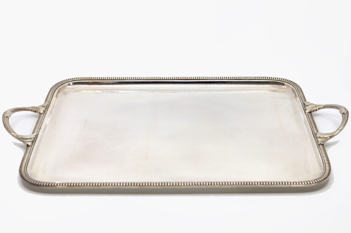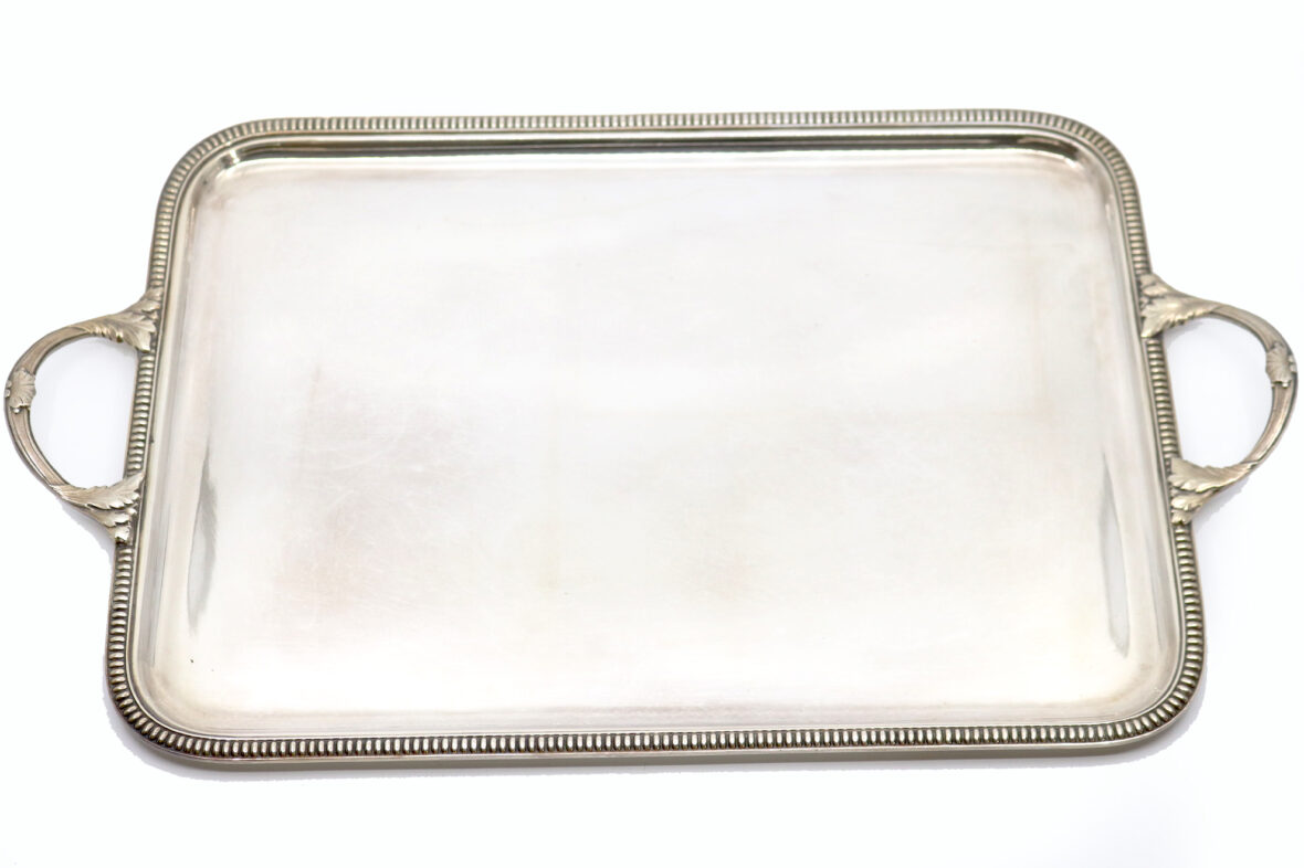 Plateau à deux anses rectangulaire en métal argenté à décor de godrons et feuillage.
