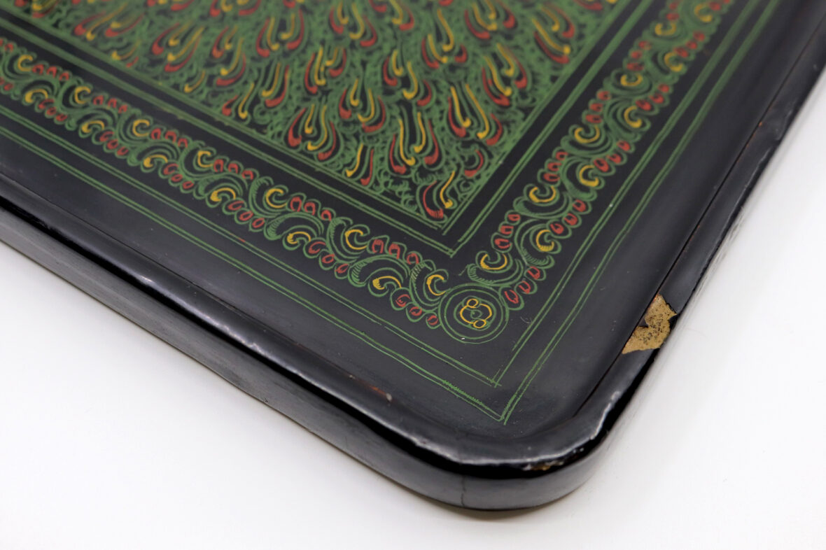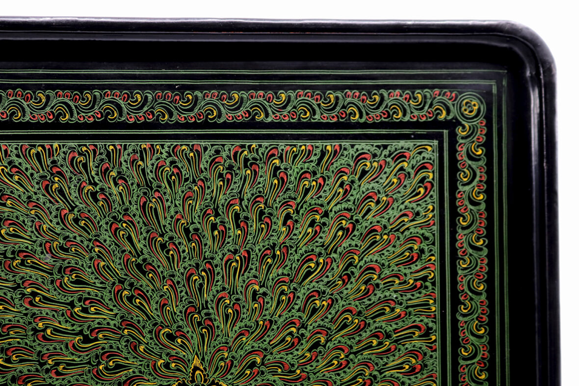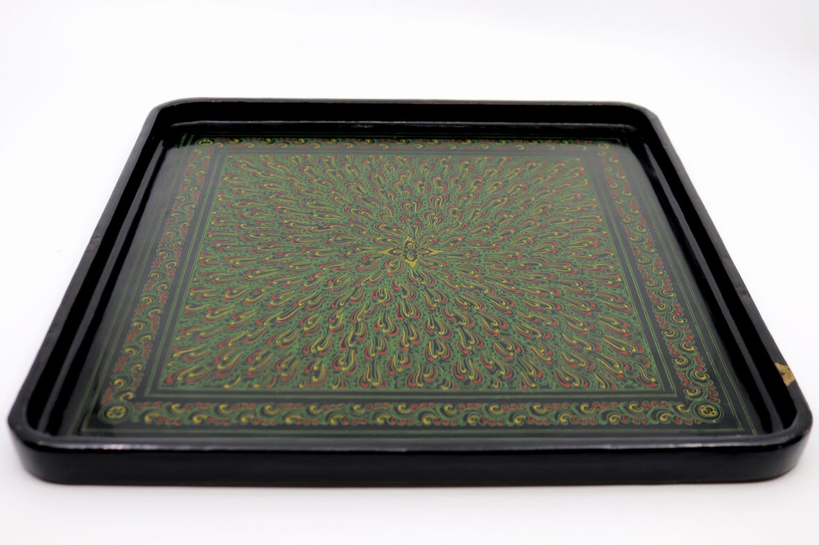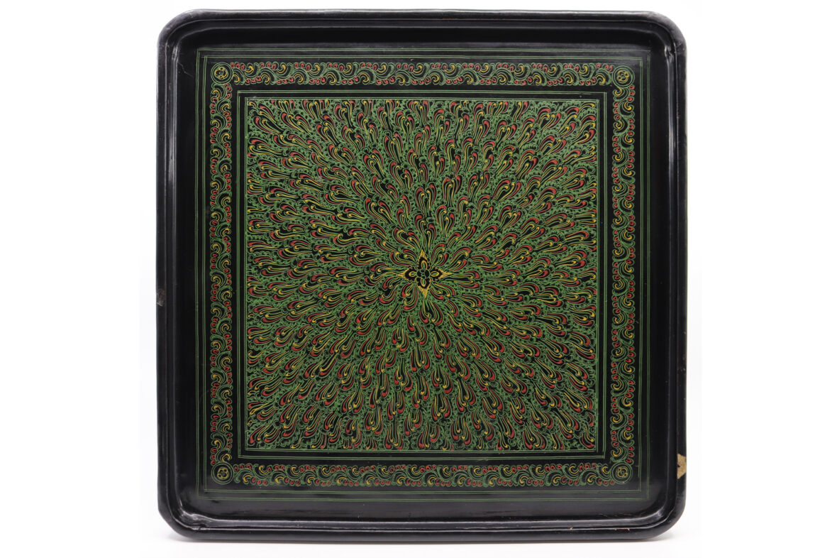 Plateau de forme carrée en bois laqué à motif « queue de paon » stylisé.