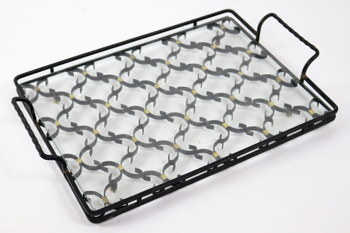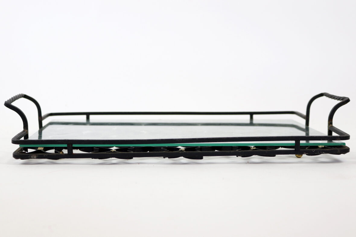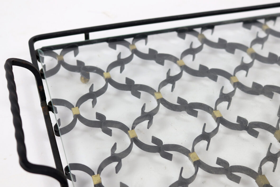 Plateau en fer forgé, attaches en métal doré et verre à décor d’enroulements.